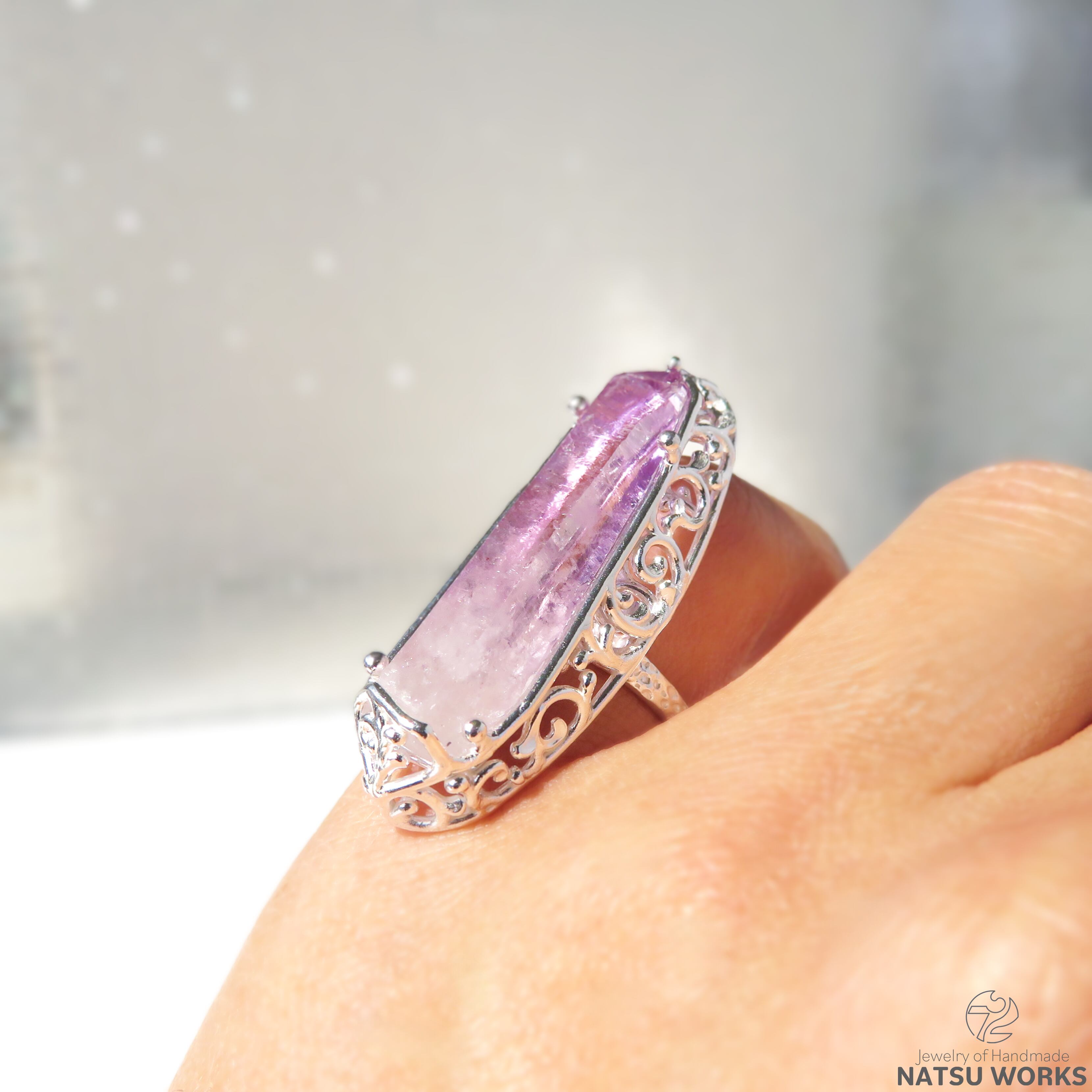 アメジストの原石を大胆にそのままセットして、まわりを唐草と透かし模様で飾りました。