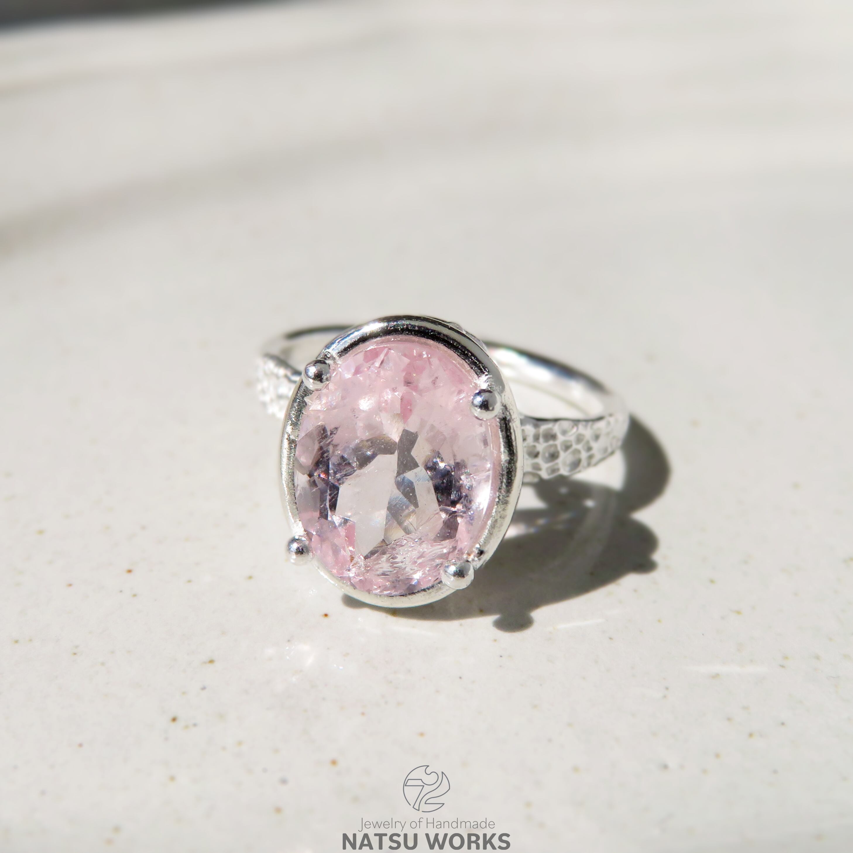 淡いピンク色をしたモルガナイトを、唐草と透かし模様の台座にセットしたリング。