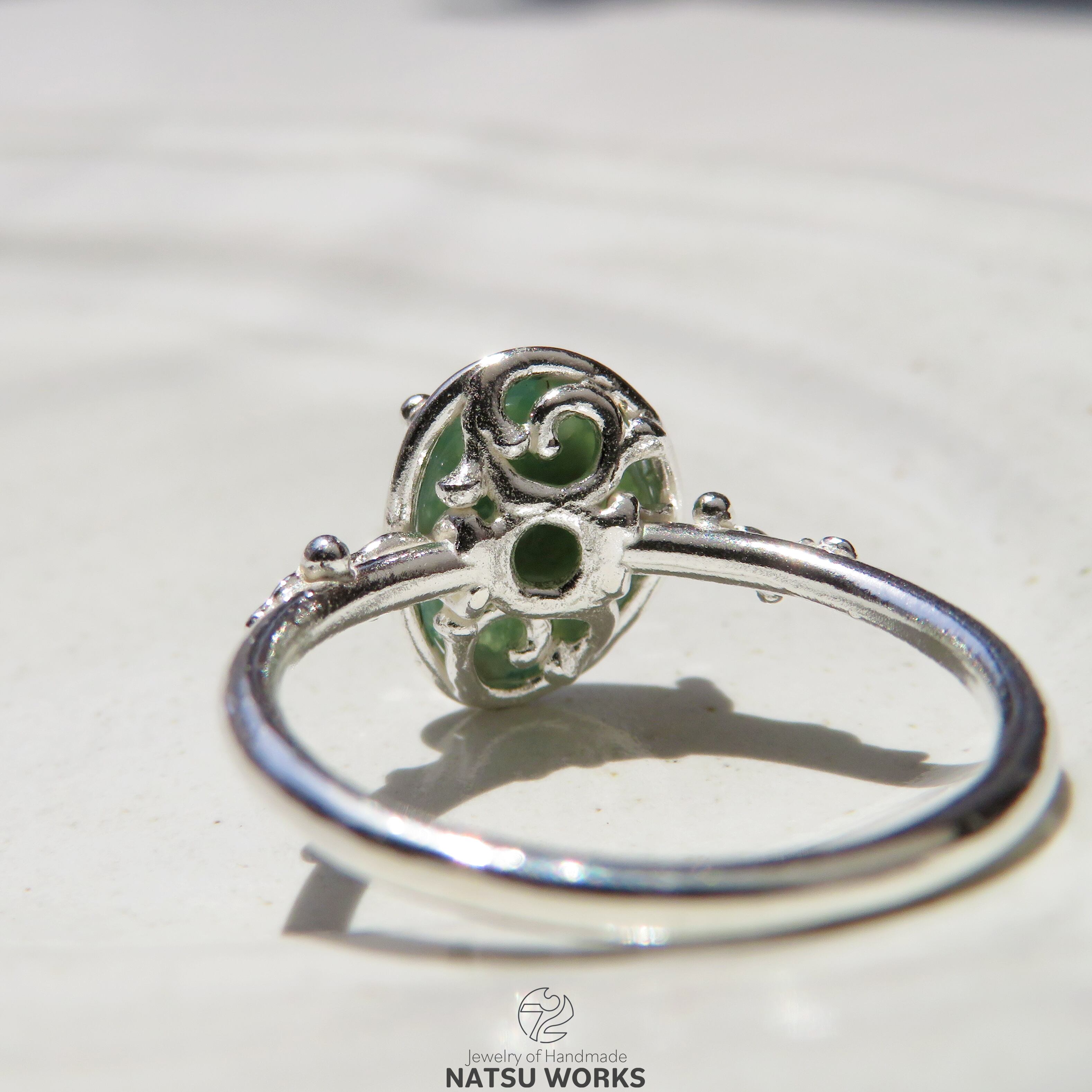 グリーンを基調にしたユニークな模様をもつジャスパーを、唐草の細身のリングにセットしました。