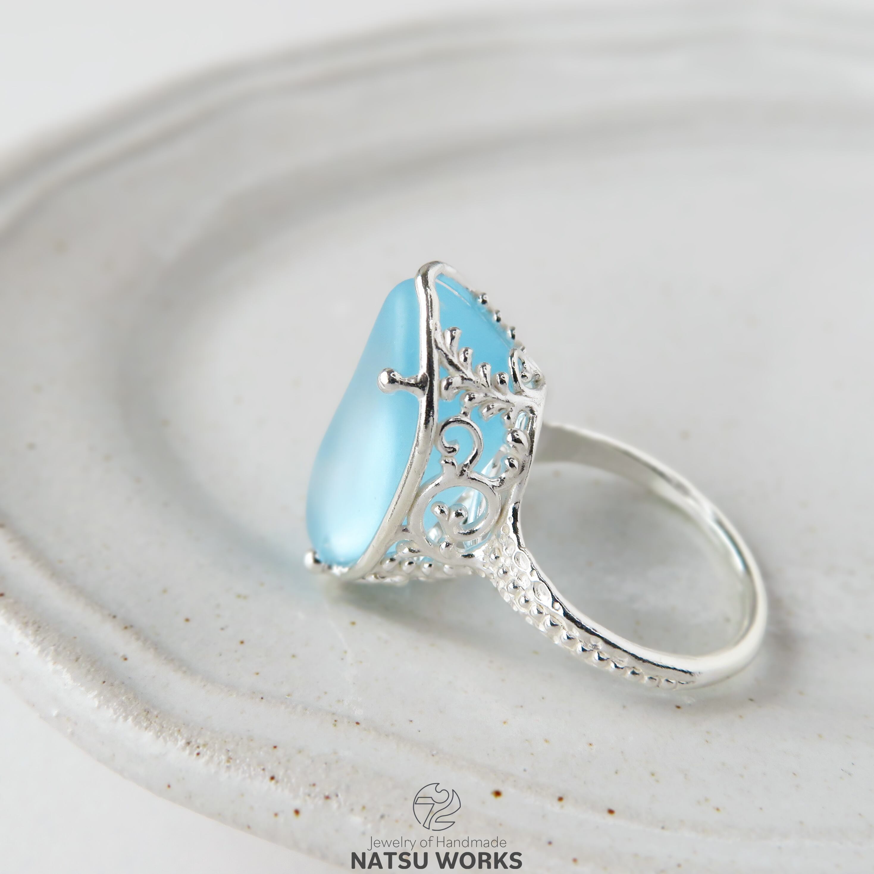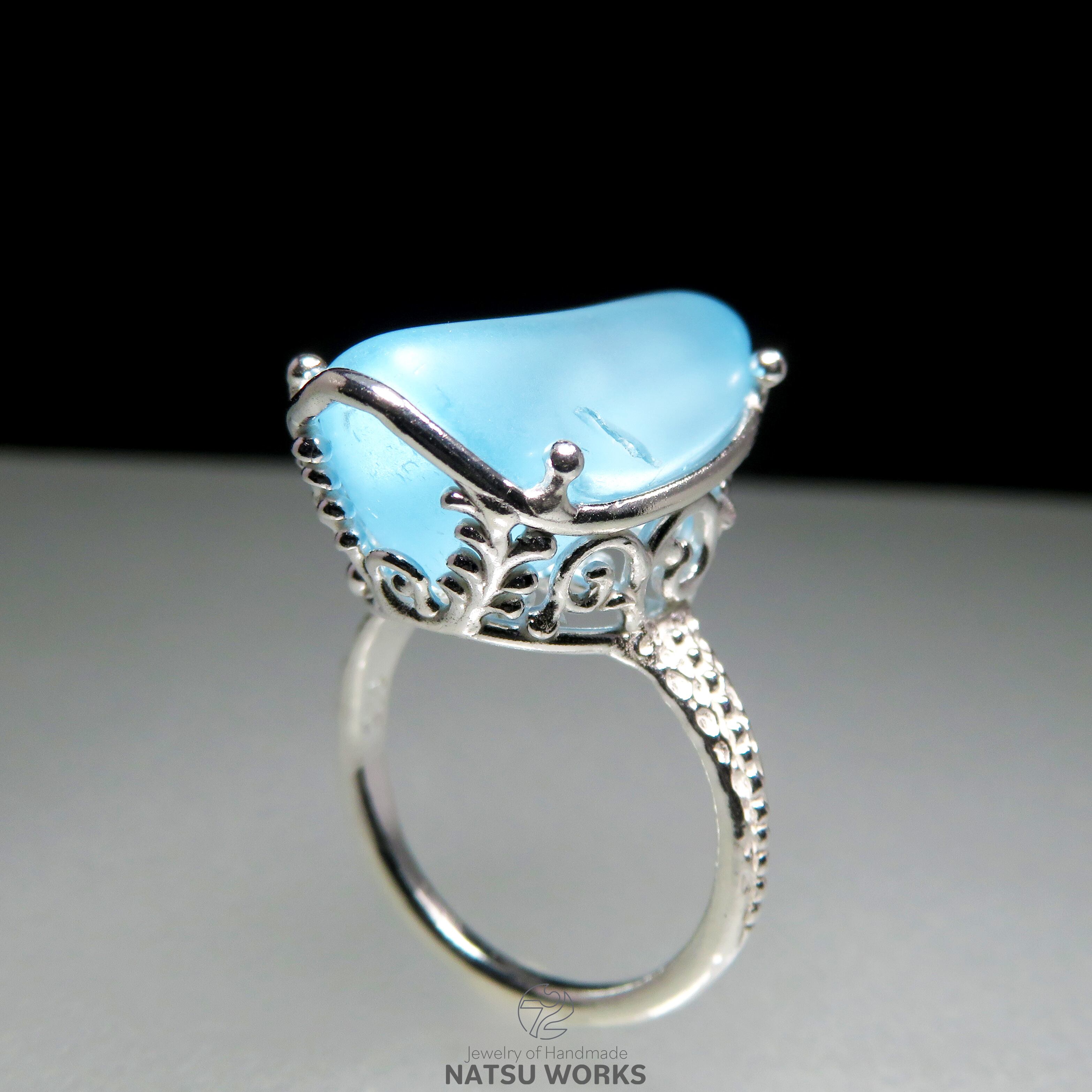 つや消しの表面で優しい発色を持つブルートパーズを、唐草と透かし模様の台座にセットしたリング。