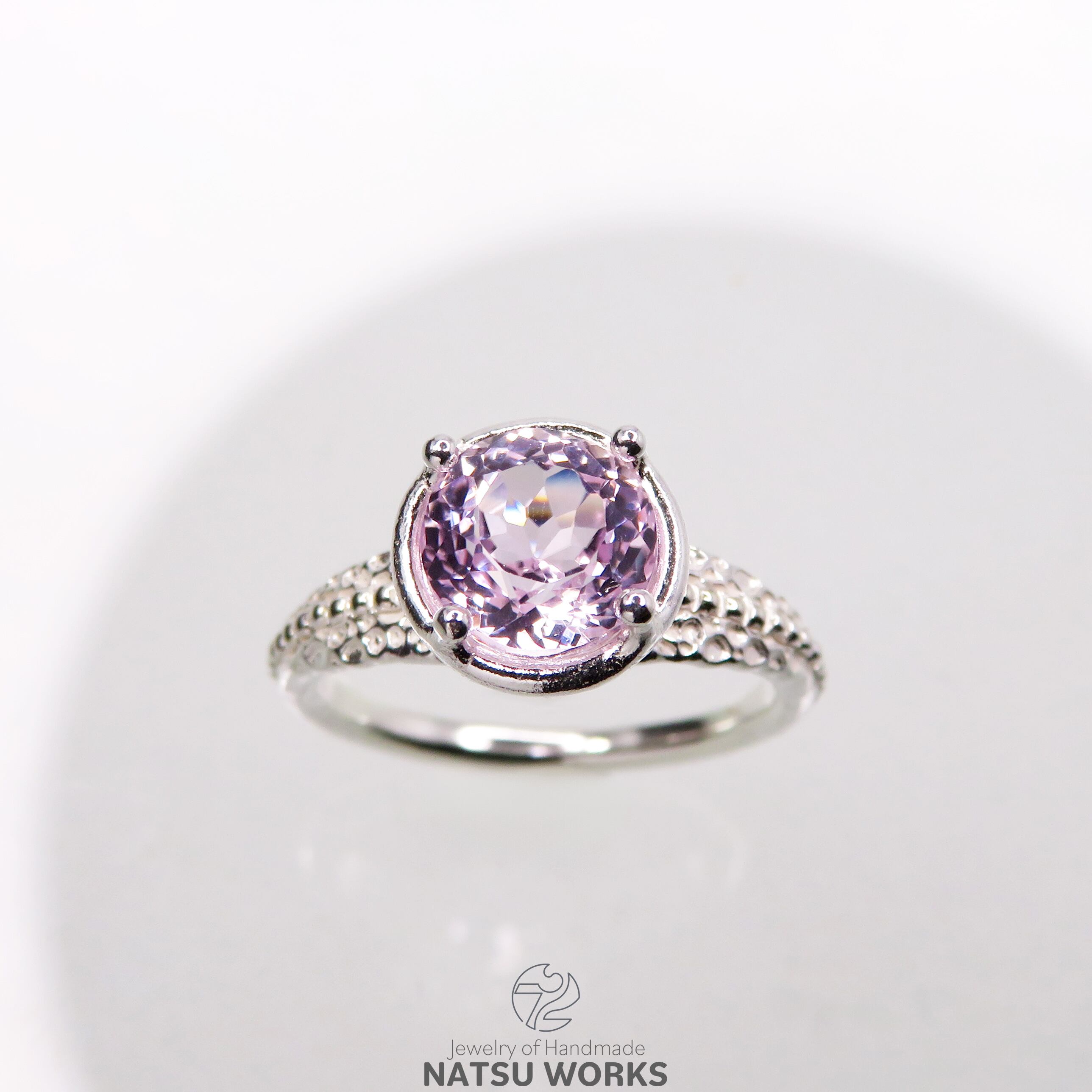 優しいピンクに輝くクンツァイトを、唐草と透かし模様の台座にセットしたリング。