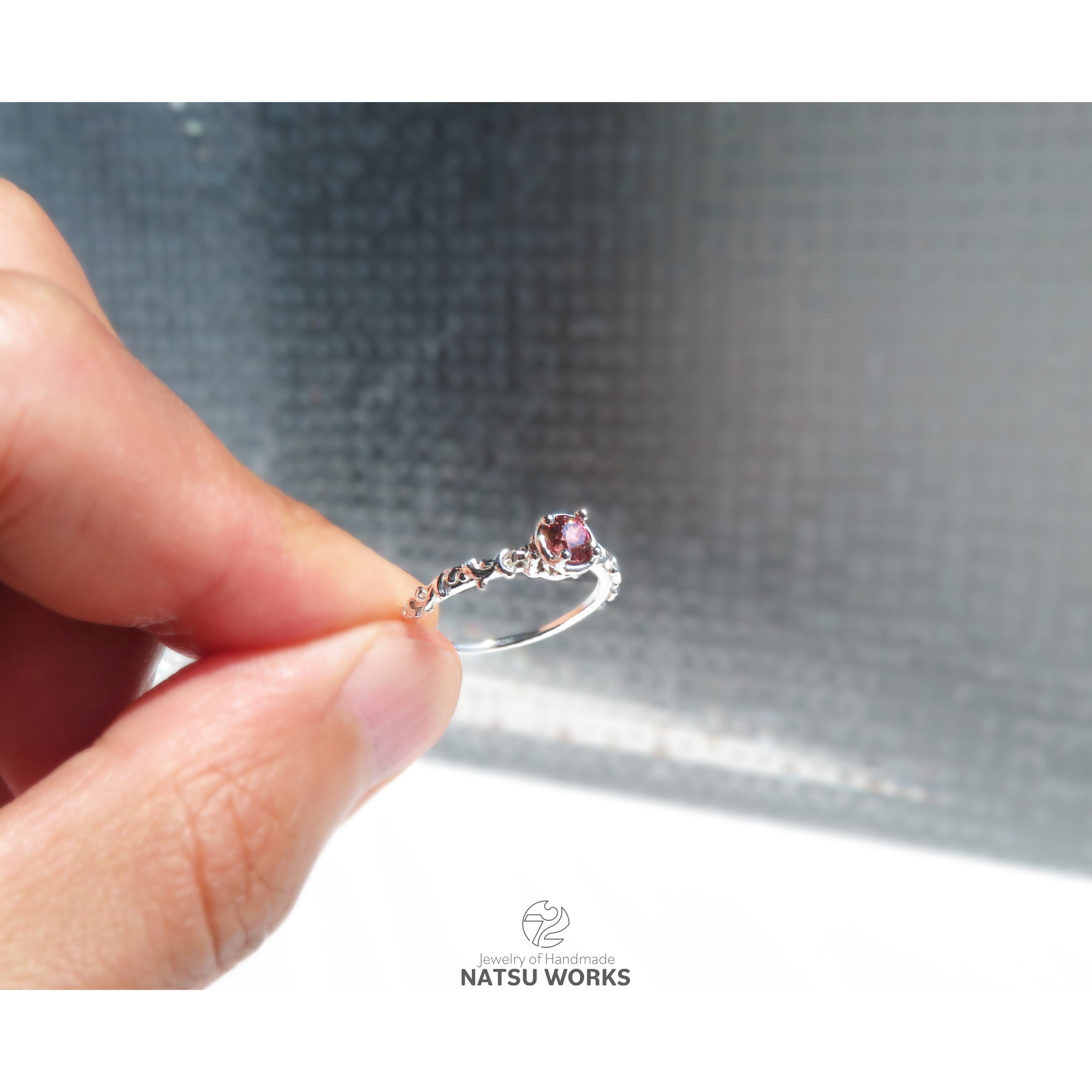 見る角度を変えるたびにその独特なピンクのグラデーションを輝かせるピンクジルコンを、唐草の細身のリングにセットしました。