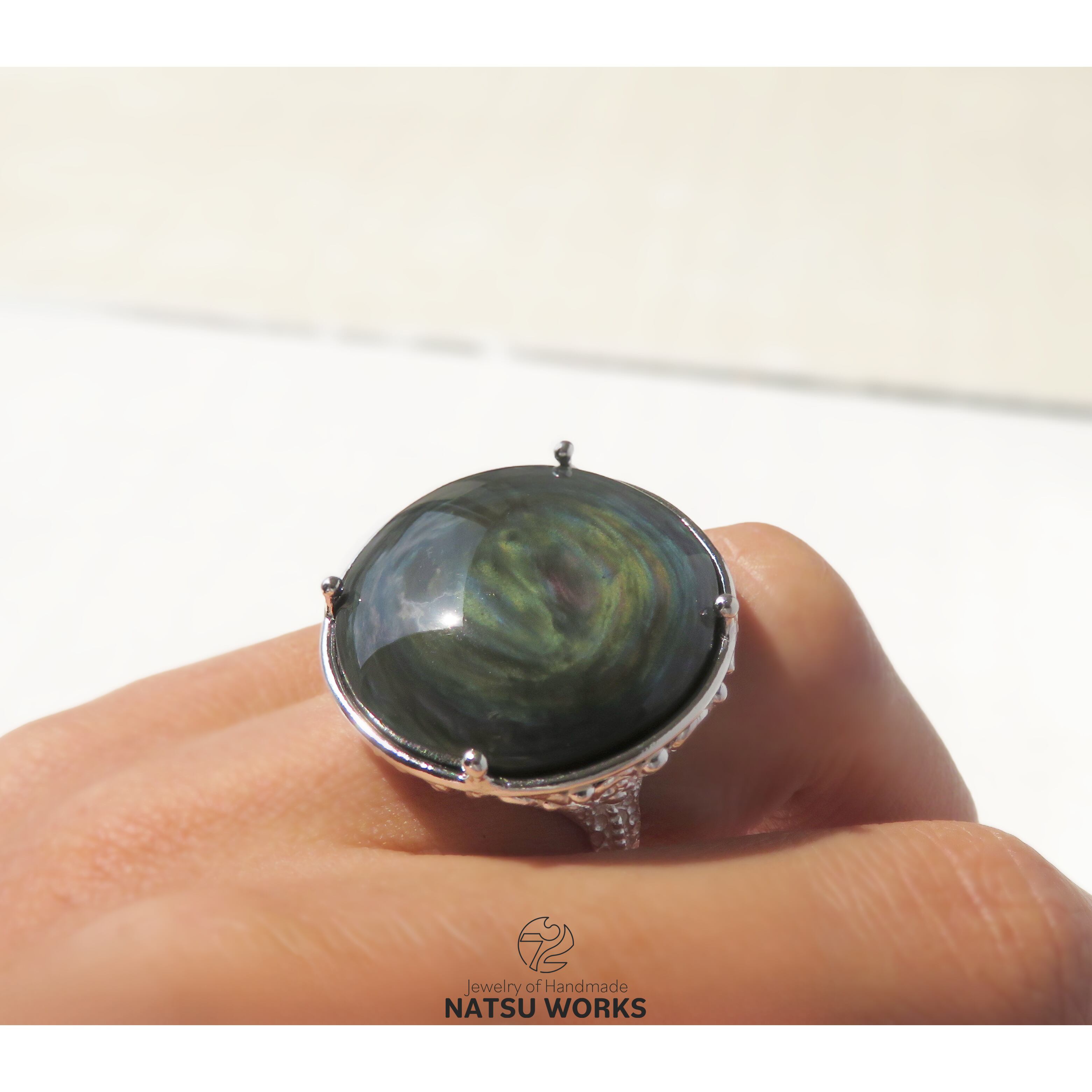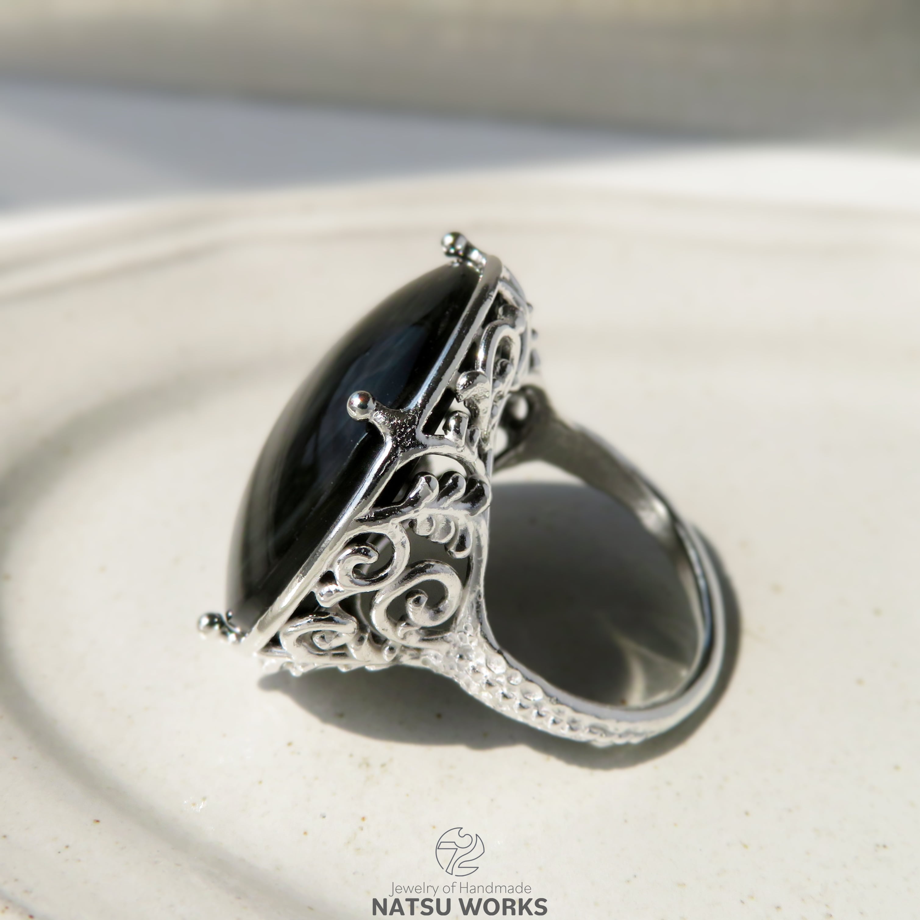 ベルベット オブシディアンを唐草と透かし模様の台座にセットしたリング。