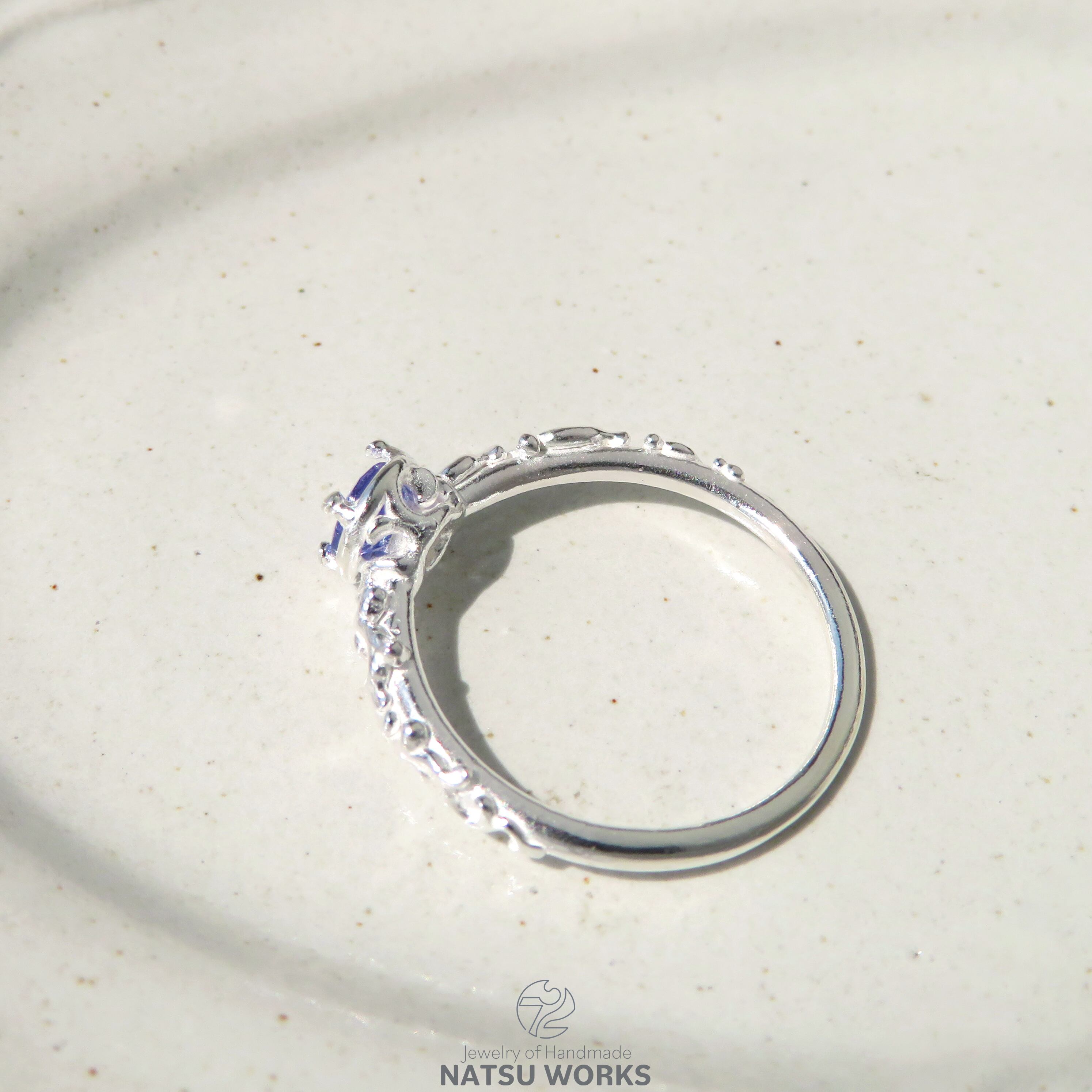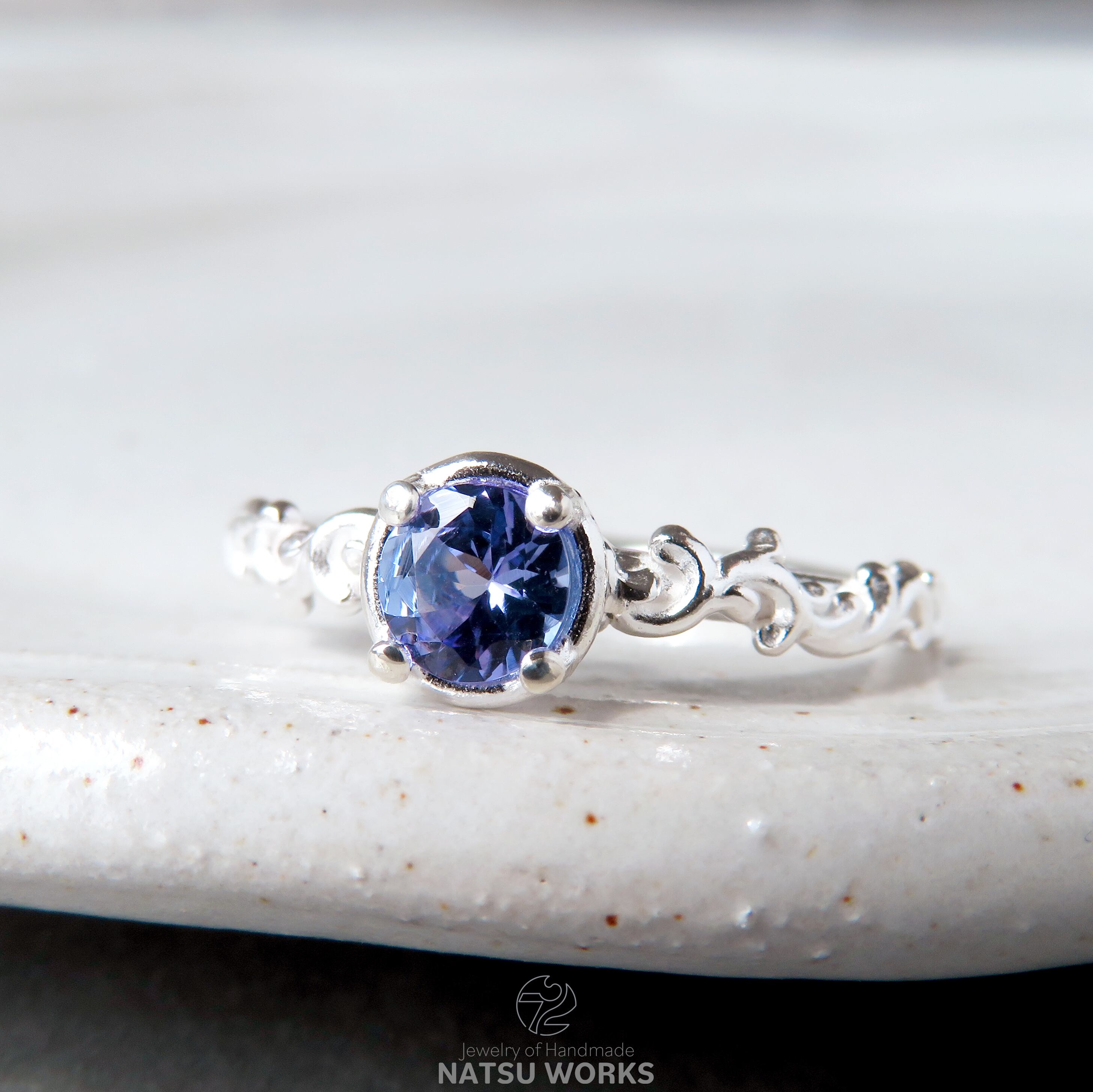 深みのあるブルーが特徴的なタンザナイトを、唐草の細身のリングにセットしました。
