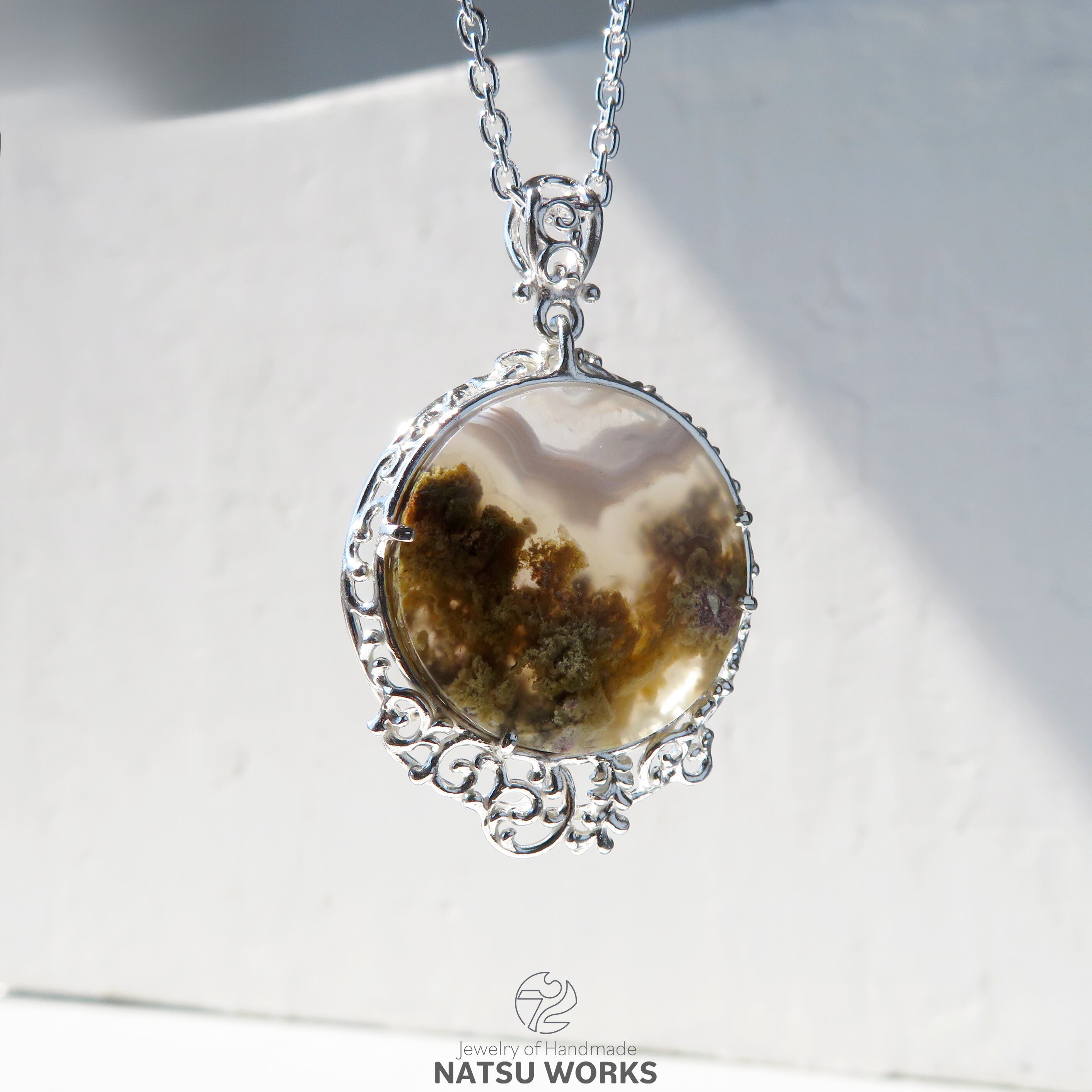 植物を閉じ込めたような独特な風景をもつアゲートを、ボタニカルなイメージの透かし模様の台座にセットしたペンダント。