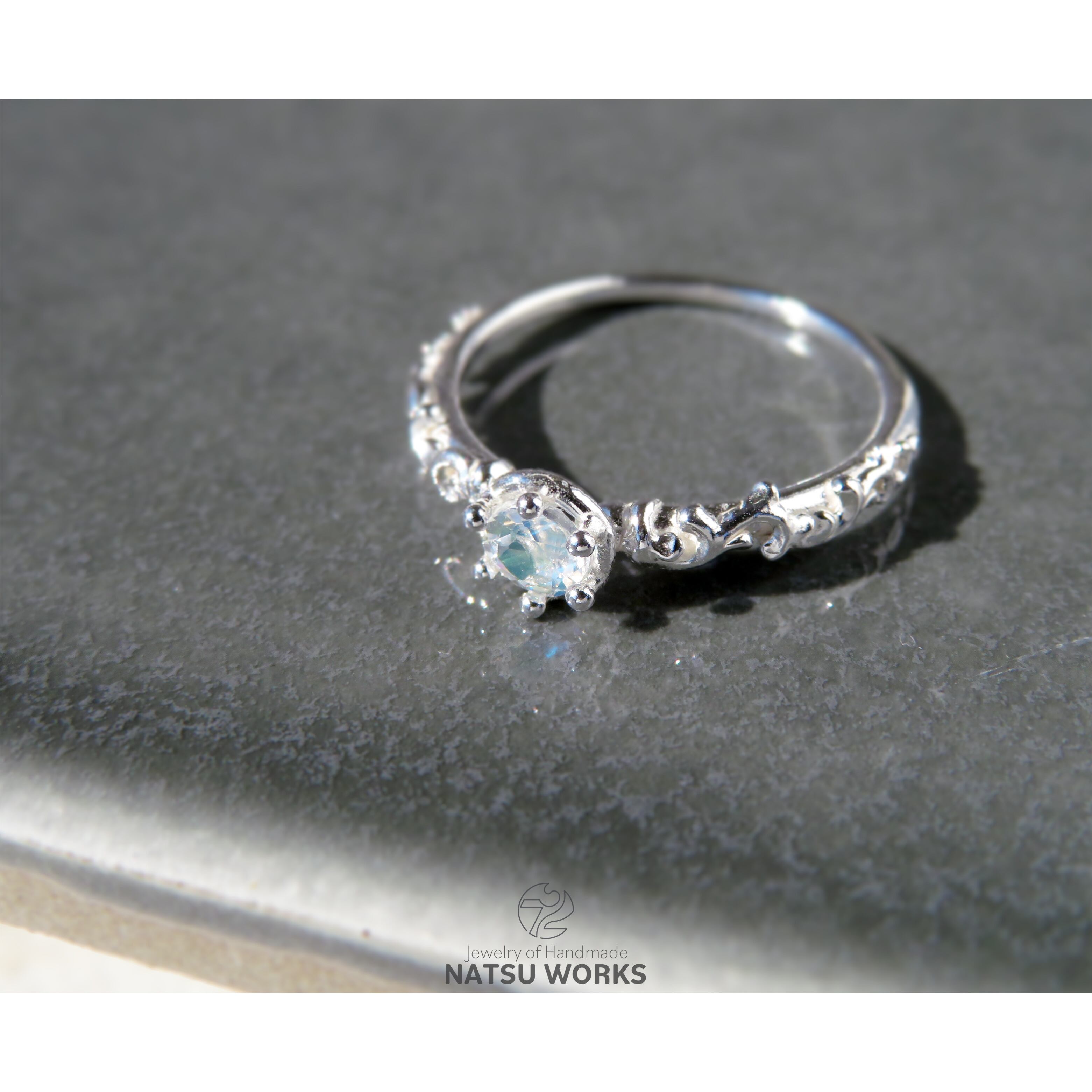 無色透明の中に独特の輝きを持つマダガスカル産・アンデシンラブラドライトを、唐草の細身のリングにセットしました。