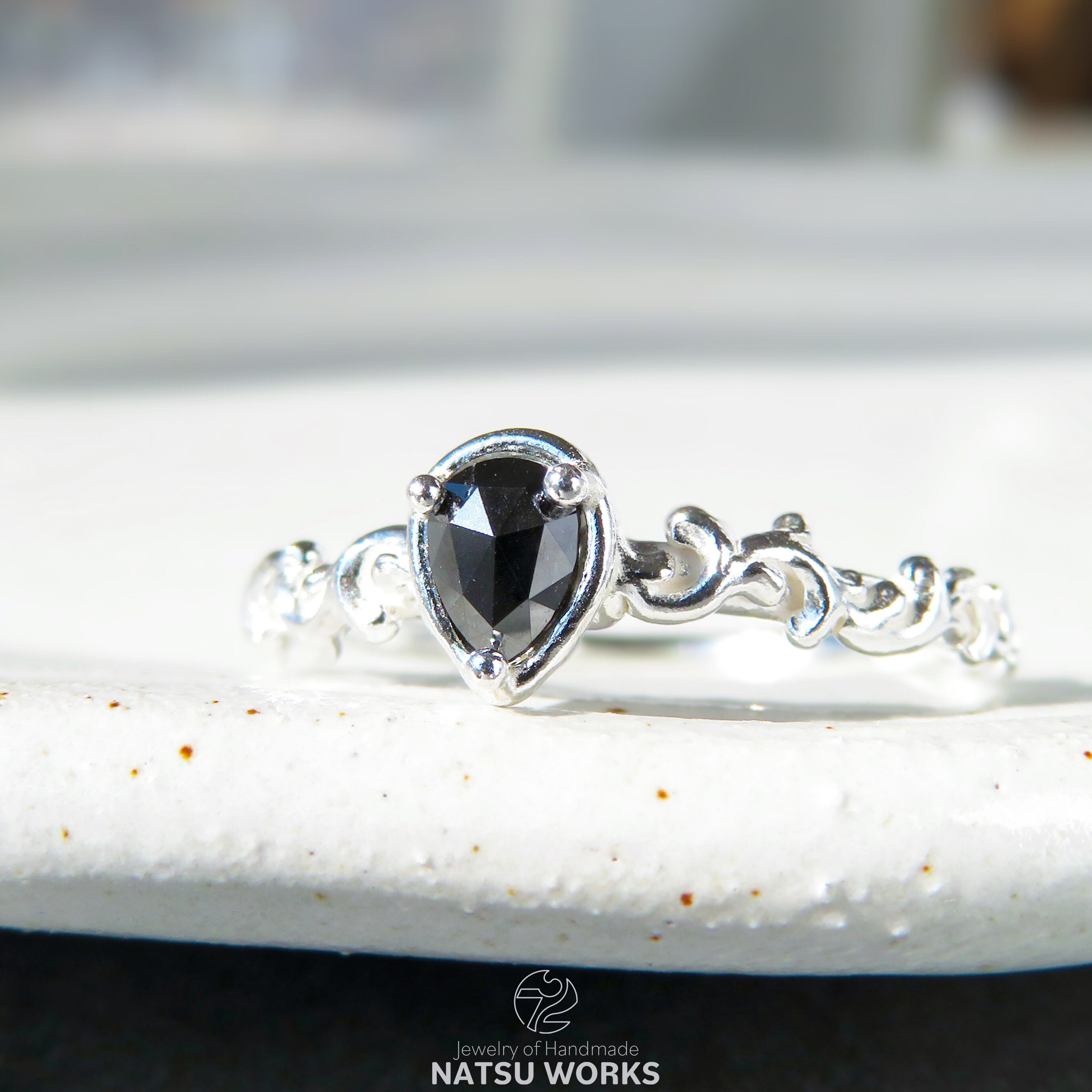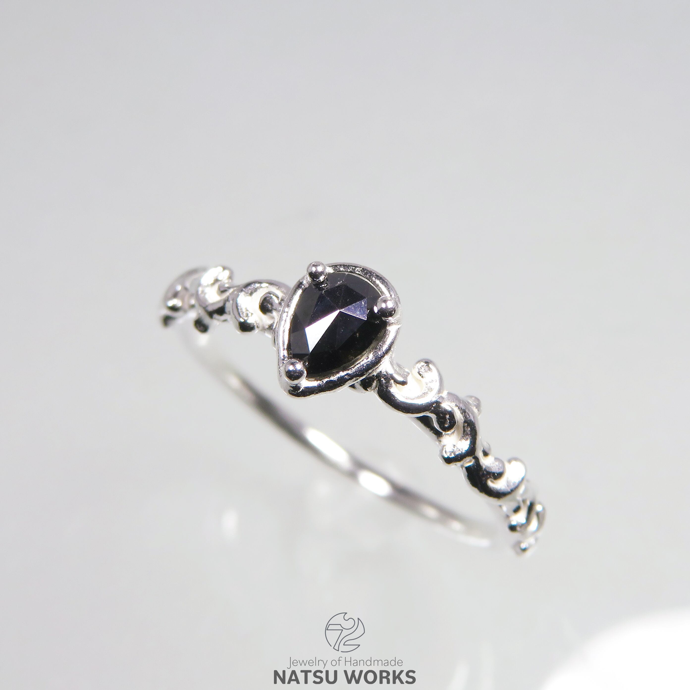 小さくても強い輝きを持つブラックダイヤを唐草の細身のリングにセットしました。