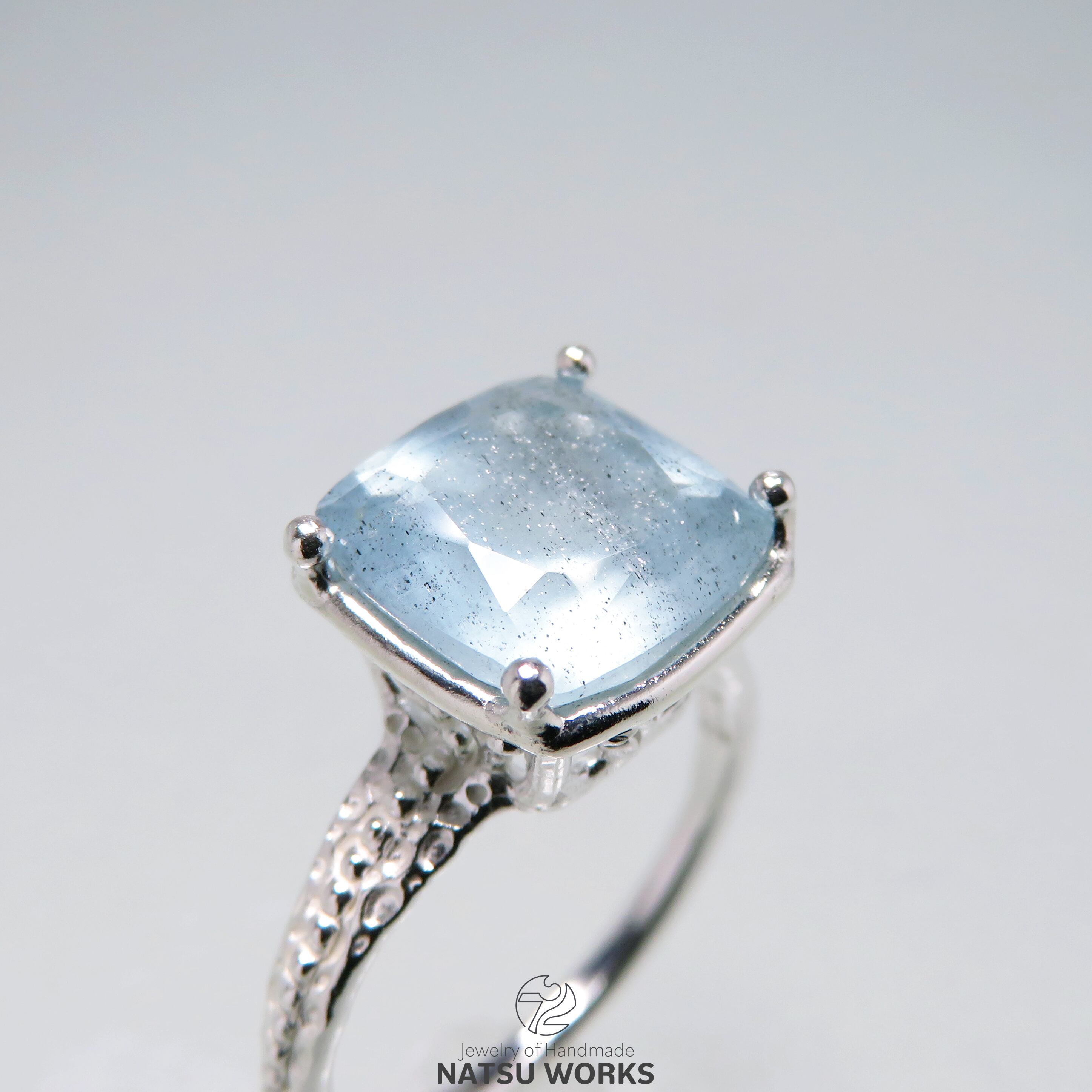 明るいブルーにラメ状の内包物がキラキラと輝くモスアクアマリンを、唐草と透かし模様の台座にセットしたリング。