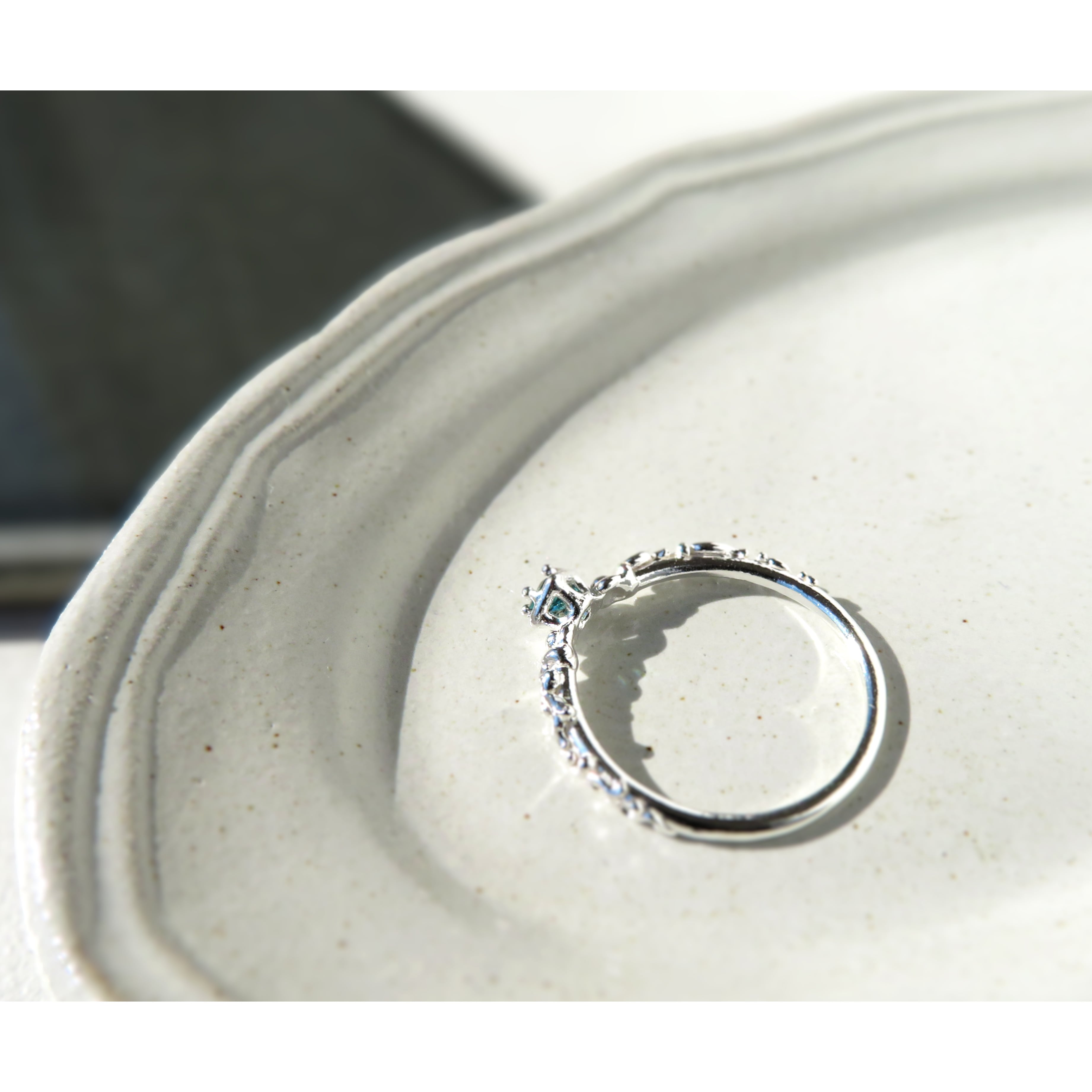 深いブルーグリーンのトルマリンを、唐草の細身のリングにセットしました。