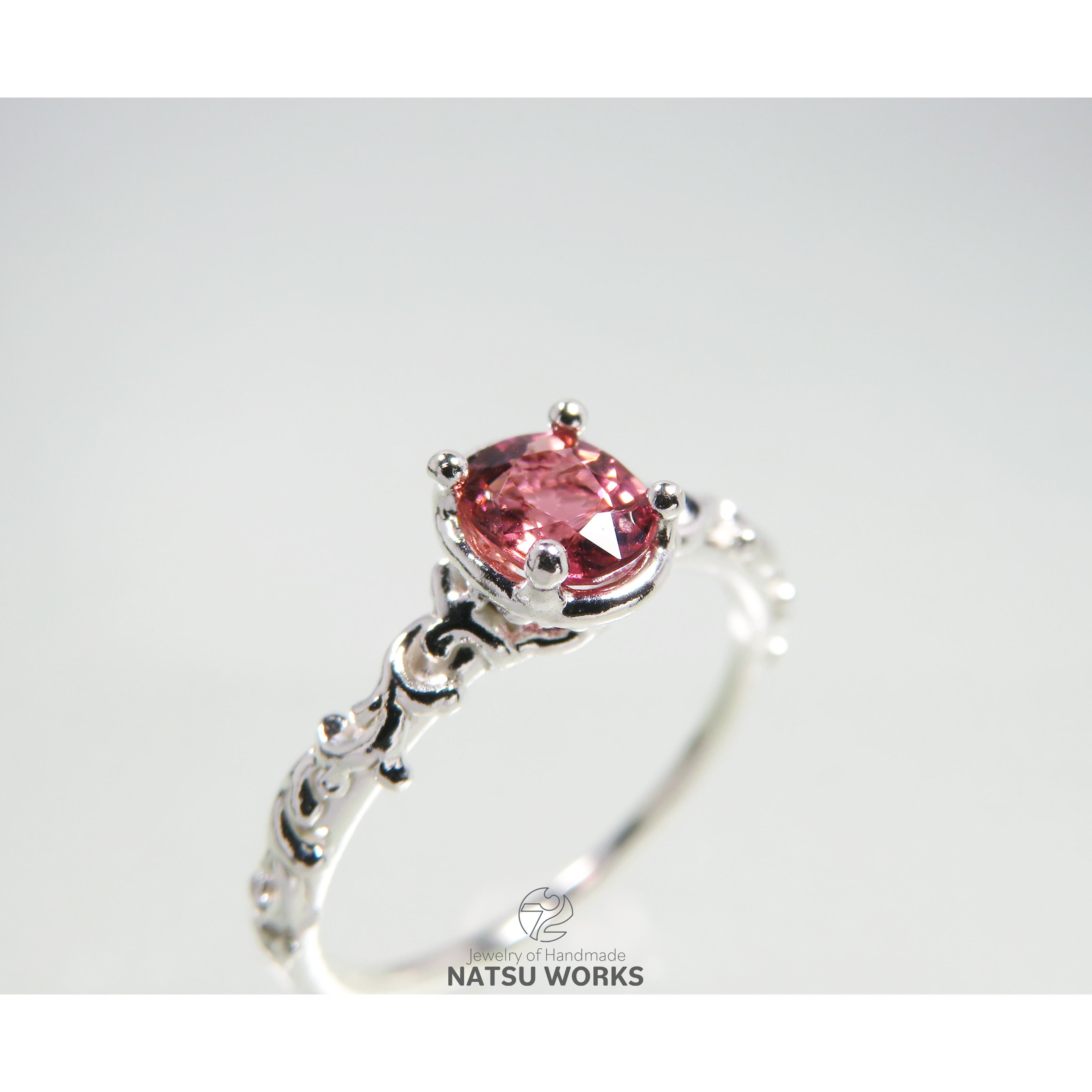 鮮やかなカラーのピンクトルマリンを、唐草の細身のリングにセットしました。