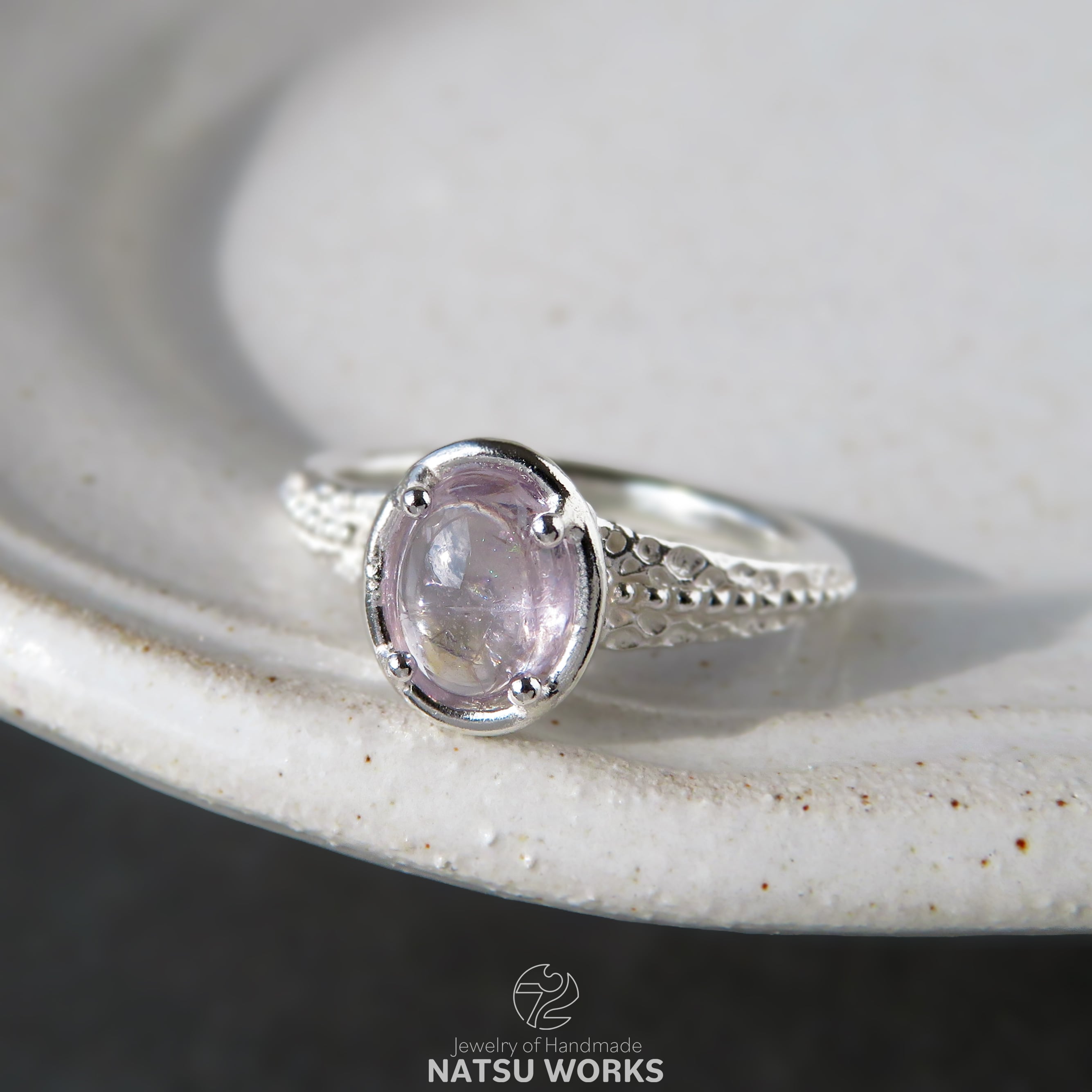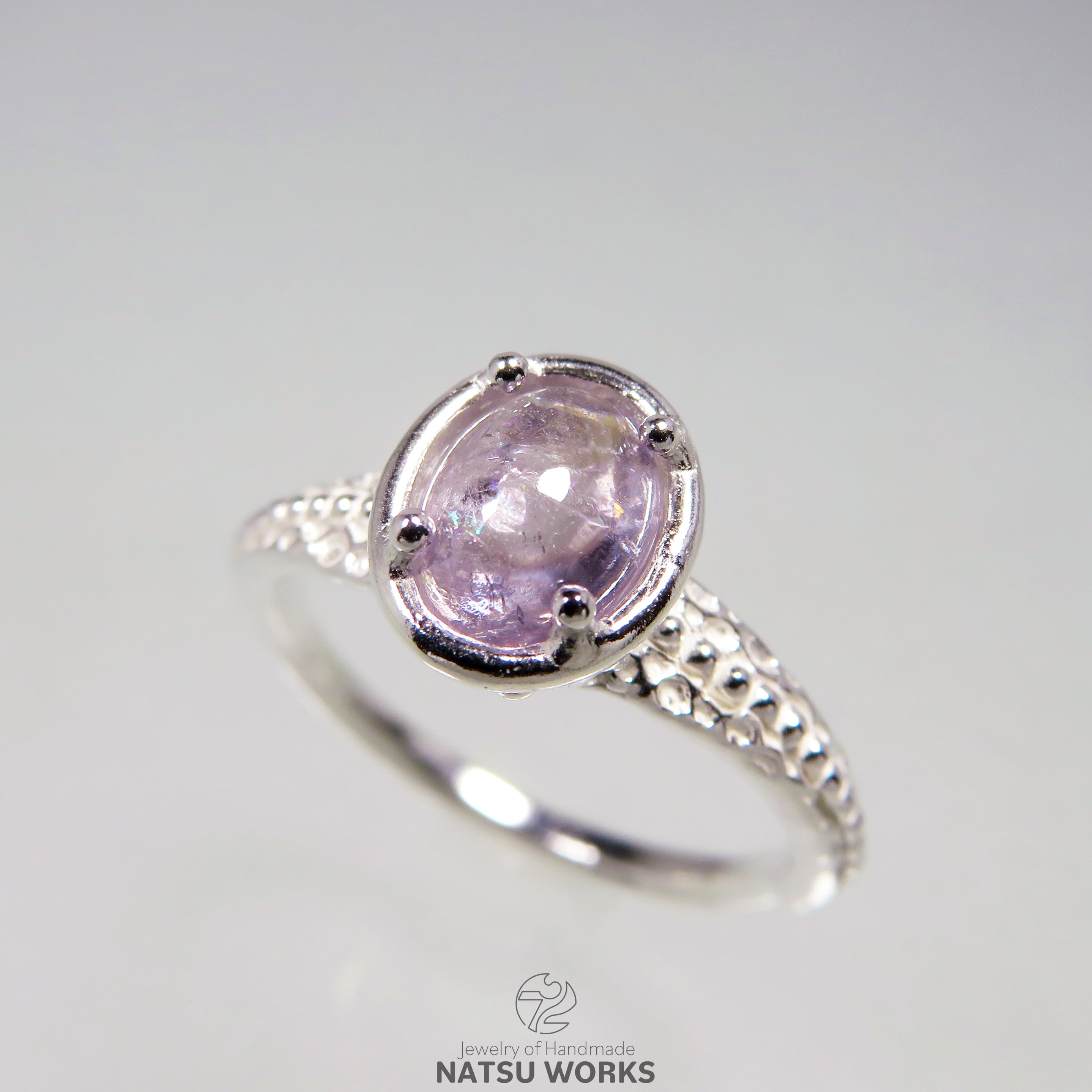 パープルベースの淡い色彩をもつスピネルを、唐草と透かし模様の台座にセットしたリング。
