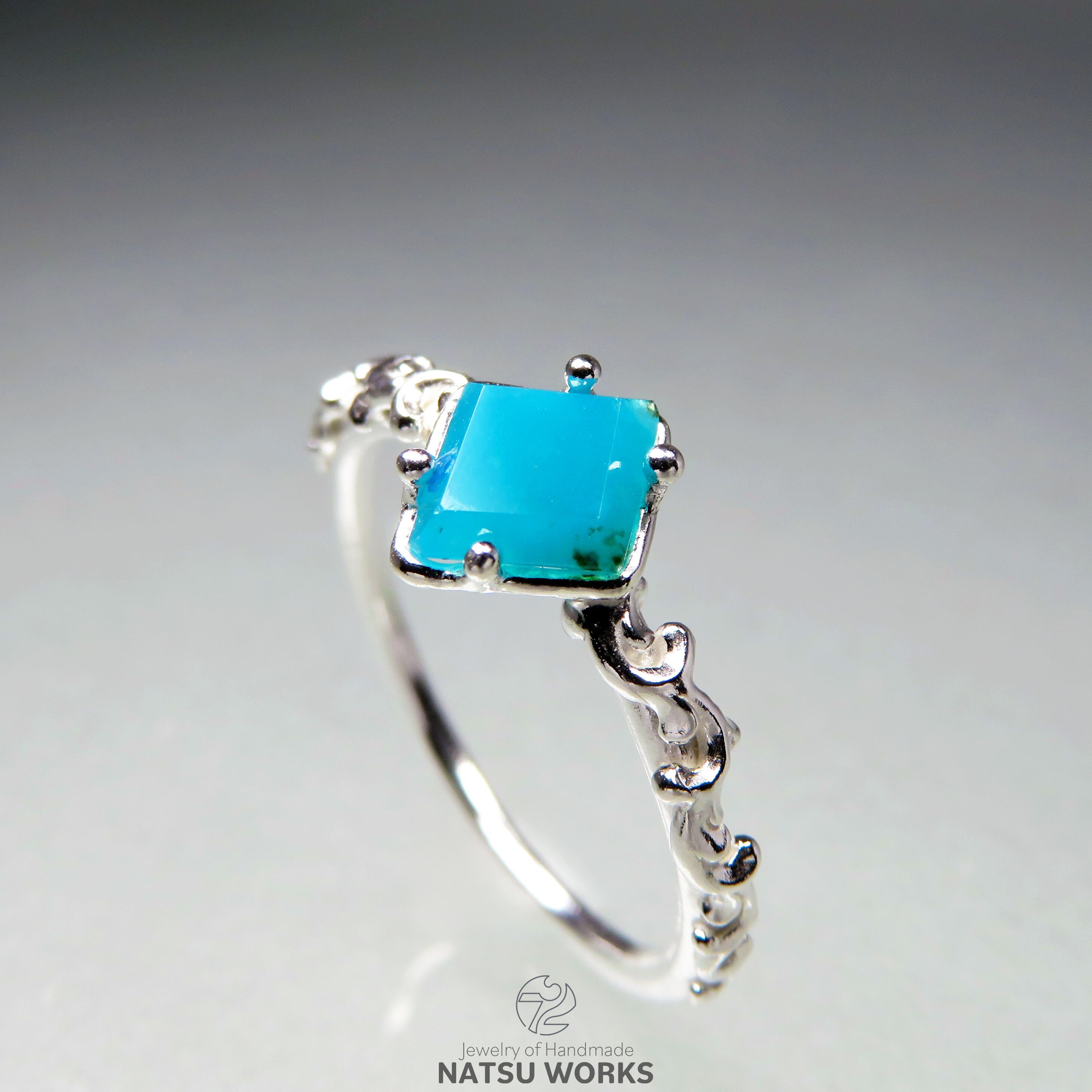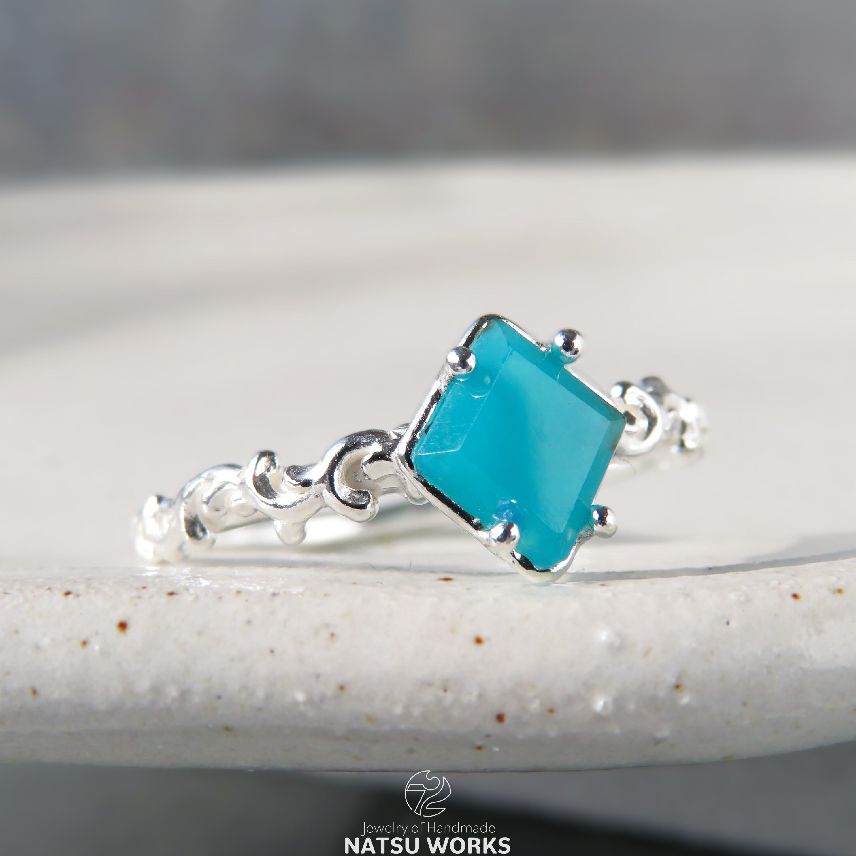 明るいブルーのクリソコラカルセドニー / ジェムシリカを、唐草の細身のリングにセットしました。