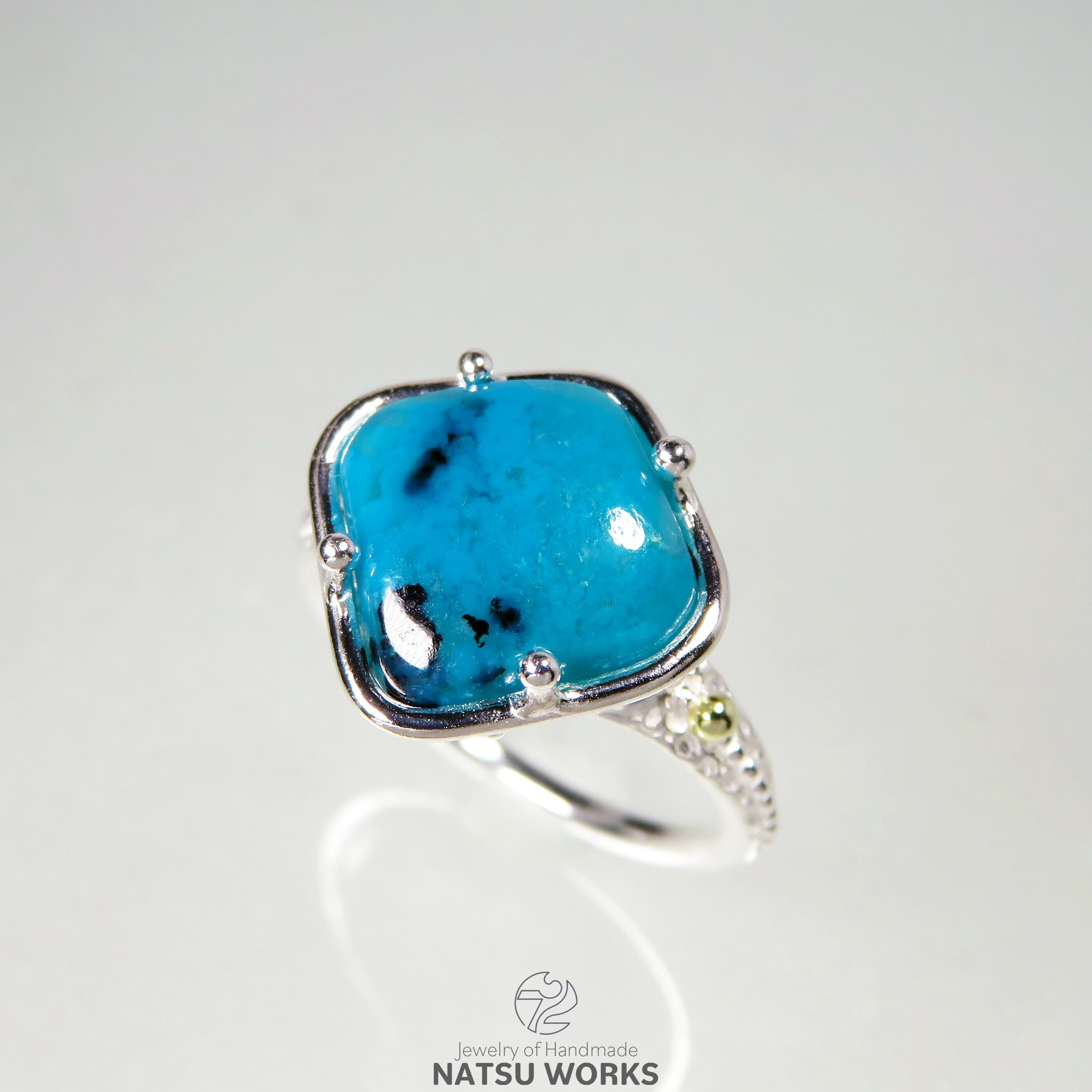 鮮やかなブルーのクリソコラカルセドニー / ジェムシリカを、18金のボールで飾った透かし模様の台座にセットしたリング。