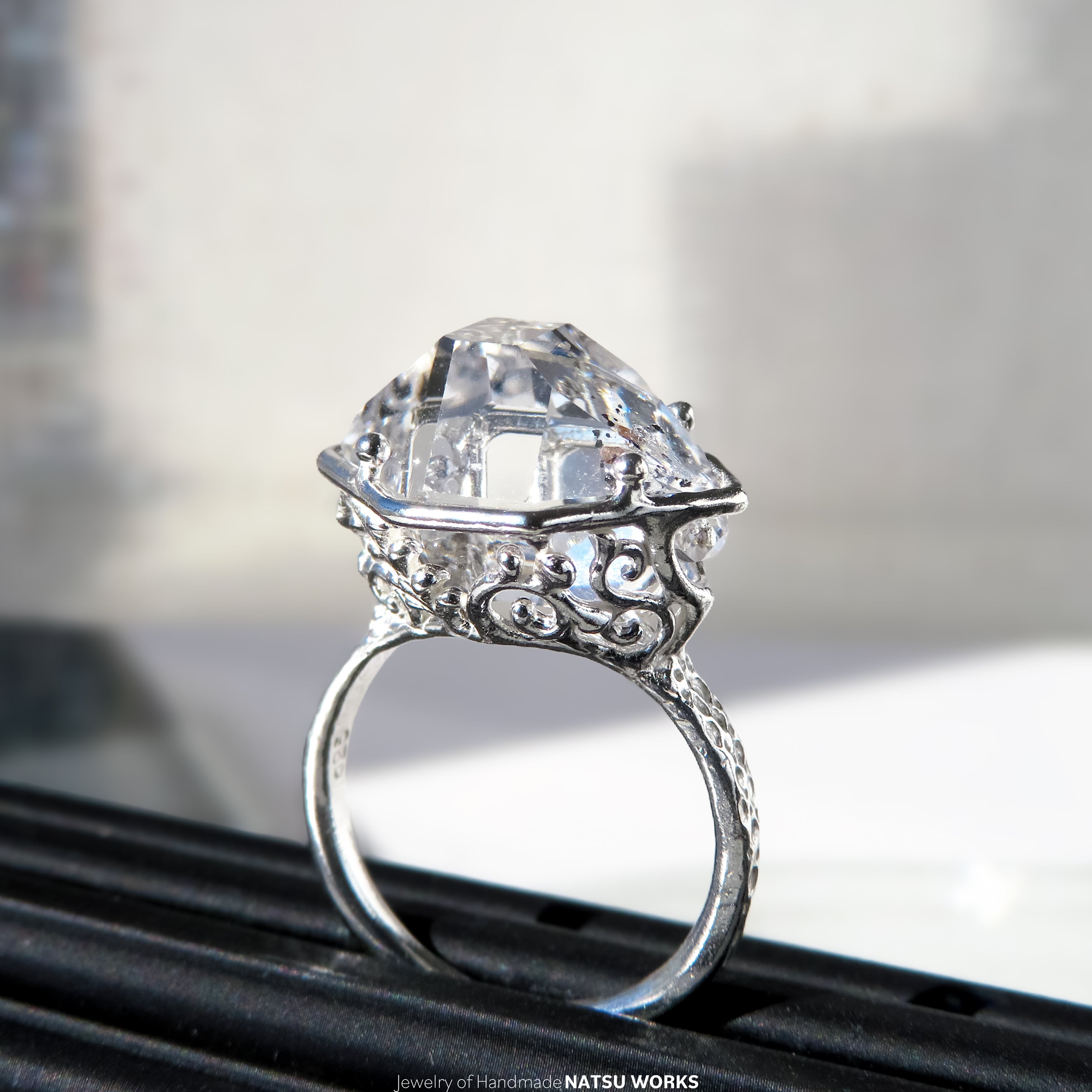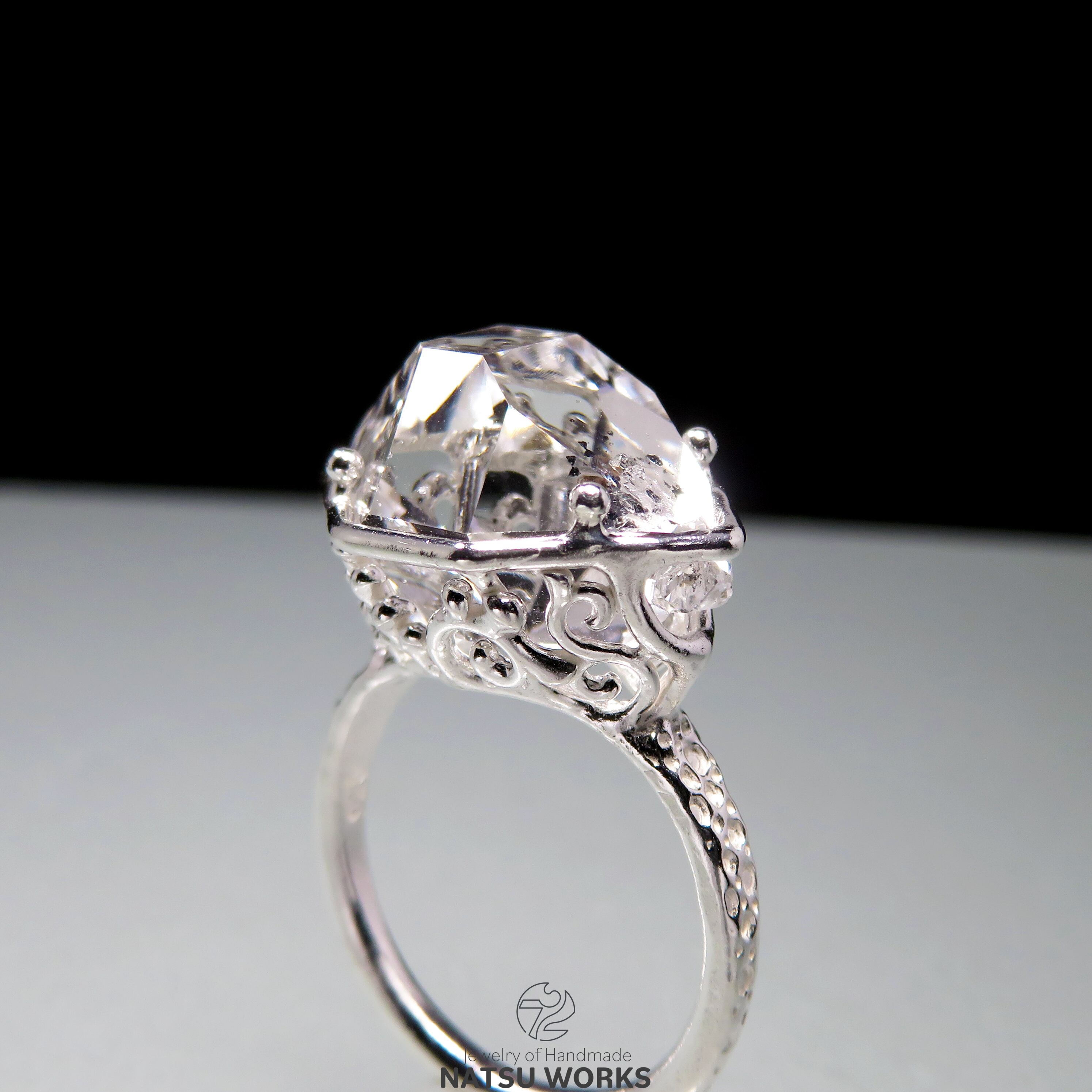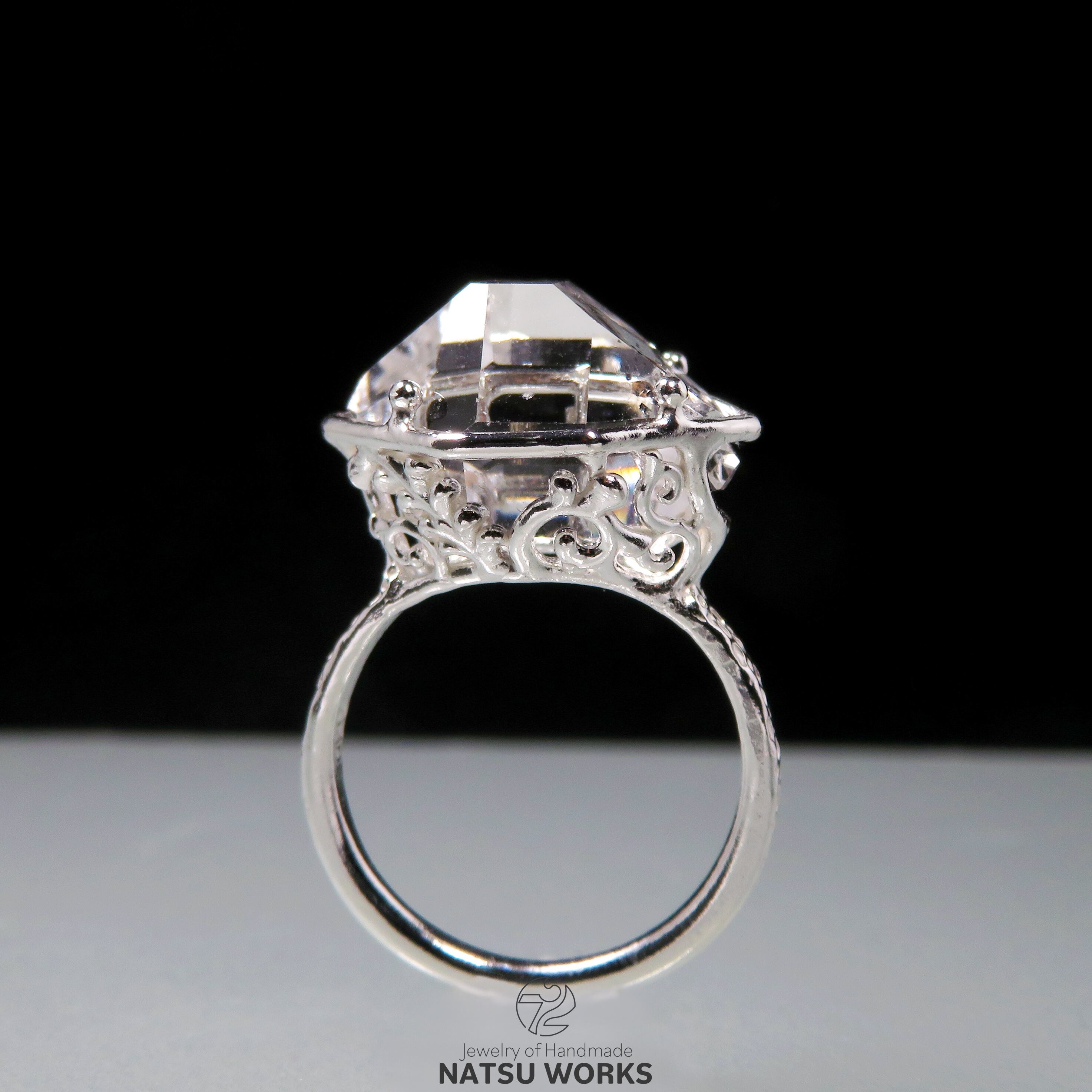 高い透明度と表面の照りを持つハーキマー ダイヤモンドを、唐草と透かし模様の台座にセットしたリング。
