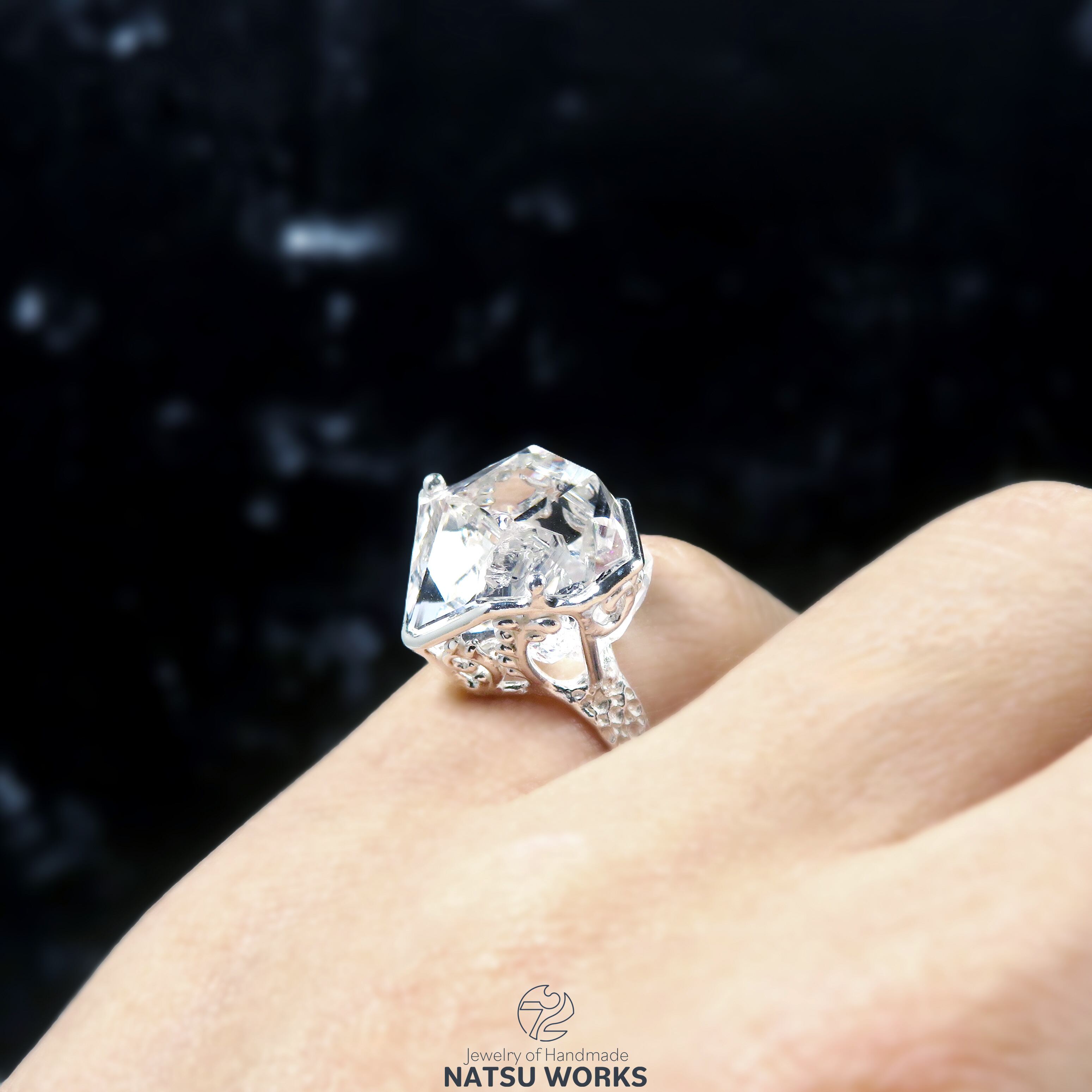 高い透明度と表面の照りを持つハーキマー ダイヤモンドを、唐草と透かし模様の台座にセットしたリング。