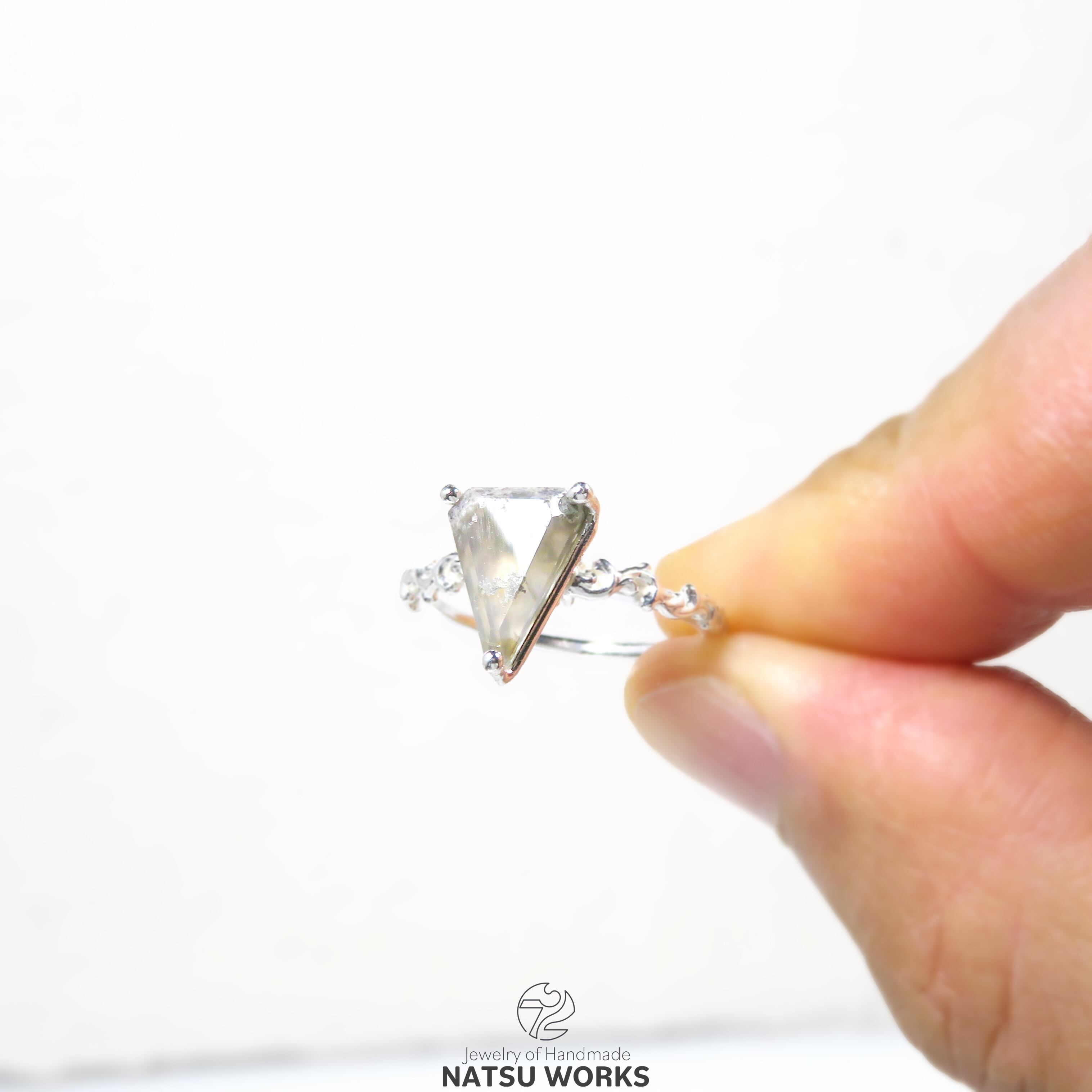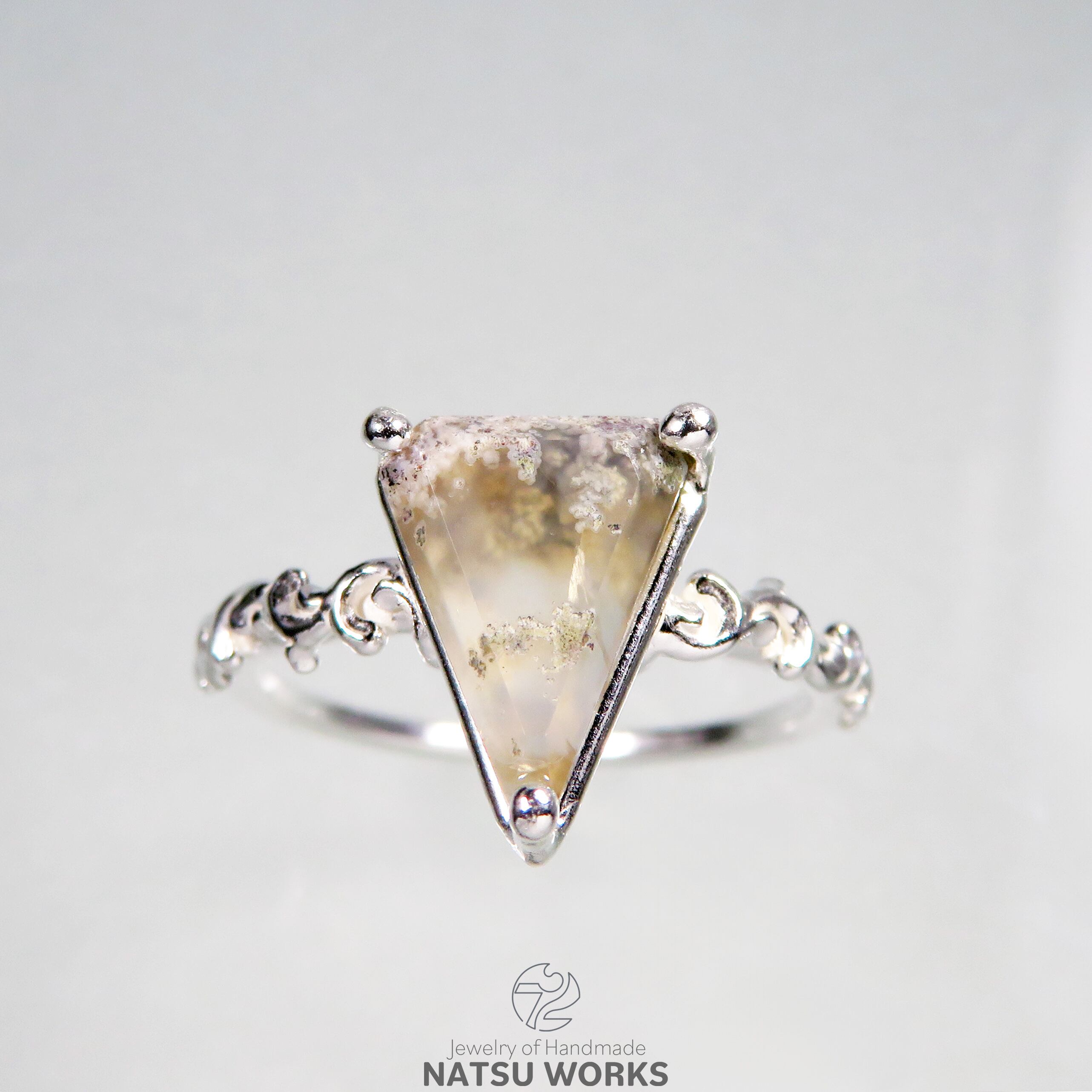 植物を閉じ込めたような独特な風景をもつモスアゲートを、唐草と透かし模様の台座にセットしたリング。