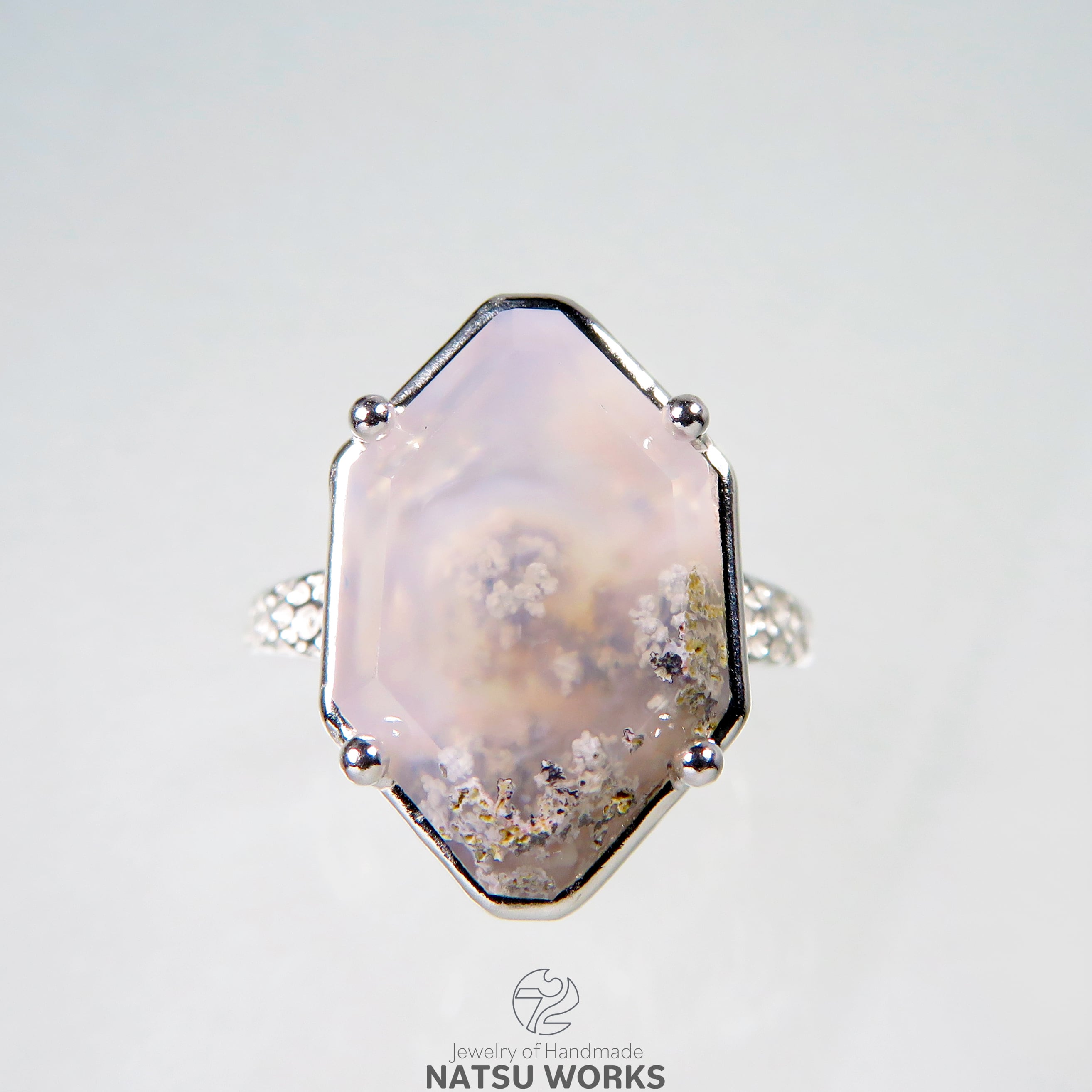 植物を閉じ込めたような独特な風景をもつモスアゲートを、唐草と透かし模様の台座にセットしたリング。