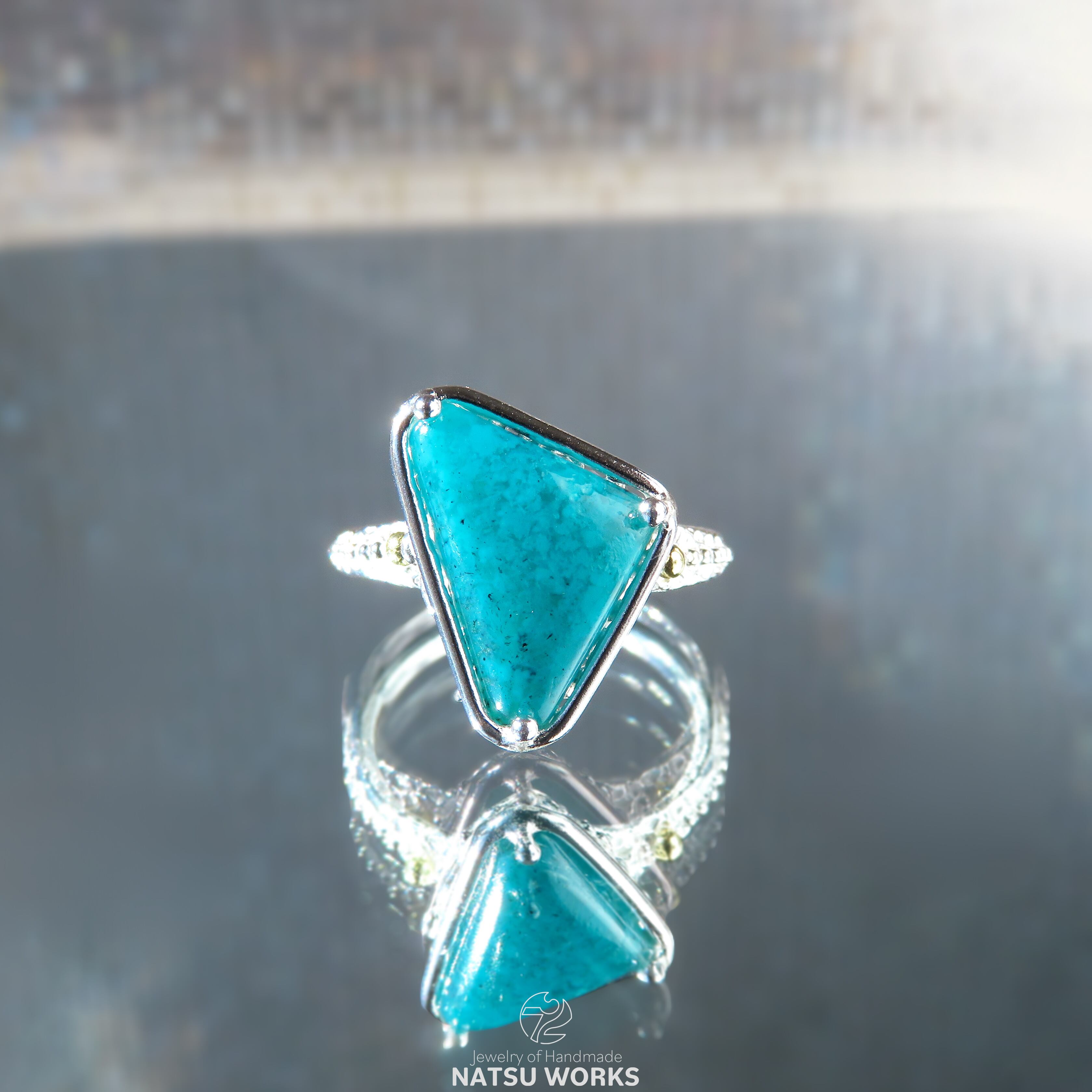鮮やかなブルーのクリソコラカルセドニー / ジェムシリカを、18金のボールで飾った透かし模様の台座にセットしたリング。