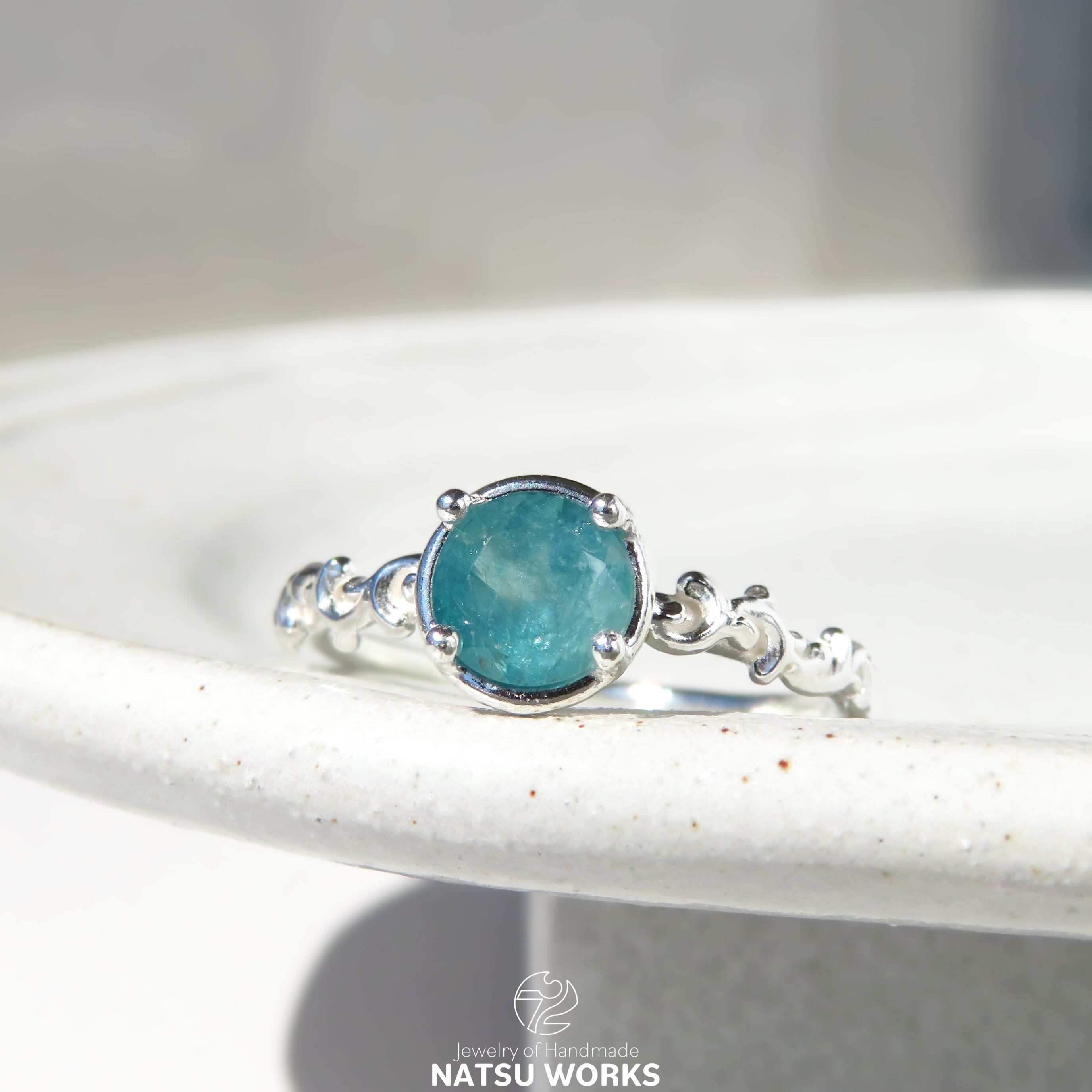 清々しいブルーグリーンが特徴的なグランディディエライトを、唐草の細身のリングにセットしました。