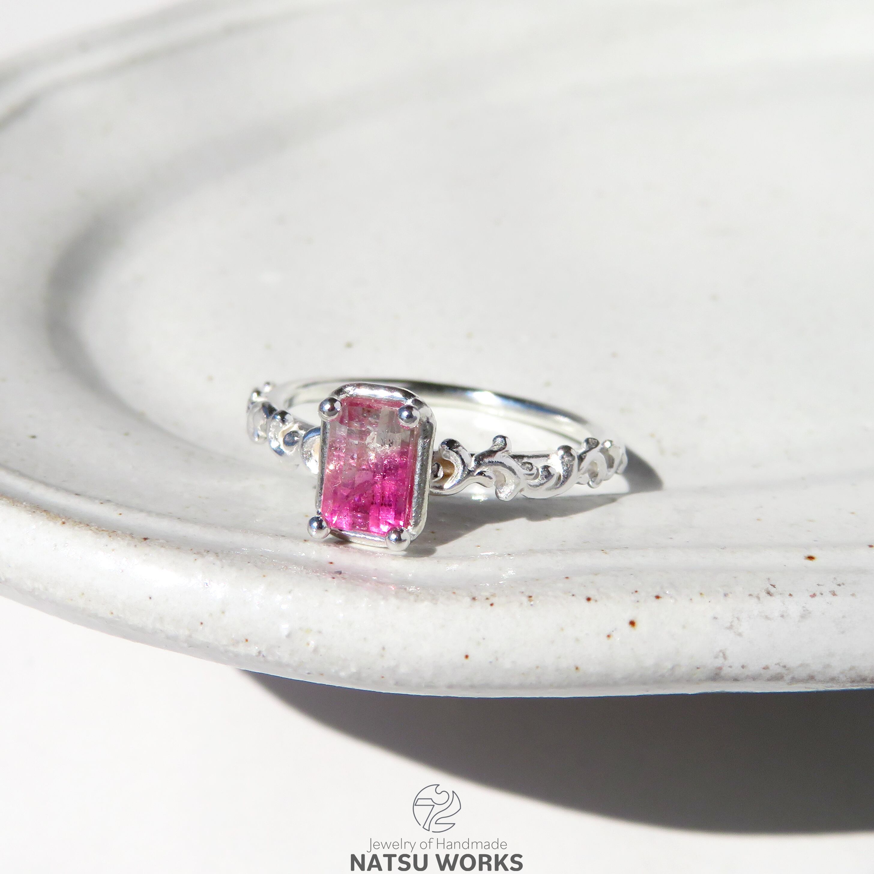 鮮やかなピンクのグラデーションを持つブラジル産・トルマリンを、唐草の細身のリングにセットしました。