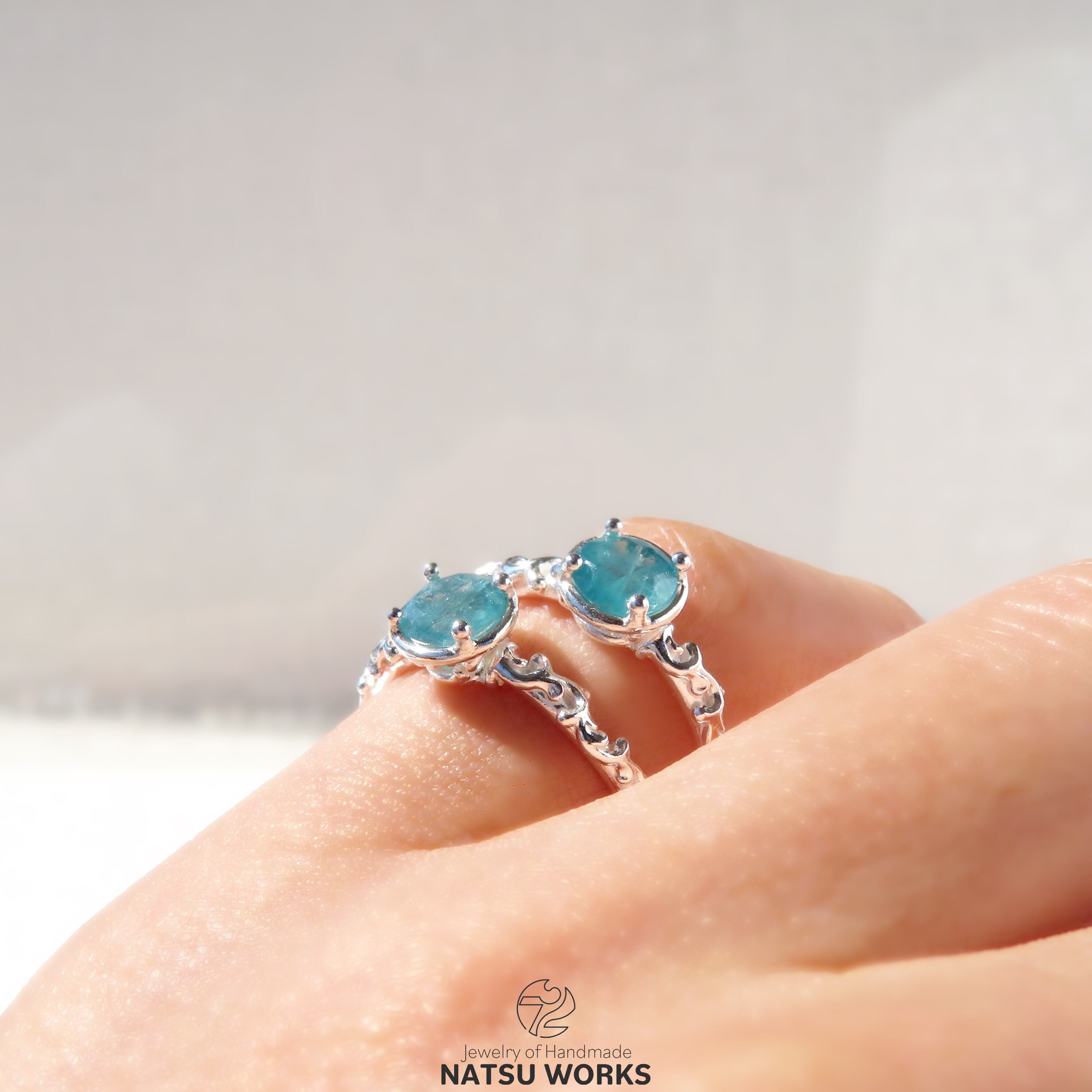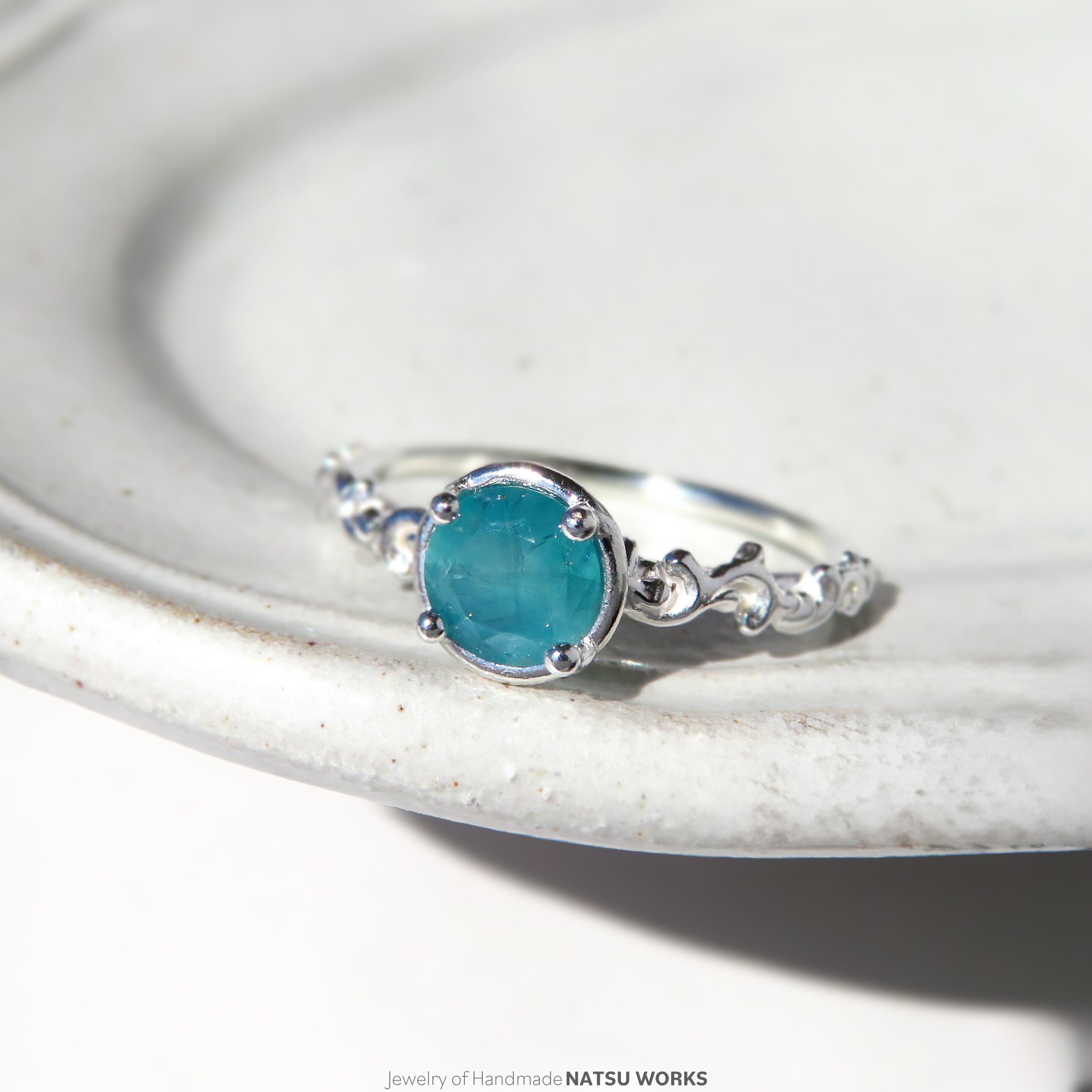 清々しいブルーグリーンが特徴的なグランディディエライトを、唐草の細身のリングにセットしました。