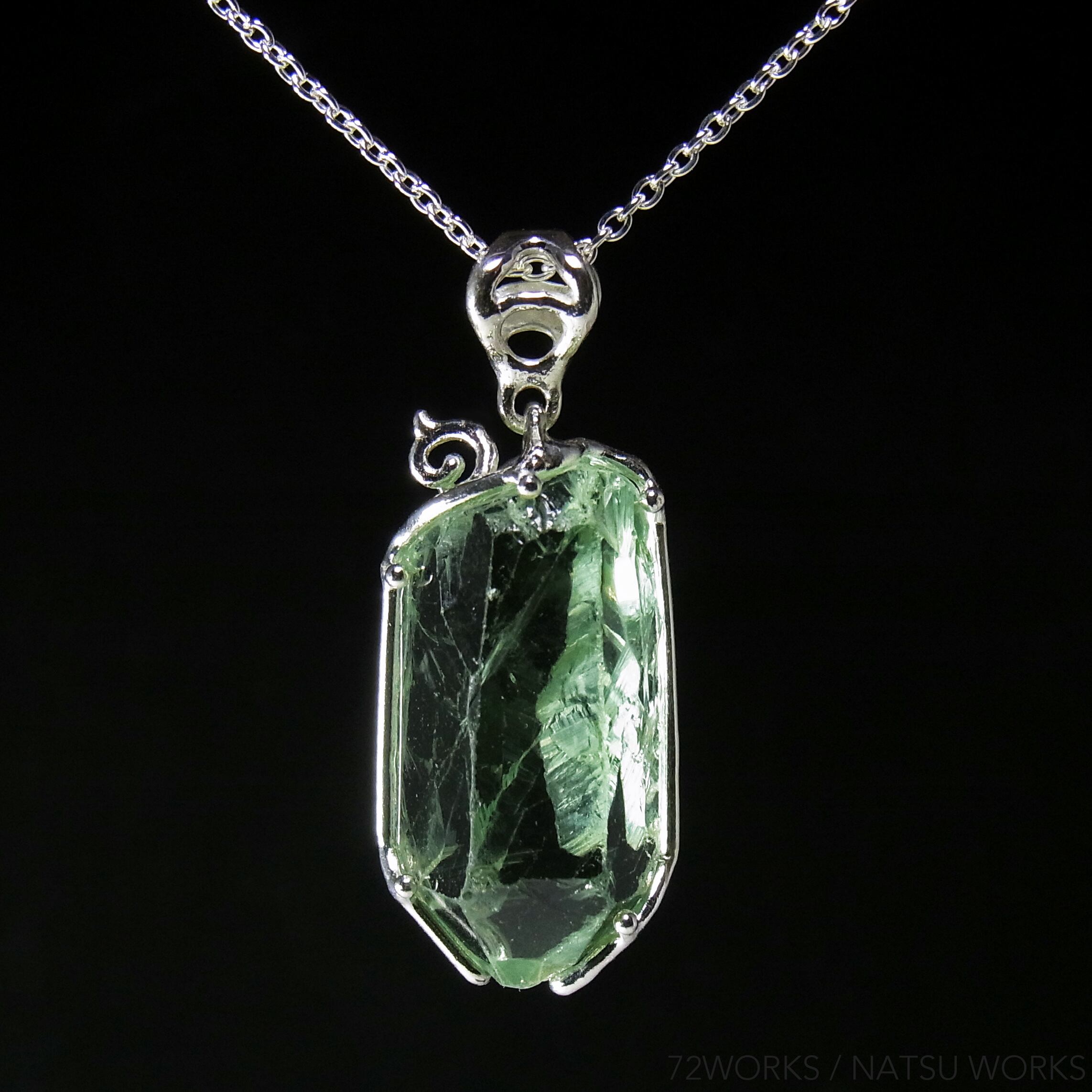 原石ならではの形状と淡いグリーンの色彩を、裏から透かし模様で飾った一品です。