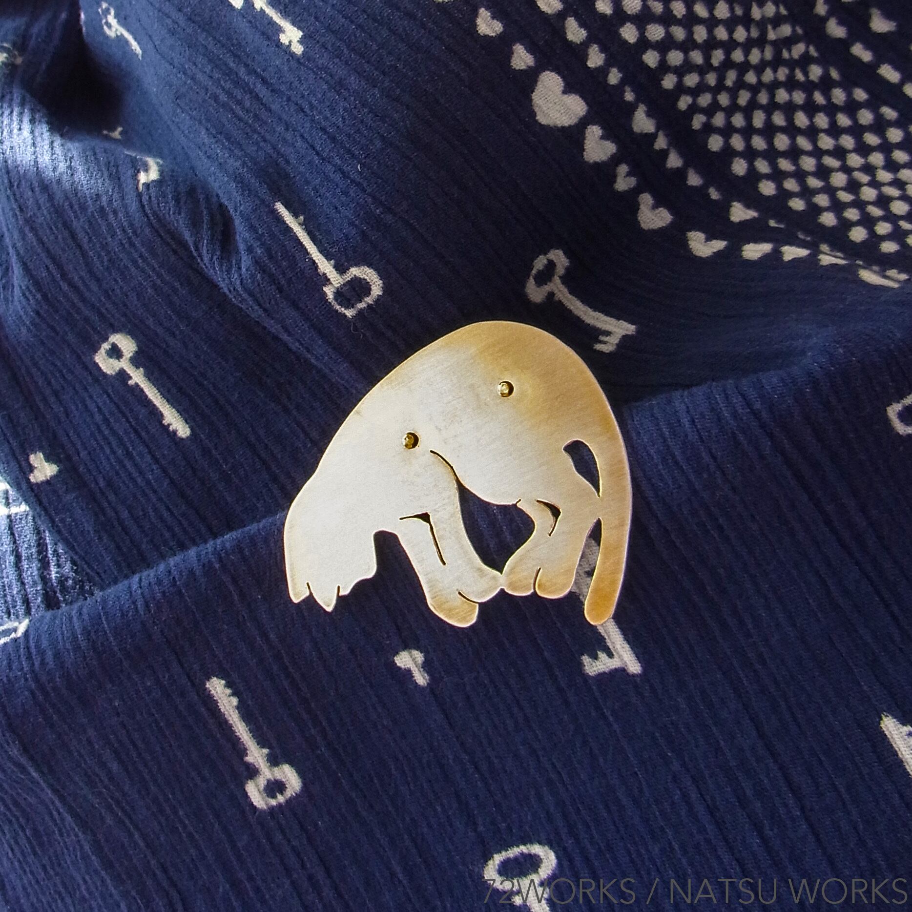 薄めの真鍮板とロック機能付きのブローチピンで仕立てました。