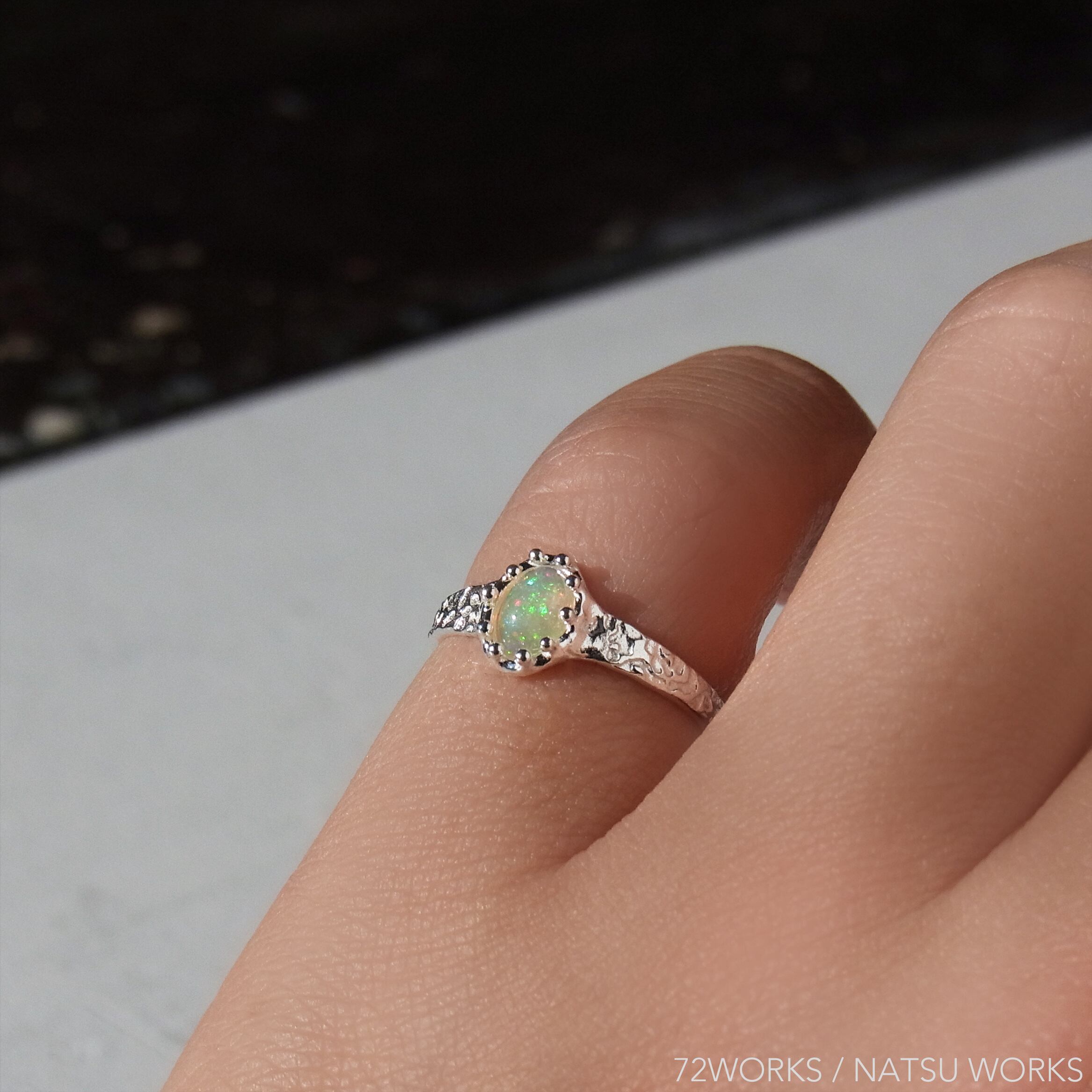 小さな石の中に細かな遊色が輝く、エチオピア産オパールを使用したリング。
