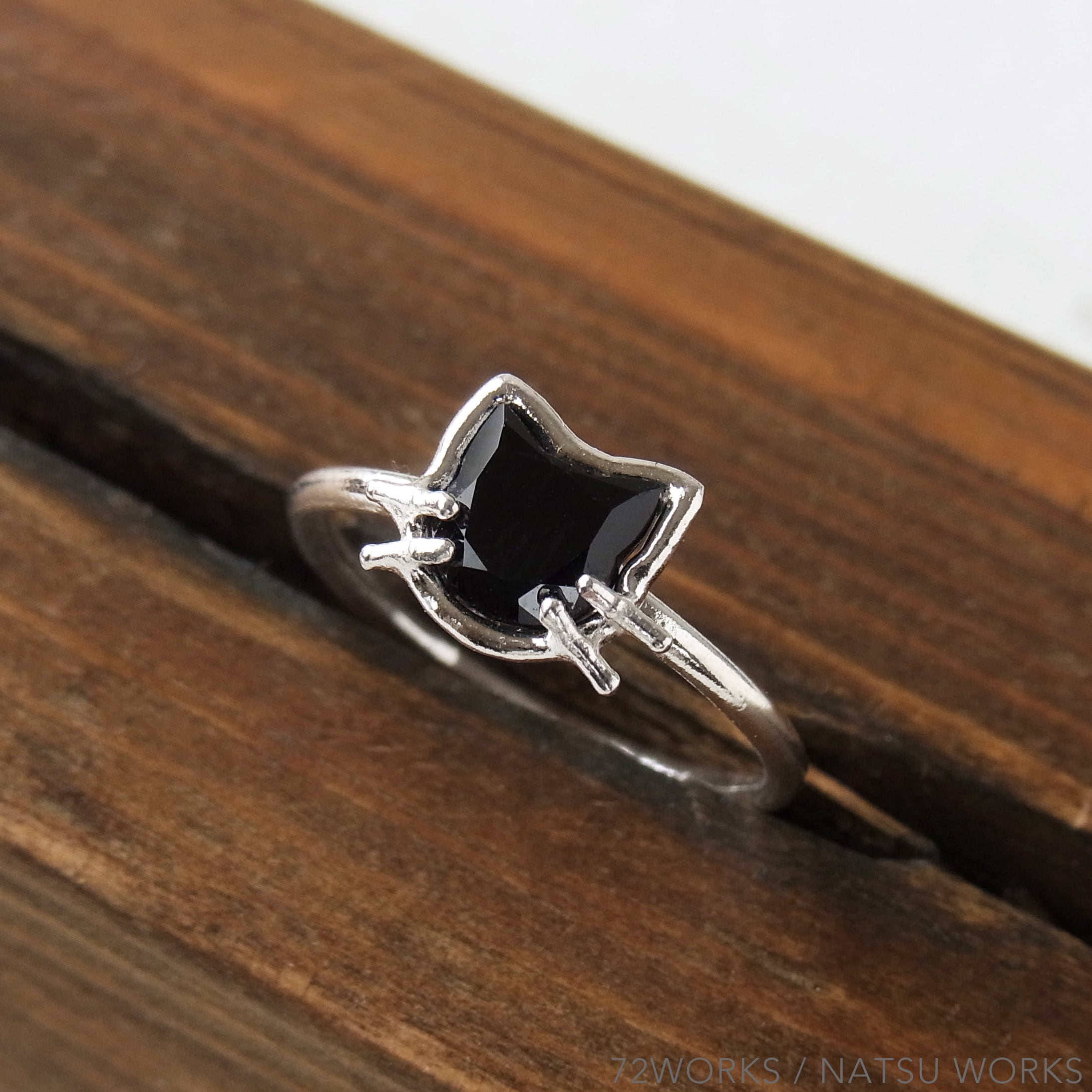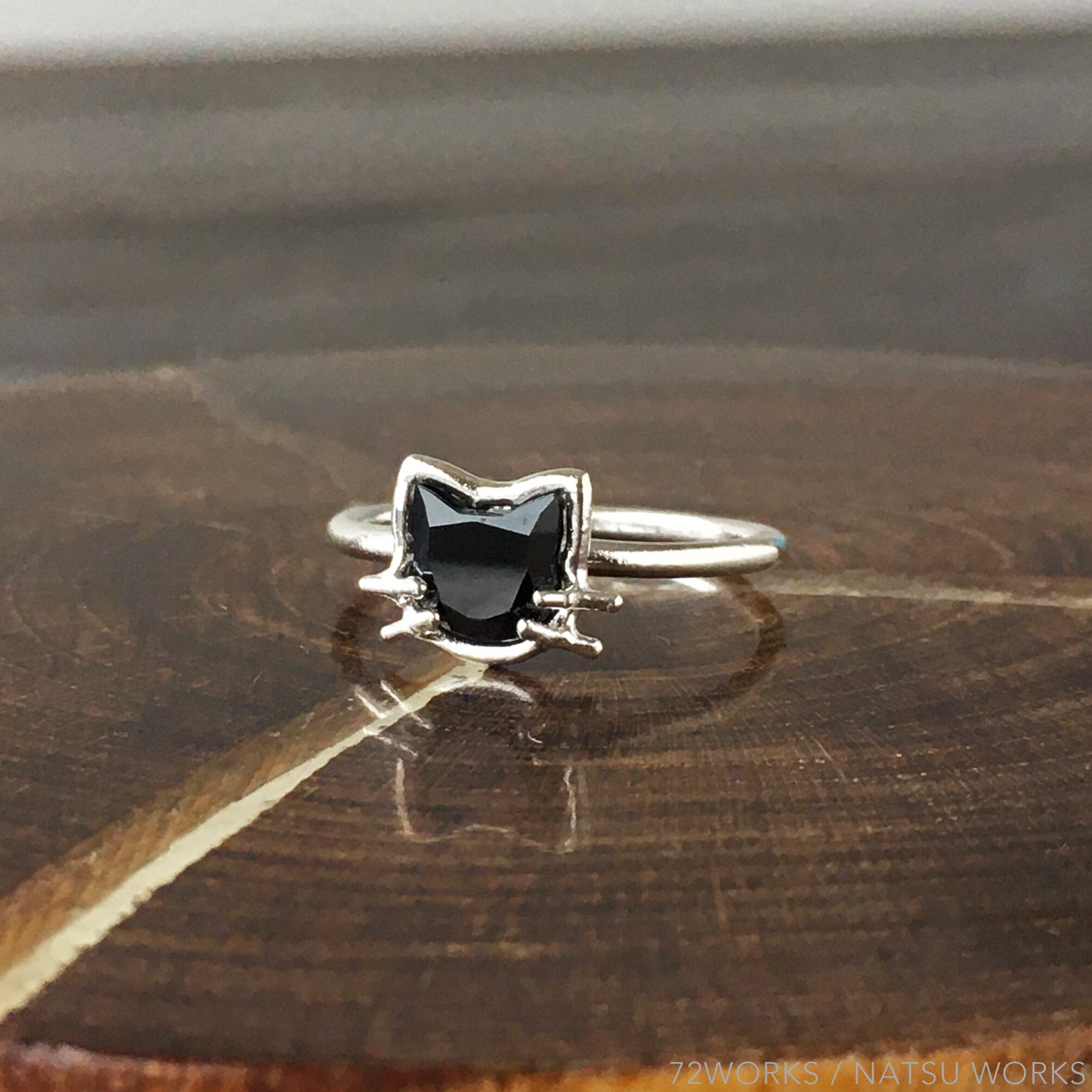猫の顔の形にカットされた、ブラック スピネルを使用したリング。