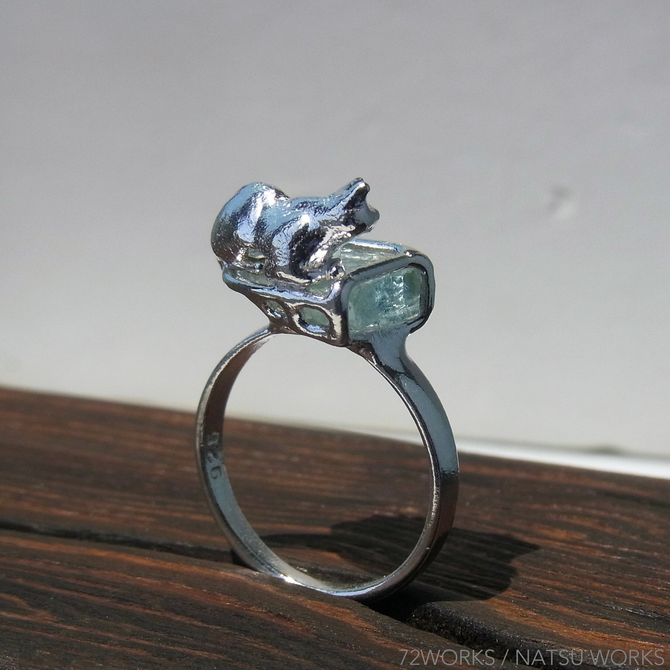 アクアマリンの原石に乗ってしまったネコ、のリング。