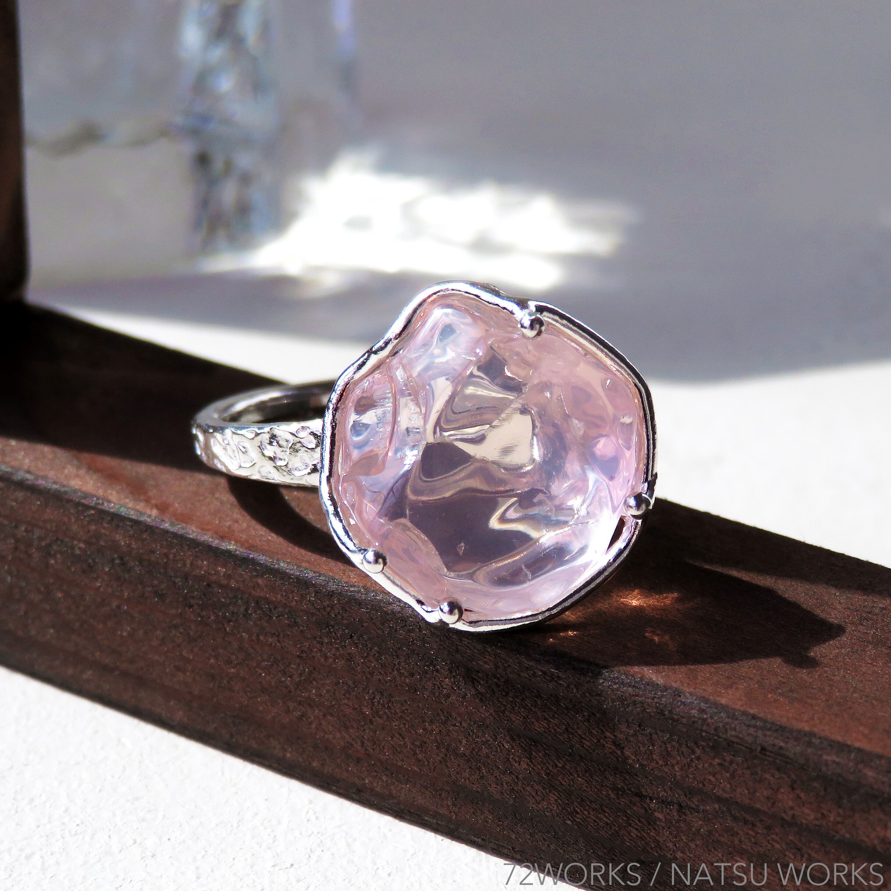 表面がツルリと磨かれた、ローズクォーツの原石を使用したリング。