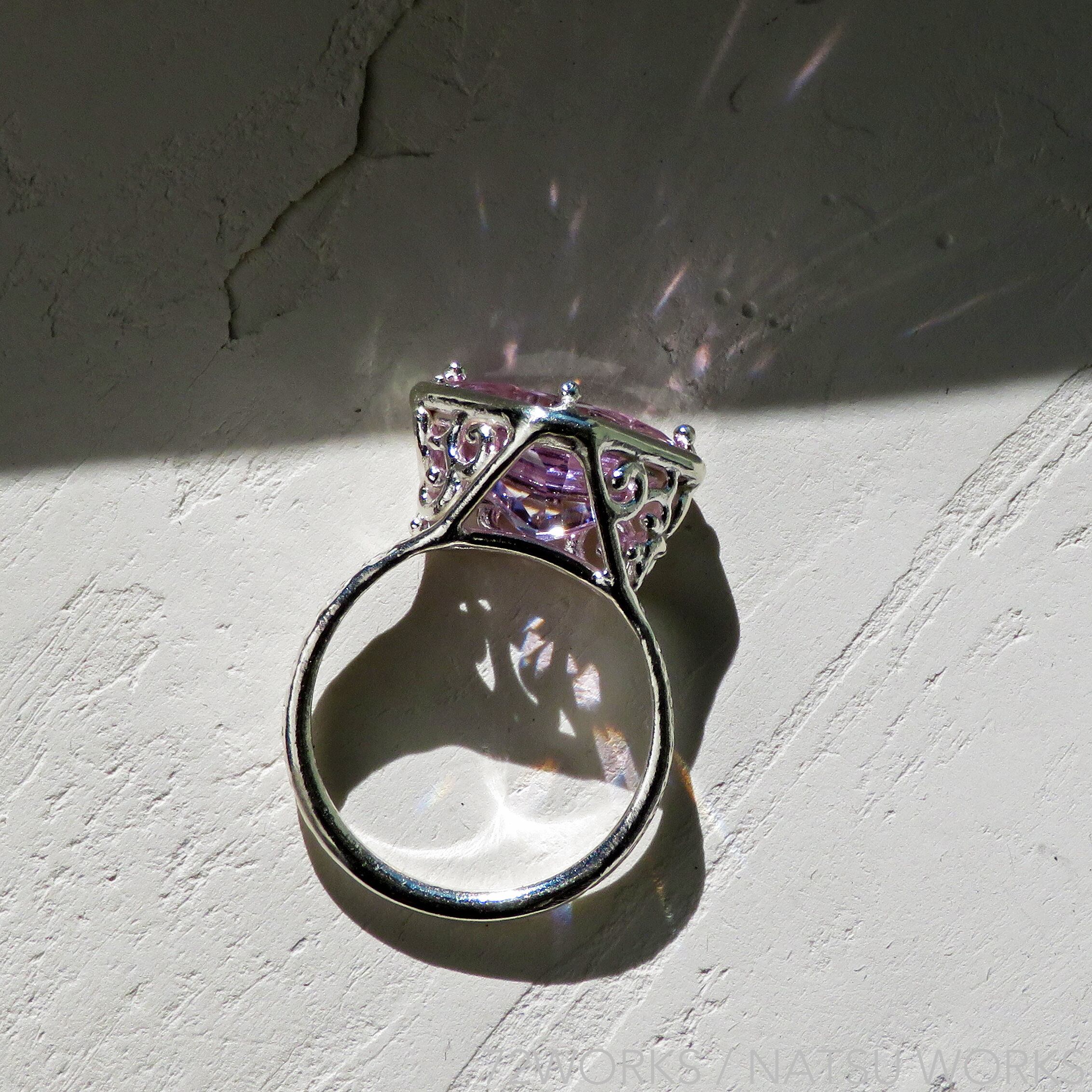 遊び心溢れる三角形のカットが施された、クンツァイトを使用したリング。