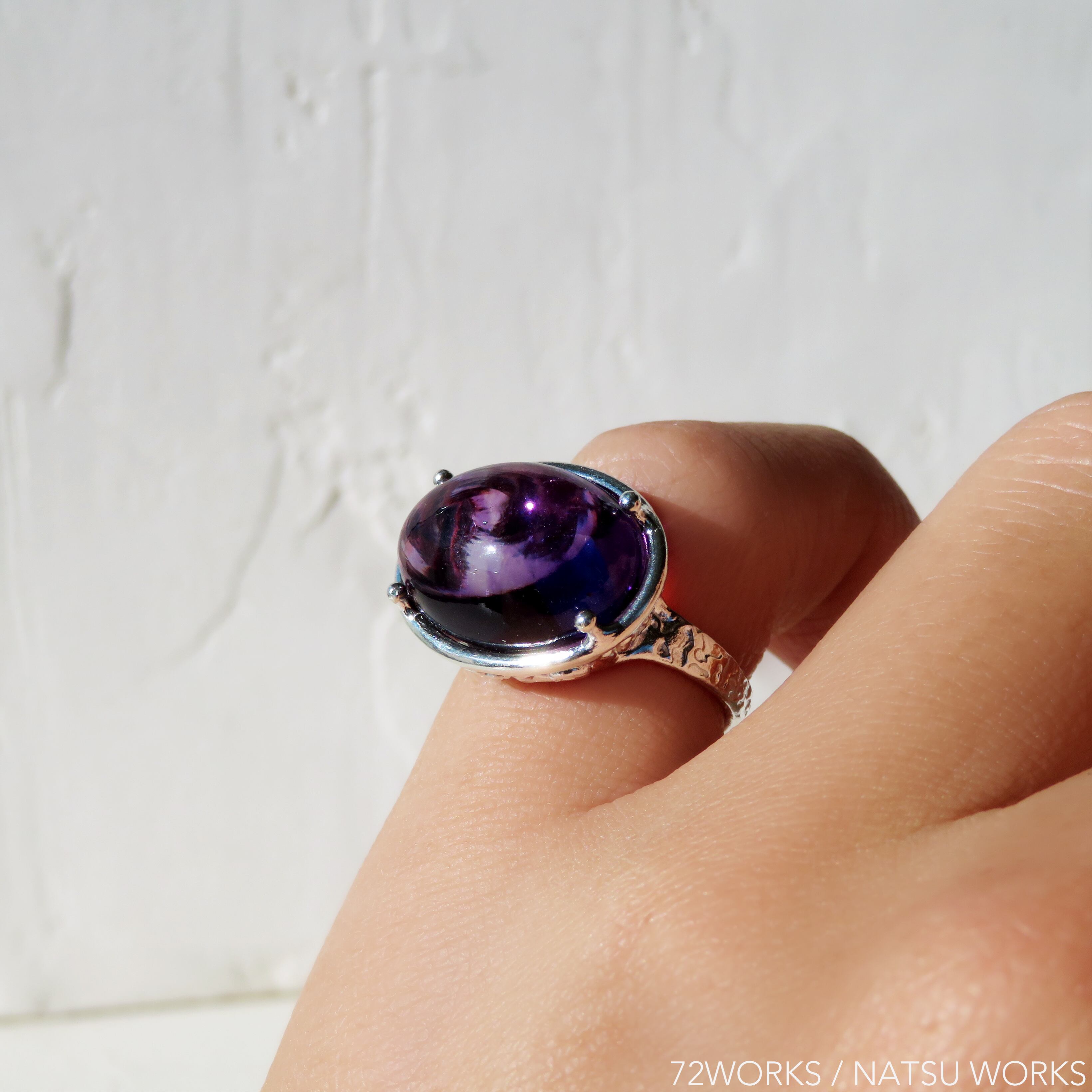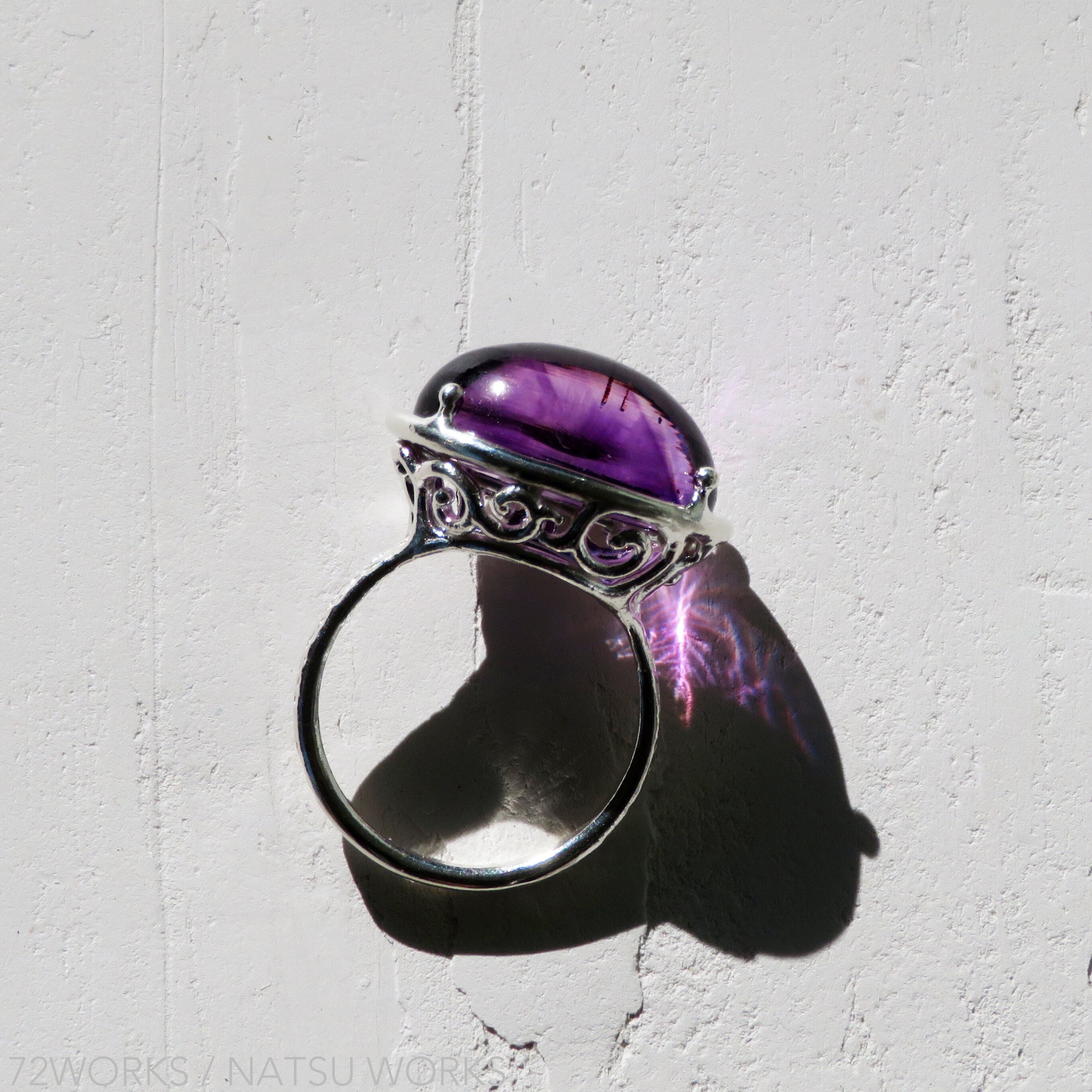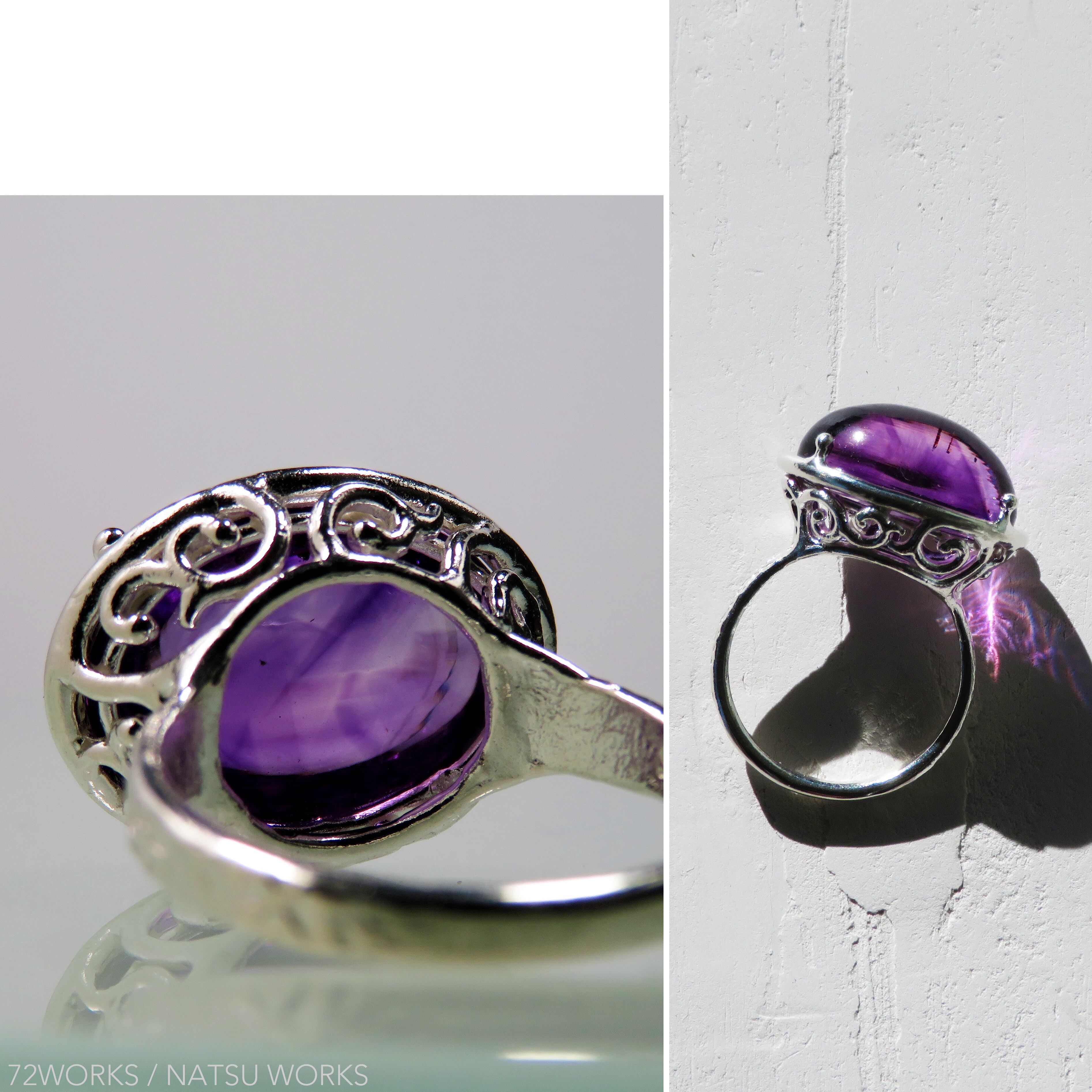 パープルとクリア2色のバイカラーが魅力的な石に、シンプルなレリーフの台座を合わせました。