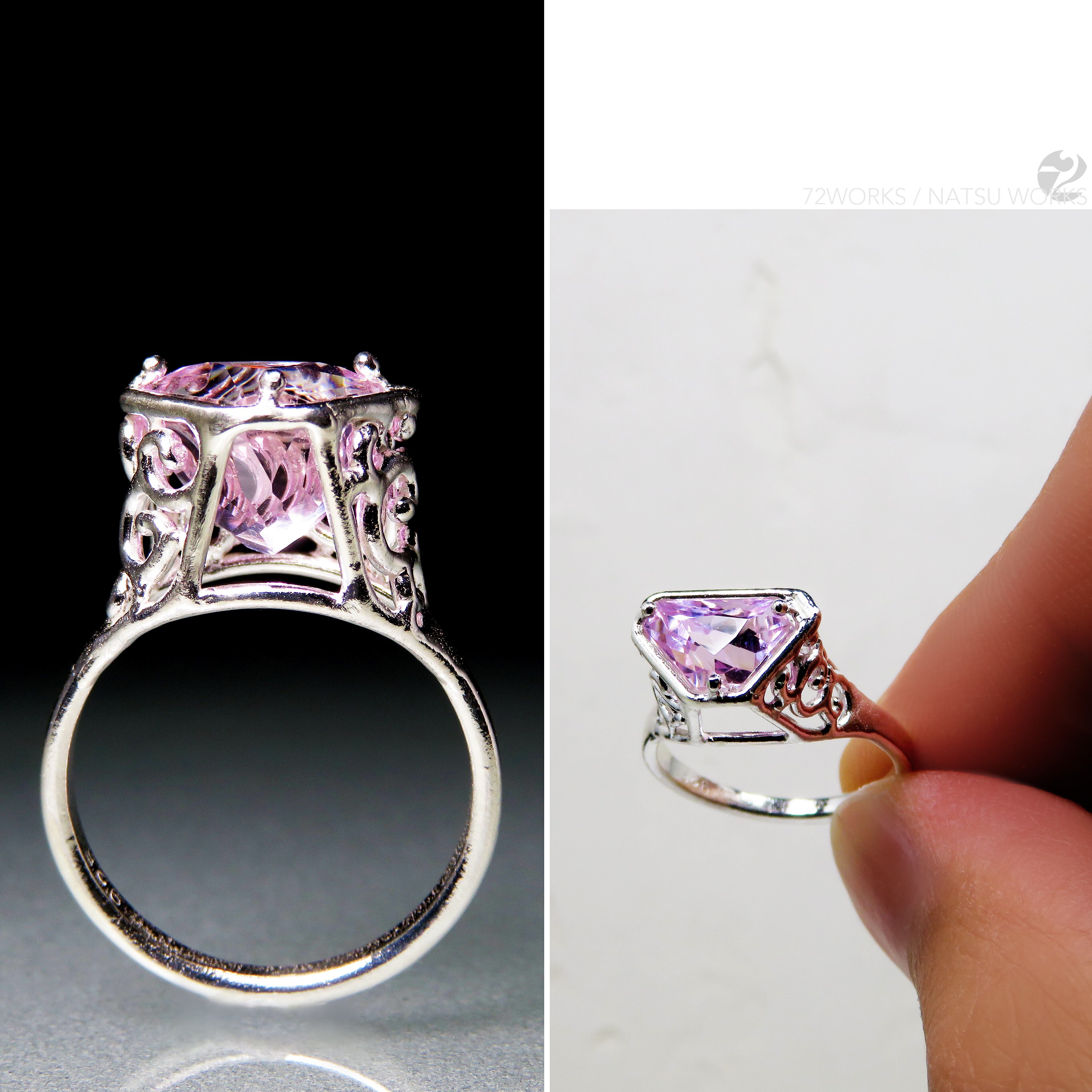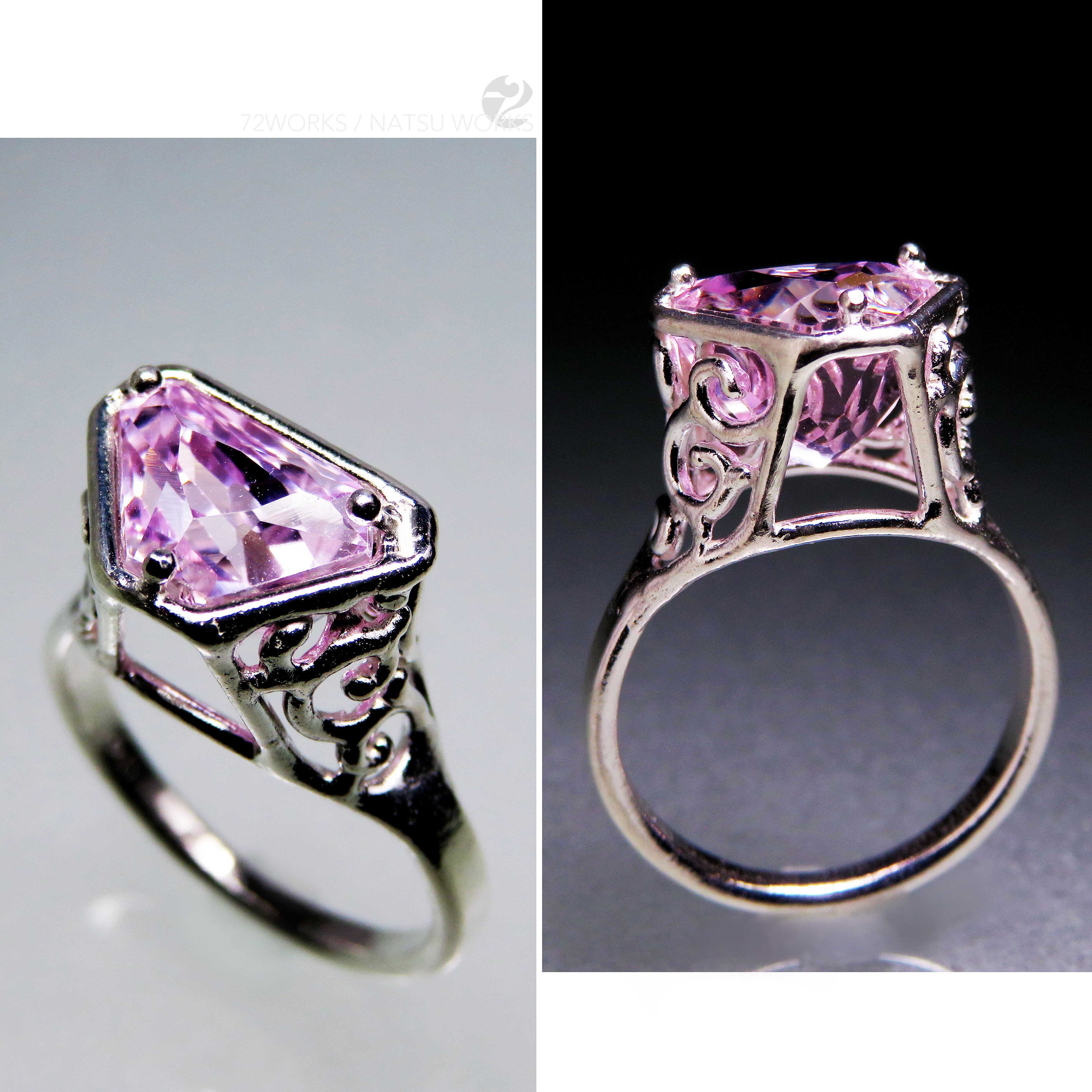 遊び心溢れる三角形のカットが施された、クンツァイトを使用したリング。