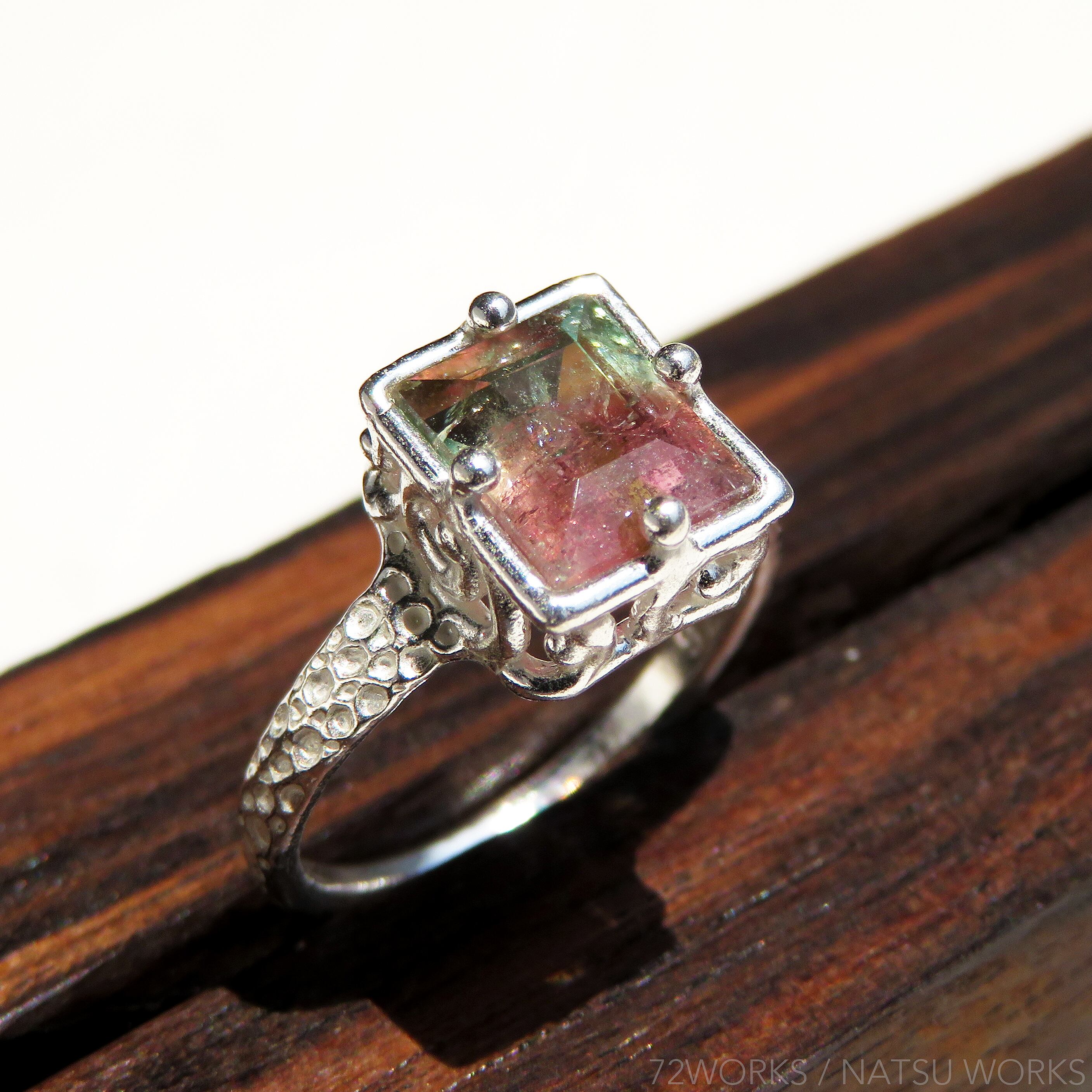 カラフルに輝くこの石を、シンプルな透かし模様にセッティングしました。