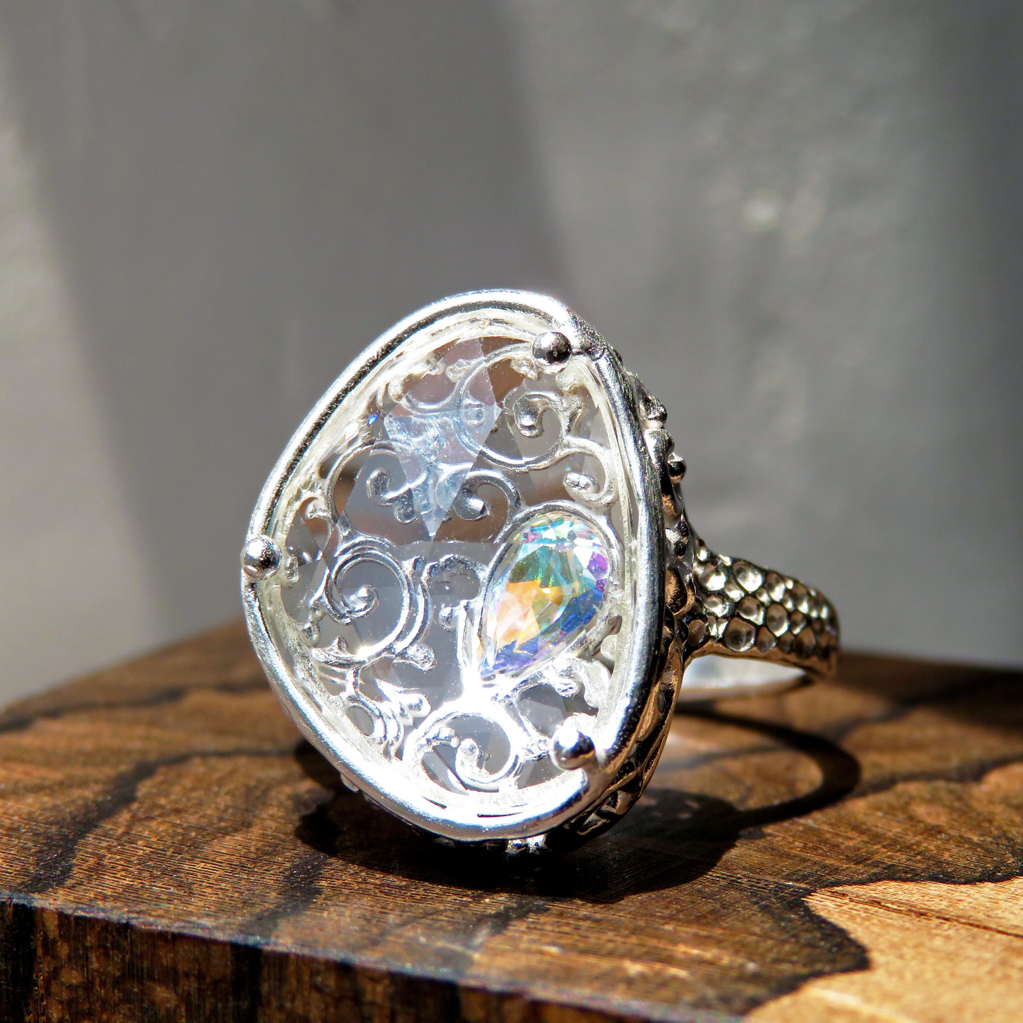 しずく型のミスティック・トパーズをローズカットの水晶でとじこめて、ボタニカルな模様で飾りました。