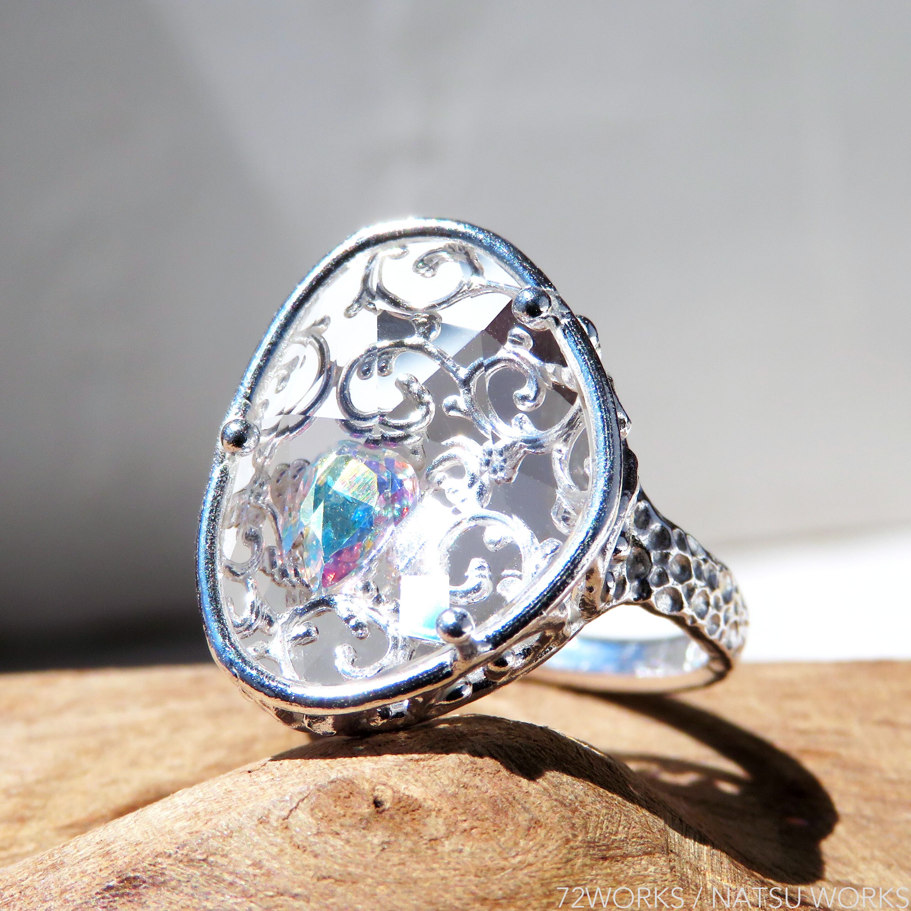 しずく型のミスティック・トパーズをローズカットの水晶でとじこめて、ボタニカルな模様で飾りました。
