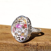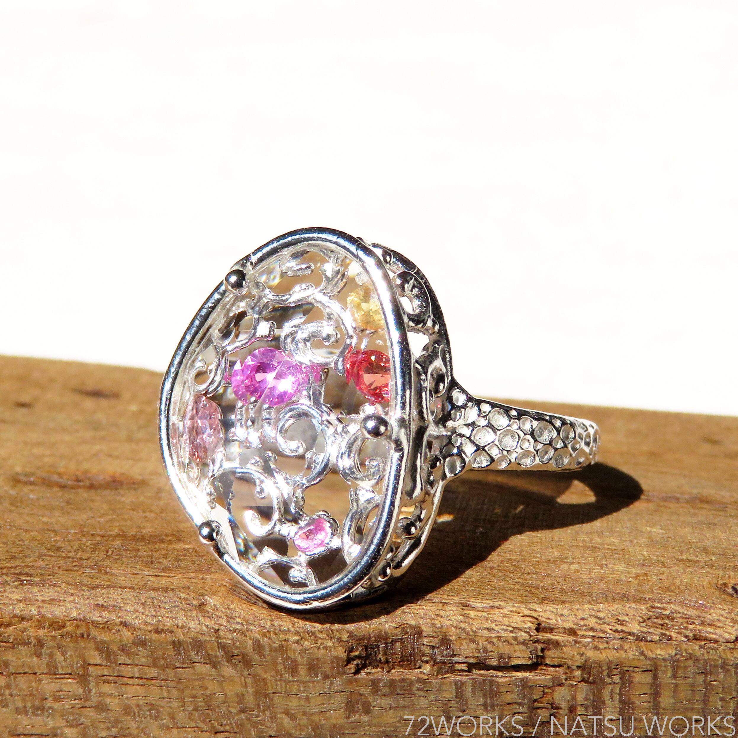 5石のマルチカラー・サファイアを水晶でとじこめて、ボタニカルな模様で飾りました。