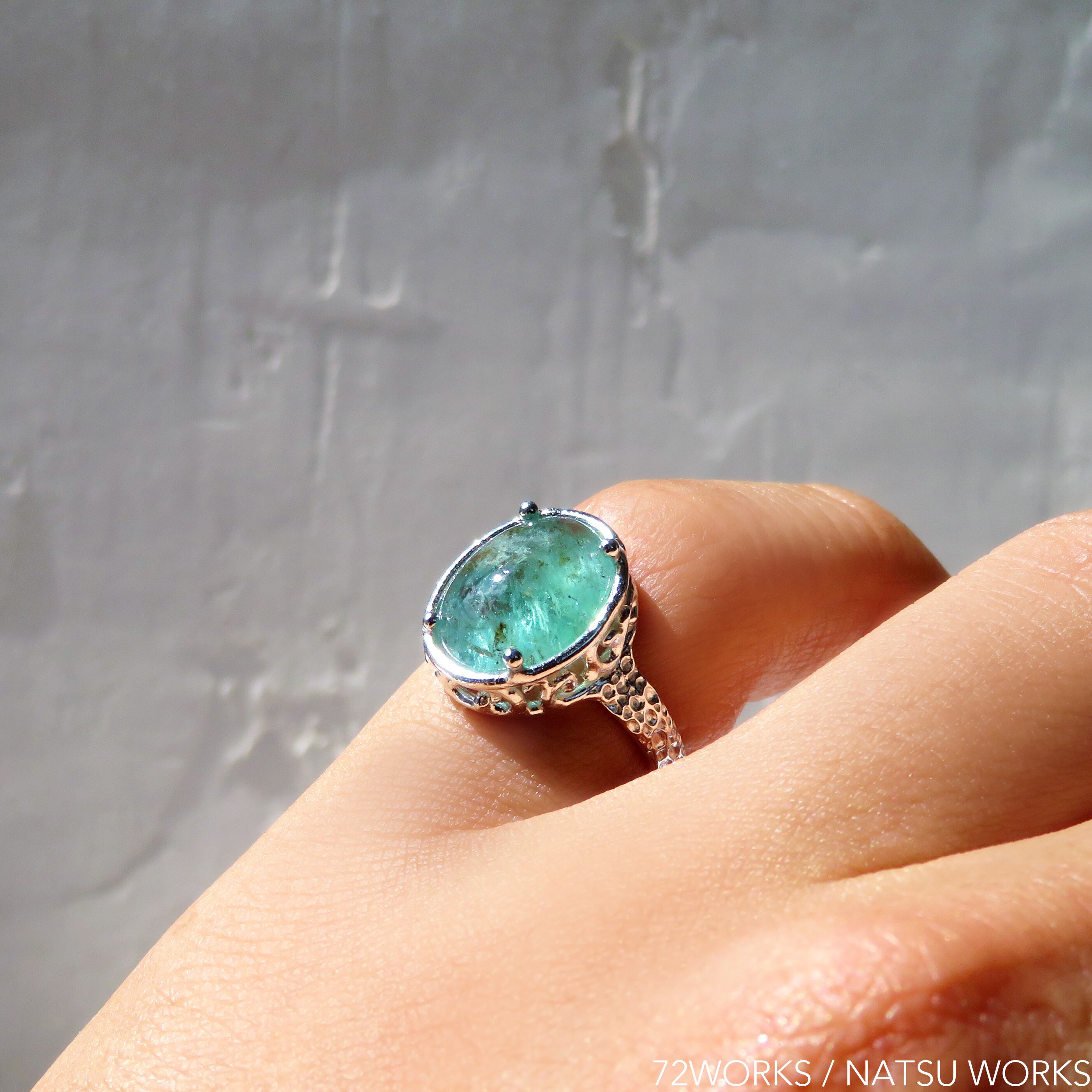 やさしいグリーンの天然石を、透かし模様の台座にセットしました。