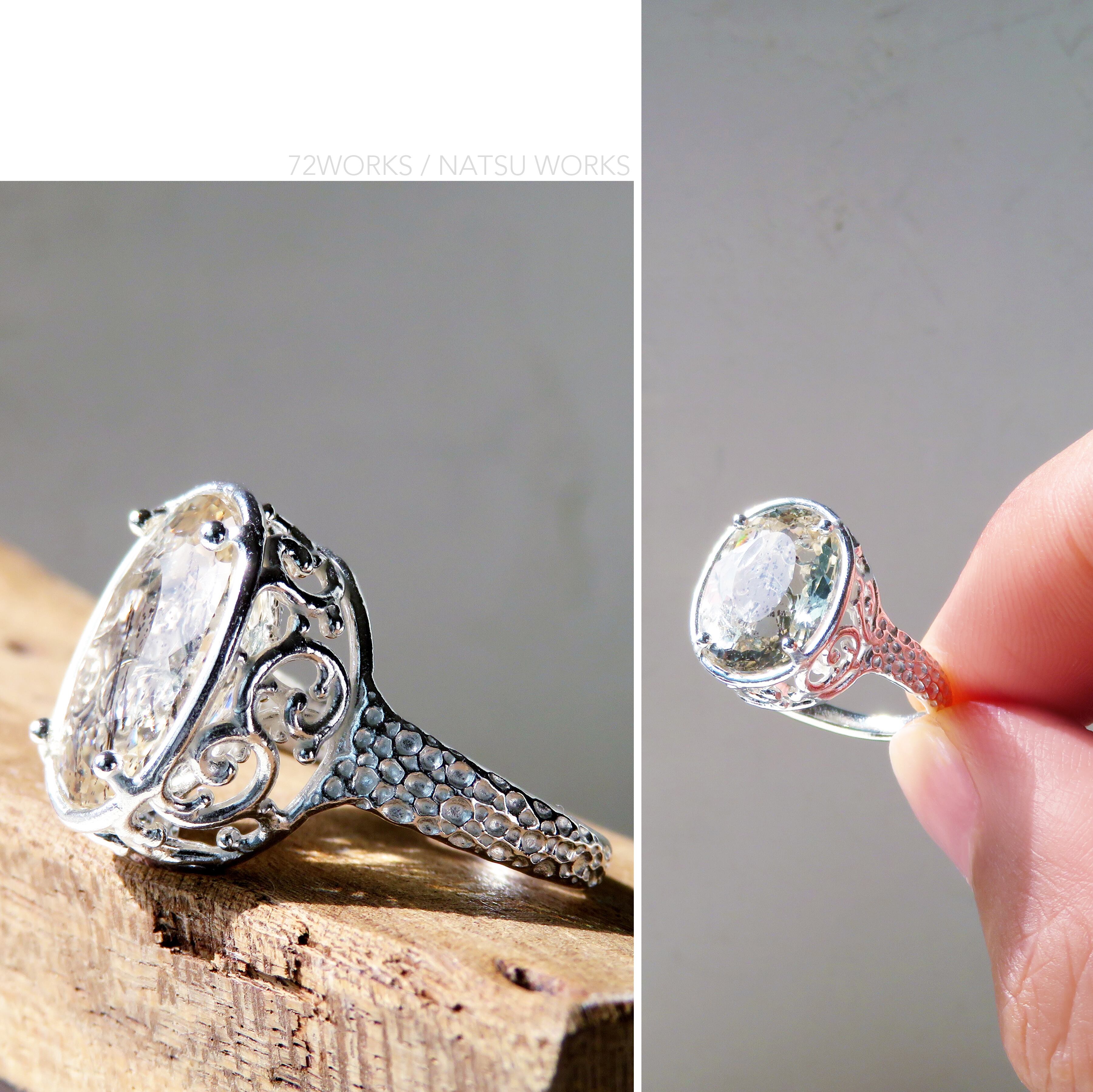 特有の透明度と輝きをもつ石を、透かし模様の台座にセットしました。