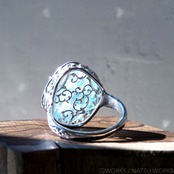 ローズカットが施された明るいブルーの石を、透かし模様の台座にセッティングしました。