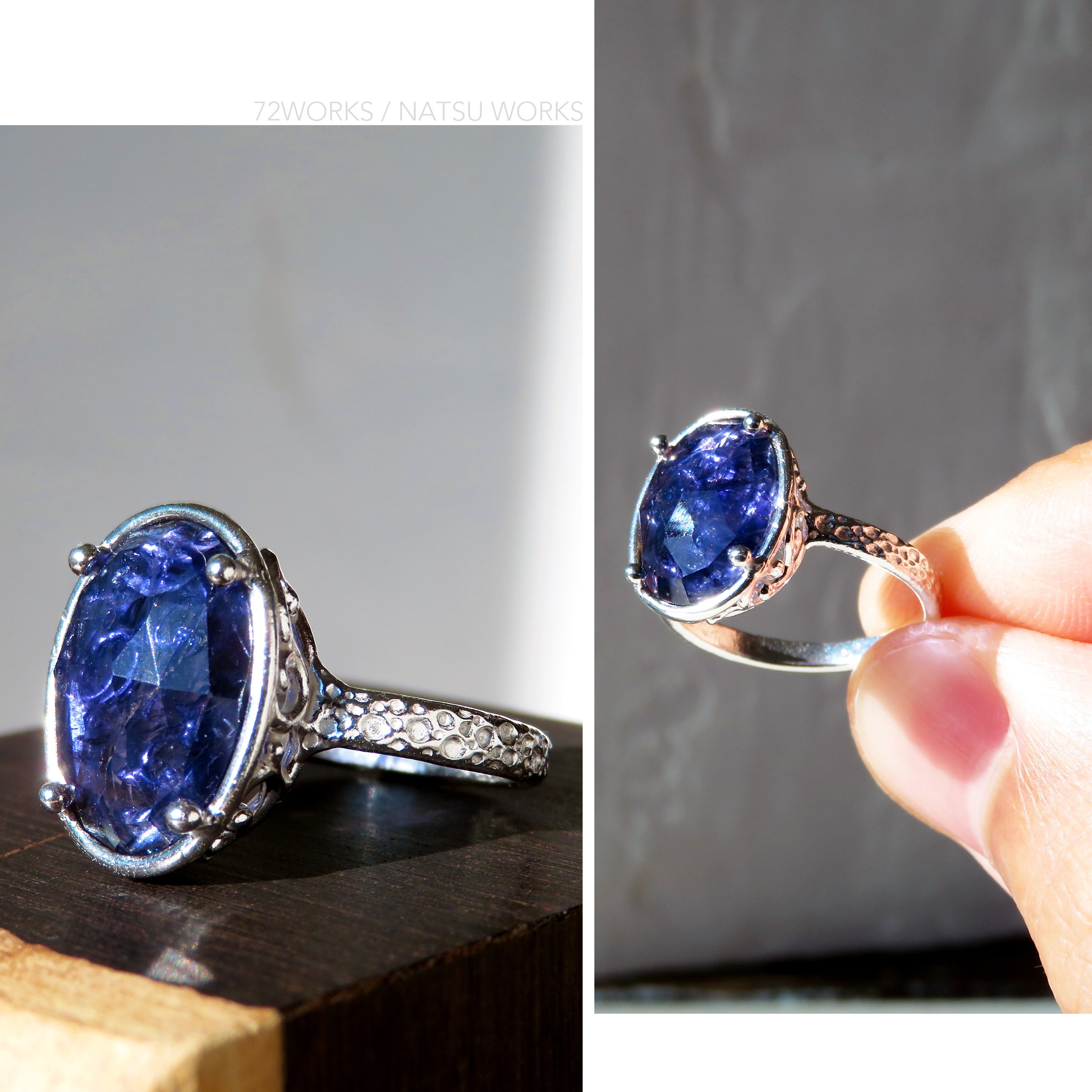独特なブルーが映えるローズカットのアイオライトを、透かし模様の台座にセッティングしました。