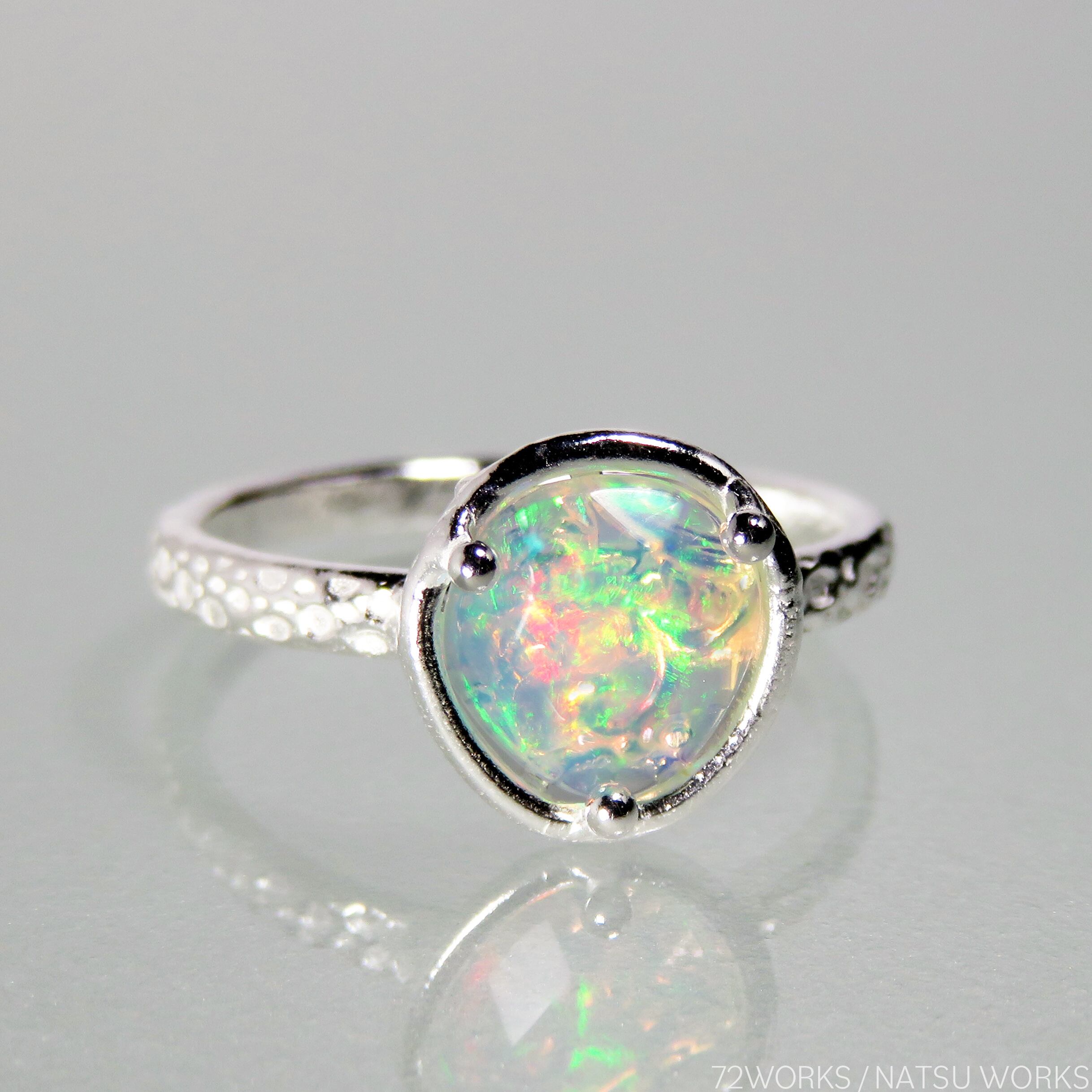 さまざまな表情と色彩が魅力的なオパールを、ボリュームを抑えたシンプルなリングに仕立てました。