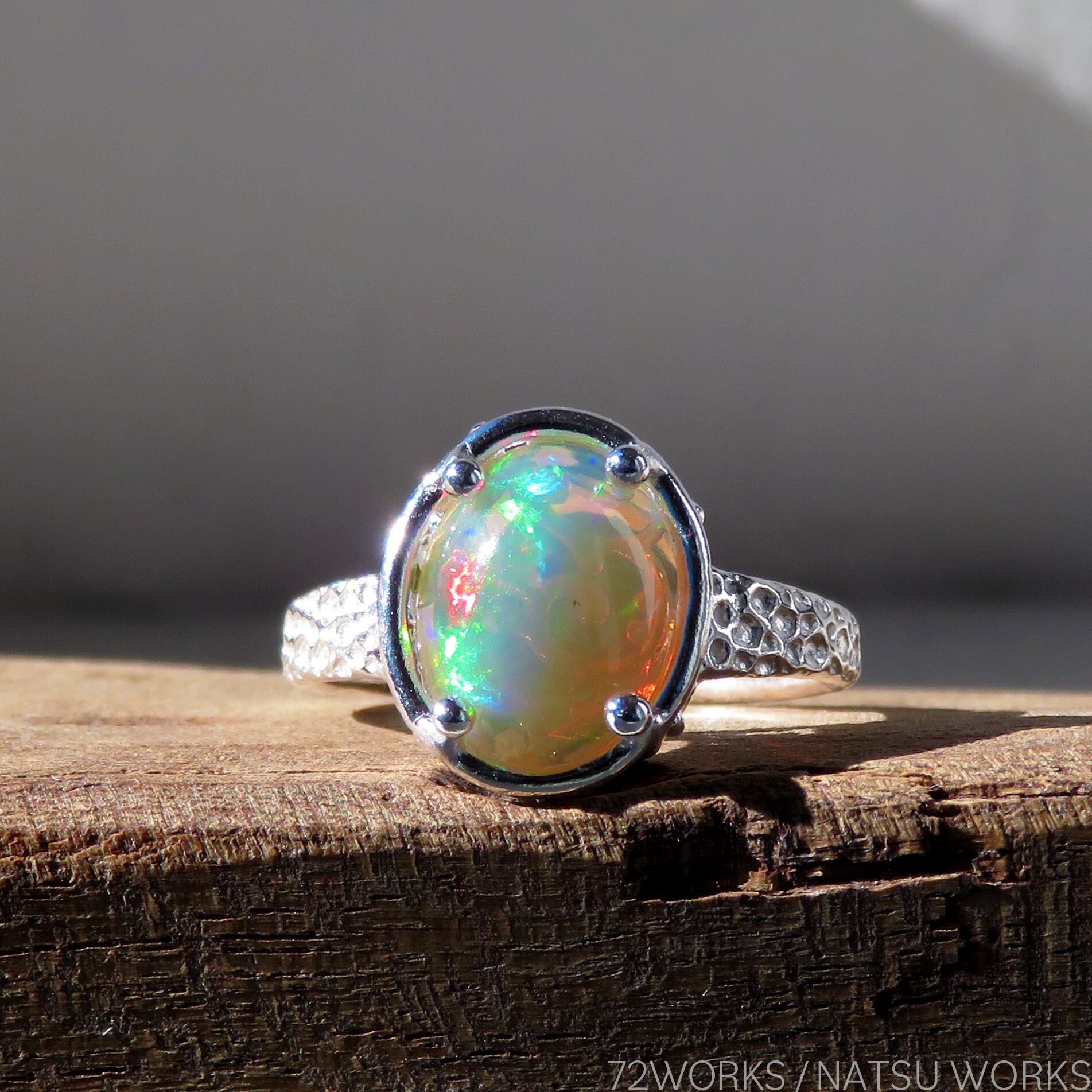 さまざまな表情と色彩が魅力的なオパールを、透かし模様の台座にセッティングしました。