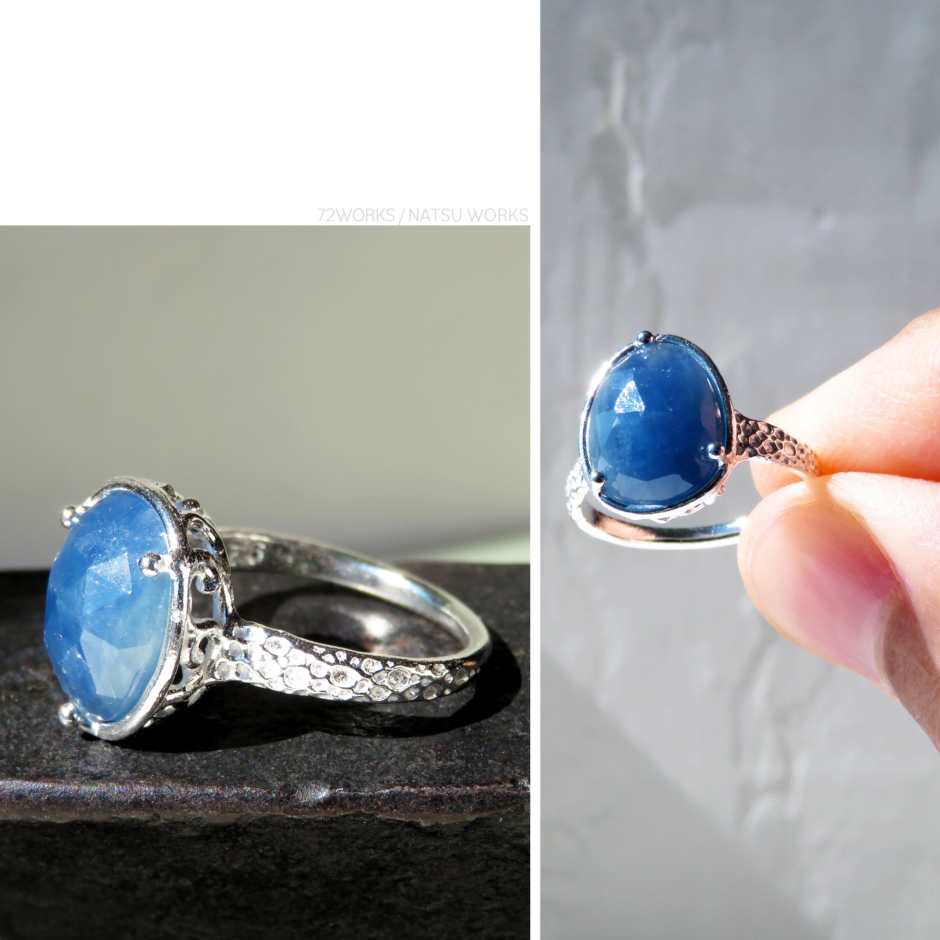 濃いめのブルーに輝く石を、透かし模様の台座にセットしました。