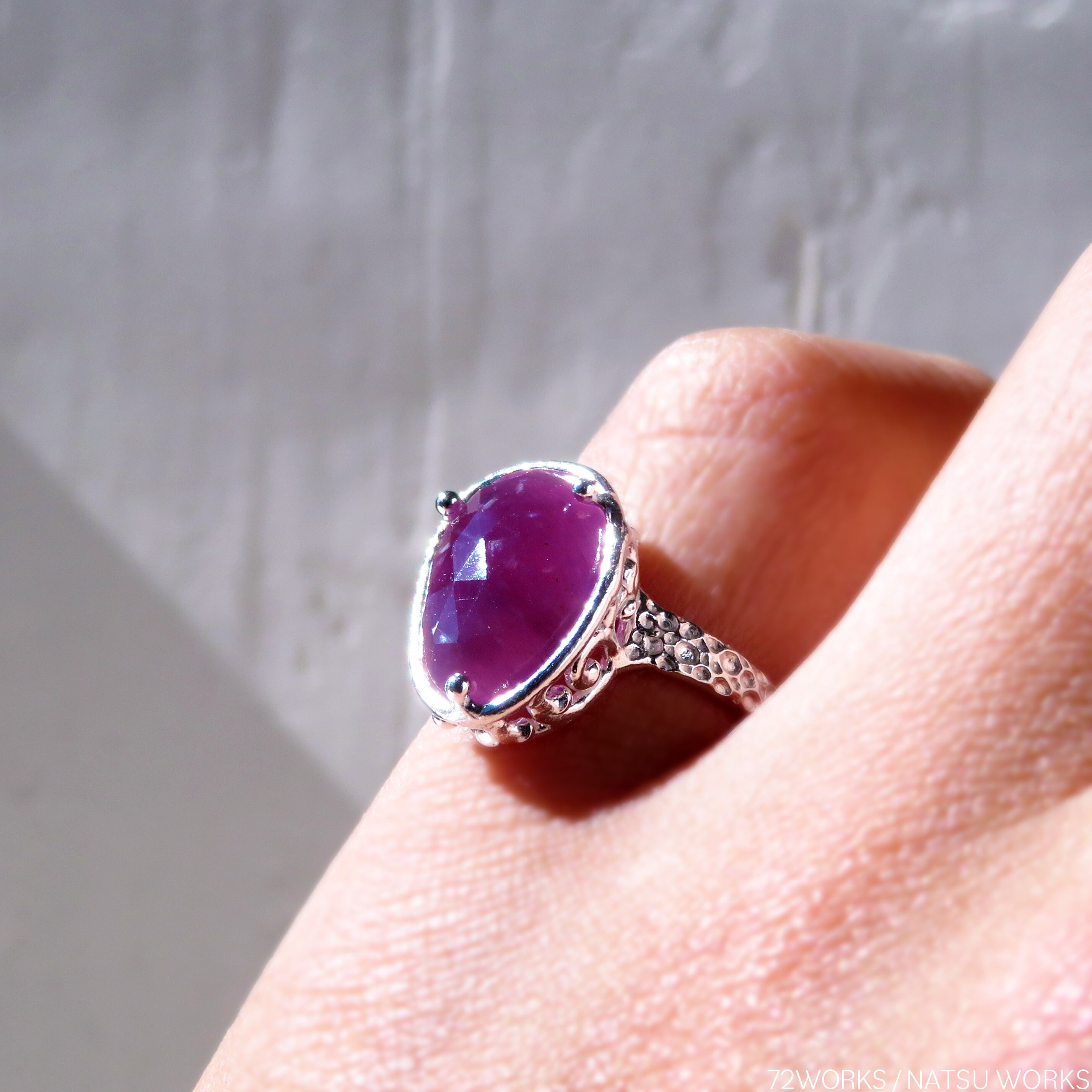 濃いめのピンクに輝く石を、透かし模様の台座にセットしました。