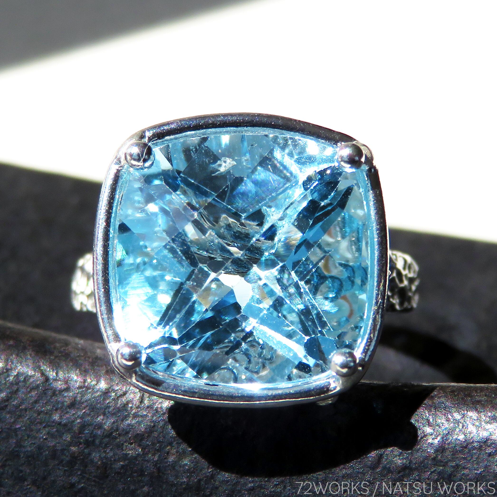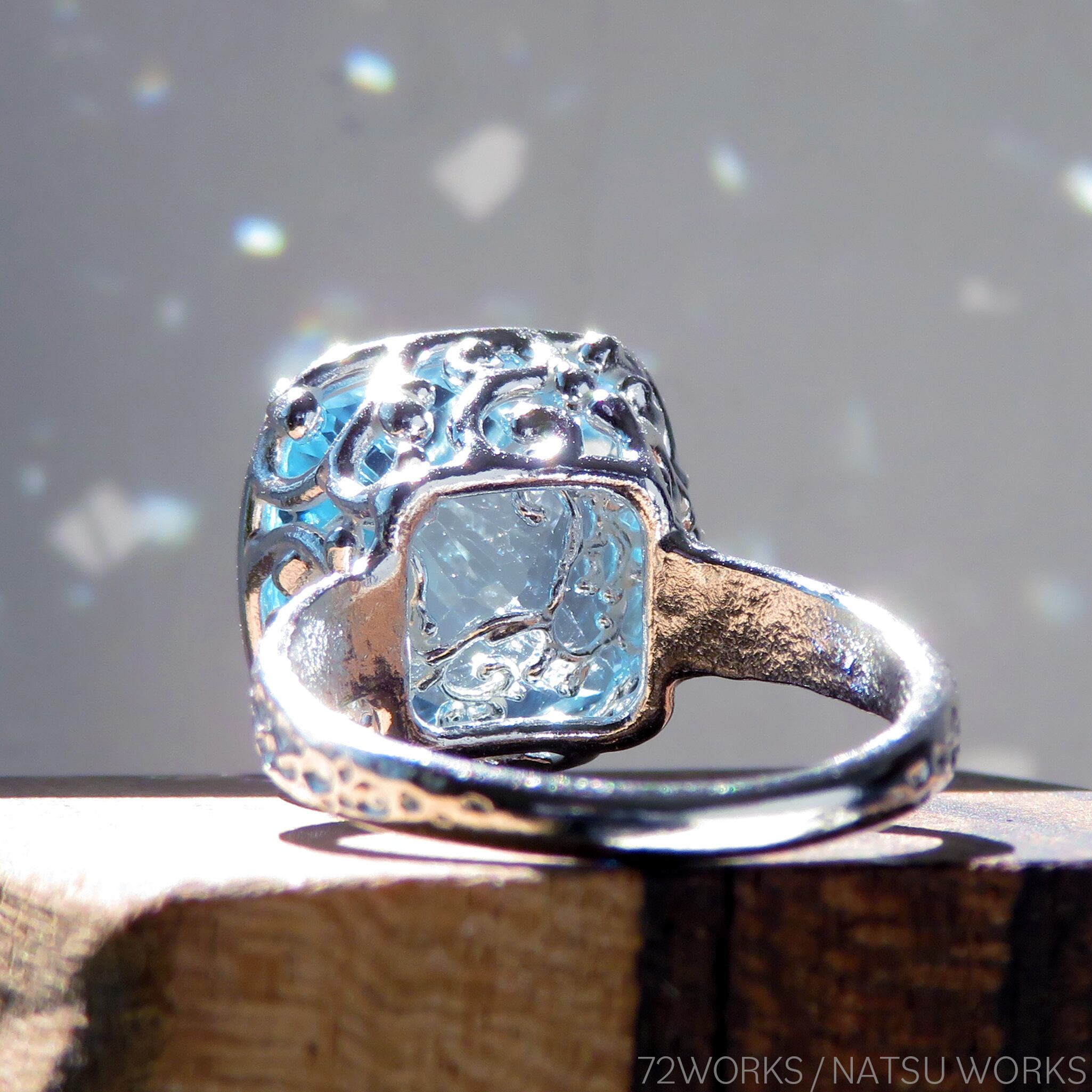 鮮やかなブルーがキラキラ輝くトパーズを、透かし模様の台座にセッティングしました。