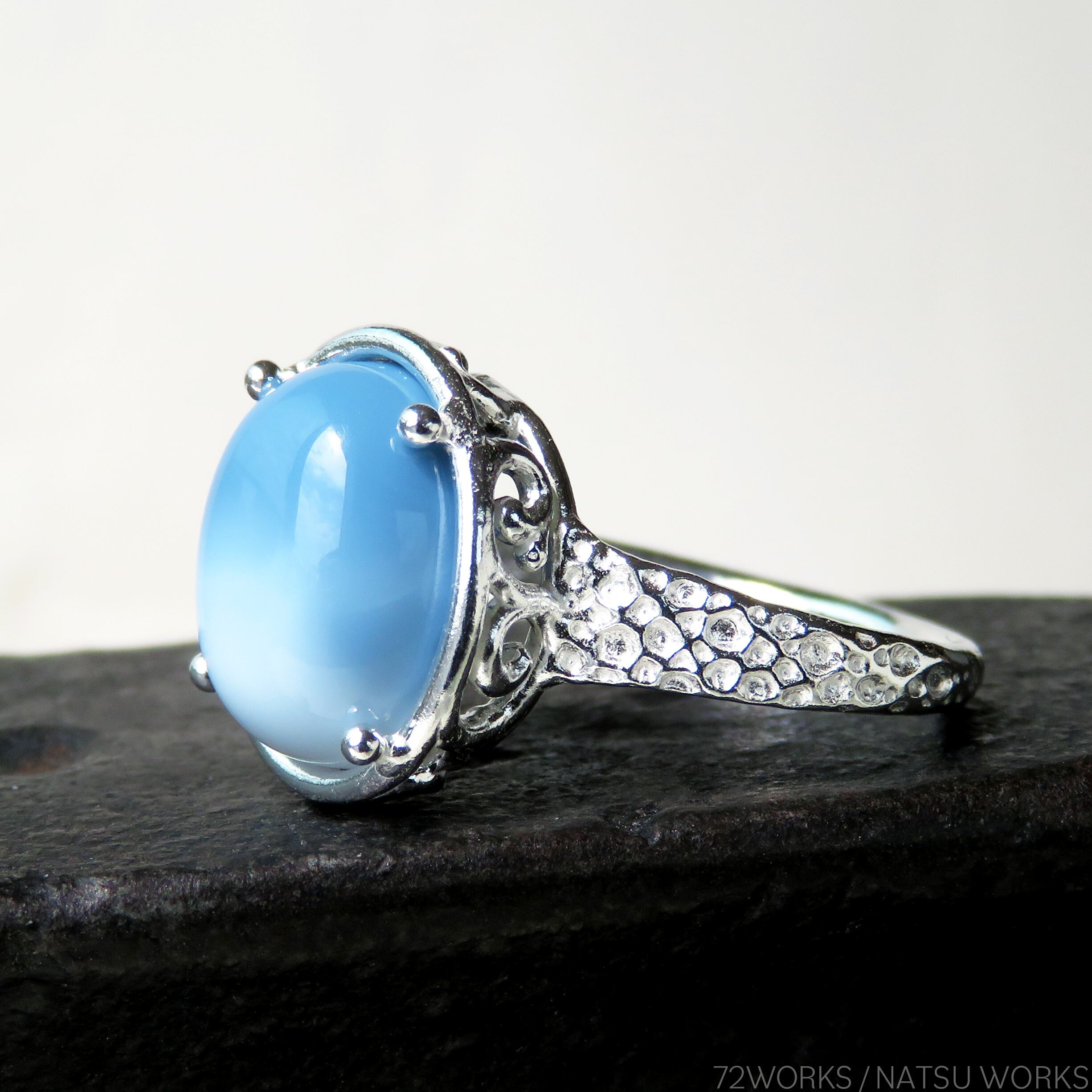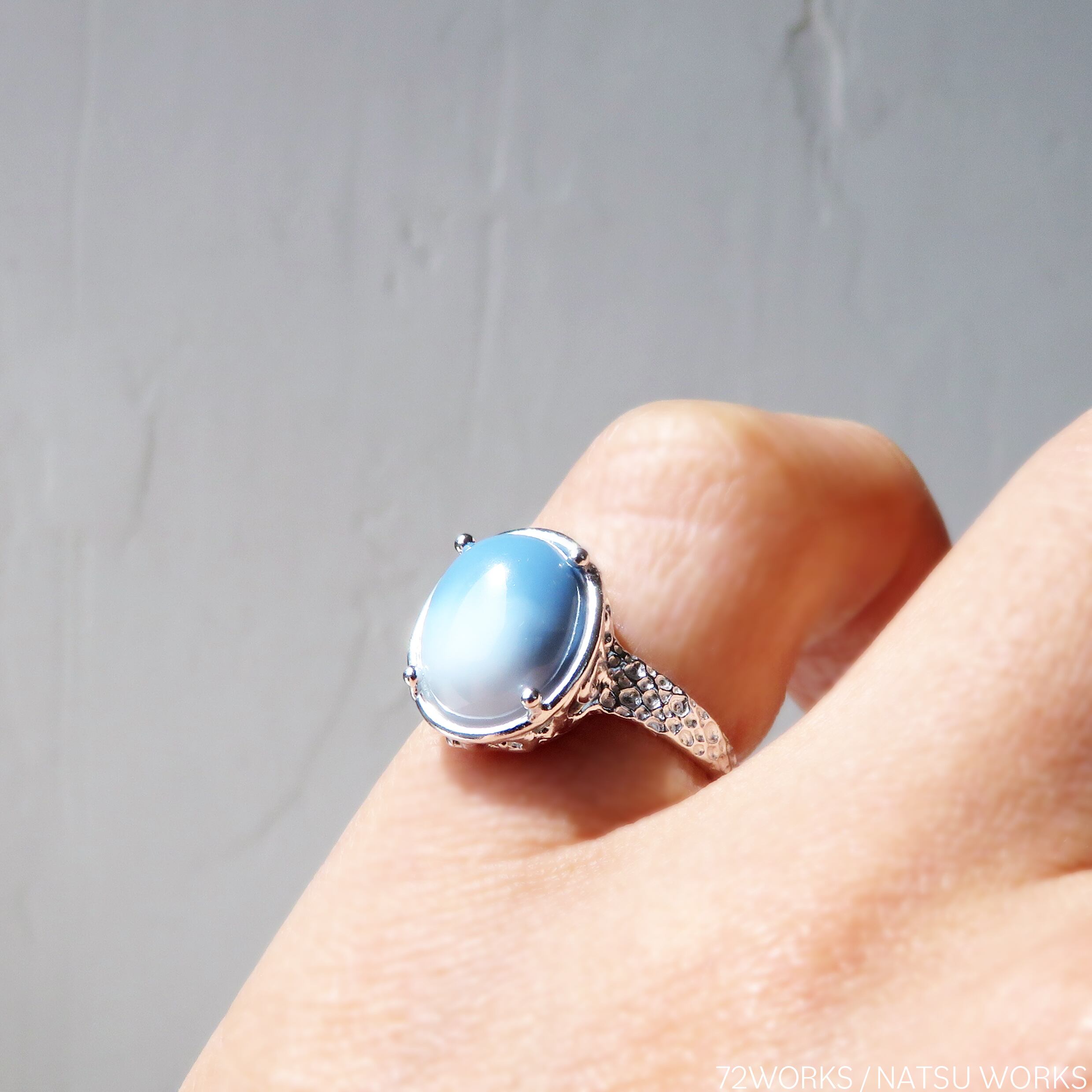 やさしいブルーのグラデーションが映える石を、透かし模様の台座にセッティングしました。