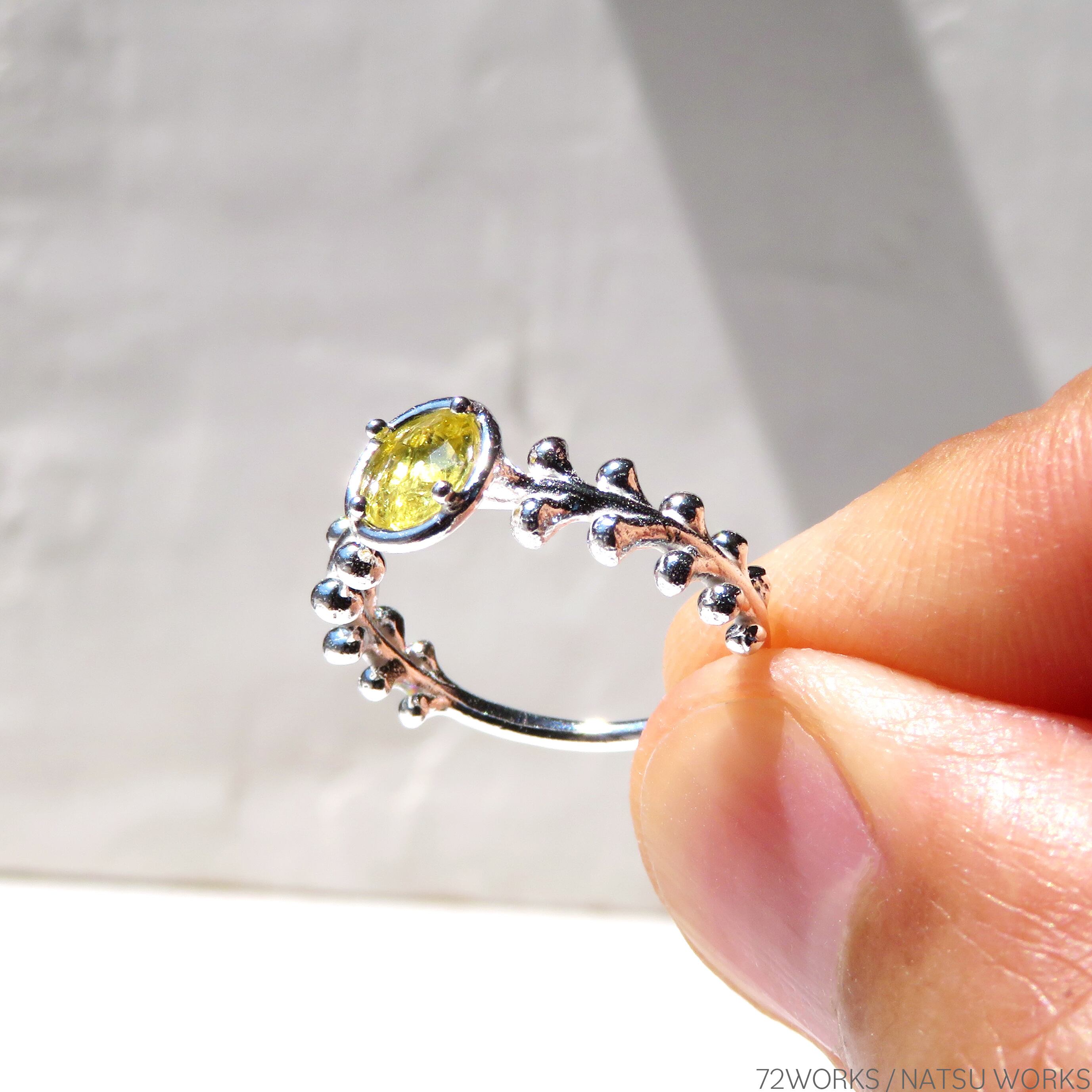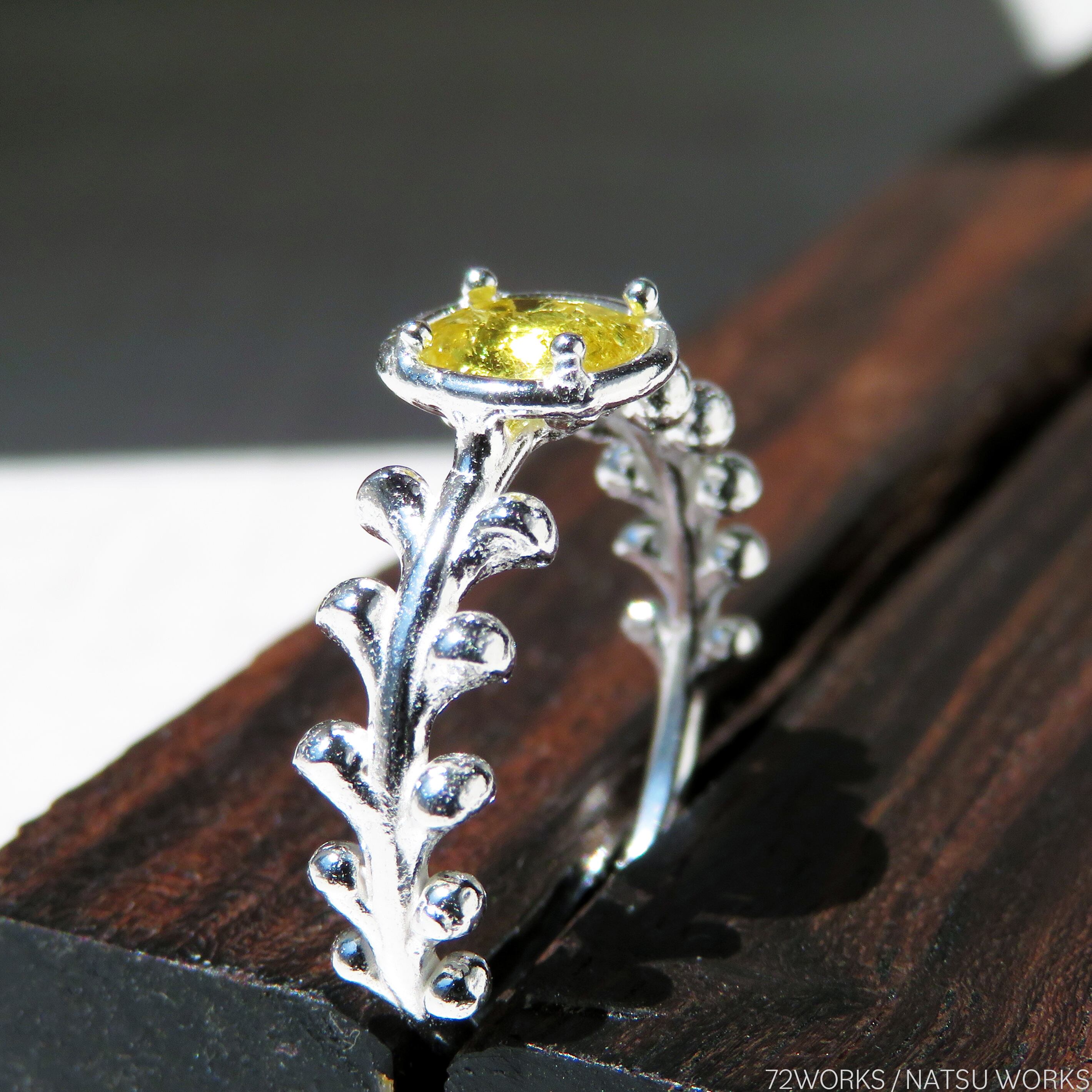 小さなイエローを、ボタニカルなイメージのリングにセッティングしました。