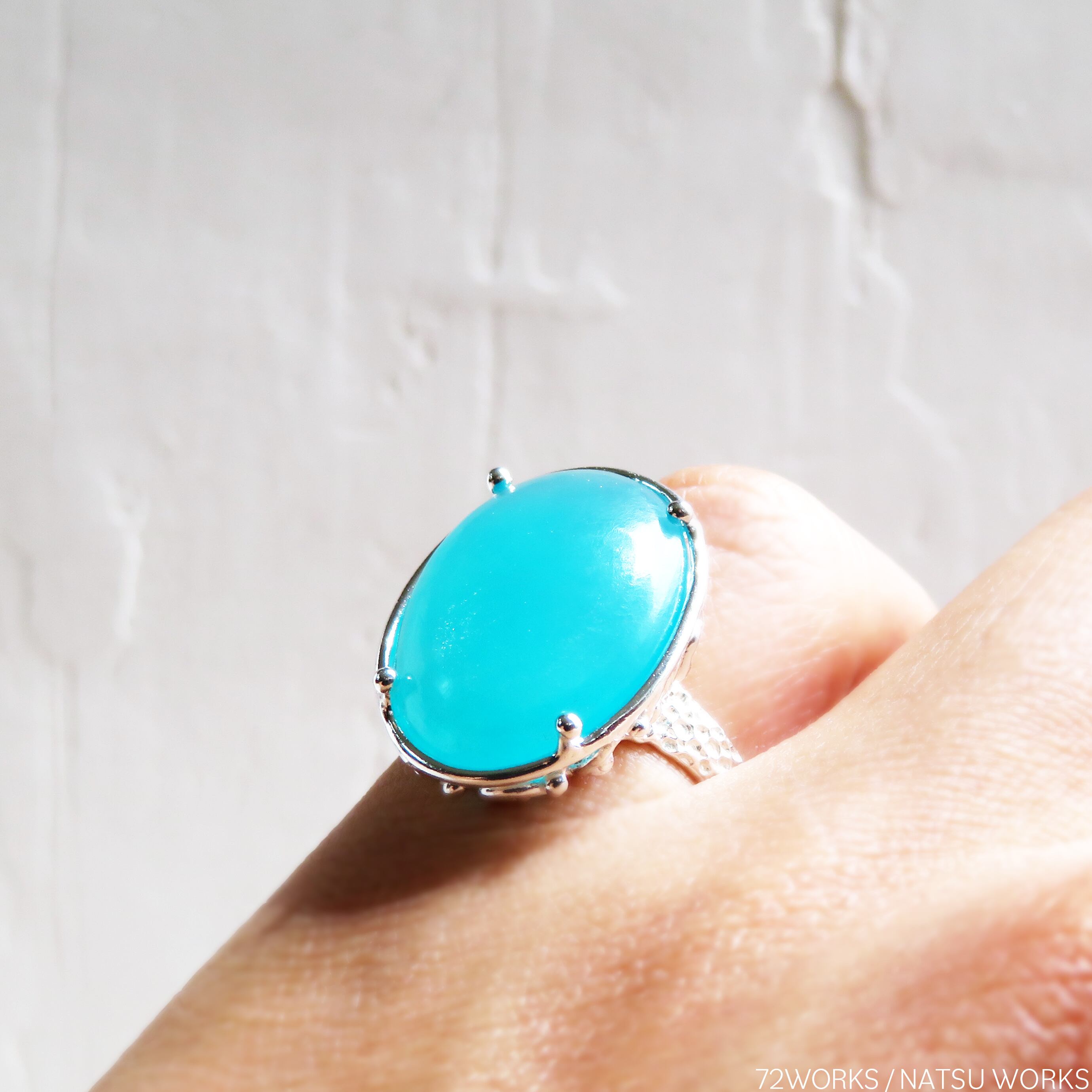 爽やかなブルーに淡いストライプが映えるアマゾナイトを、透かし模様の台座にセッティングしました。